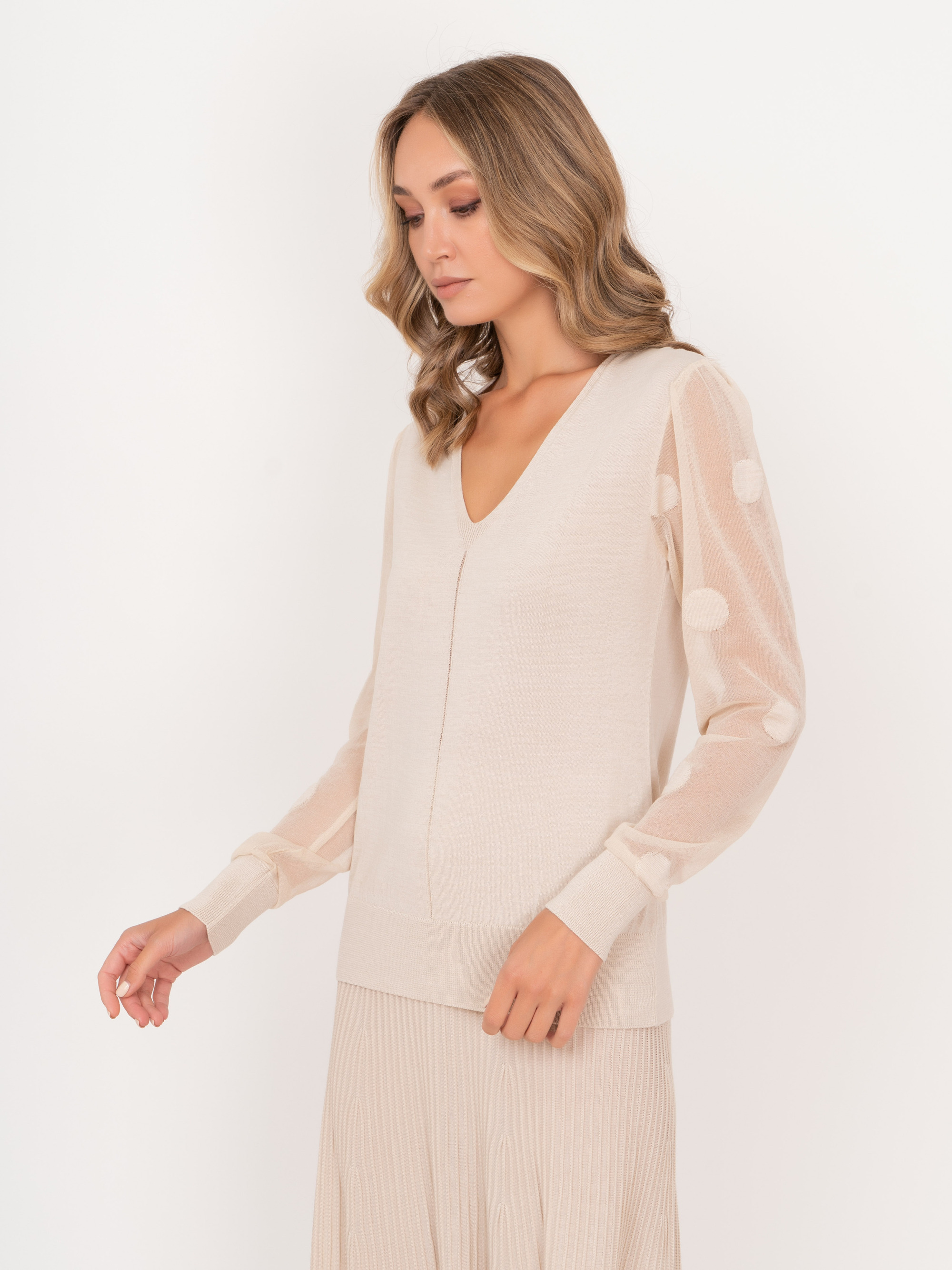 На сайте указаны российские размеры. Прямой трикотажный светло-бежевый джемпер с V-образным вырезом, с длинным прозрачным рукавом в крупный горох, с акцентной полосой по центру. Рост модели: 175 см. Длина джемпера: 60 см.