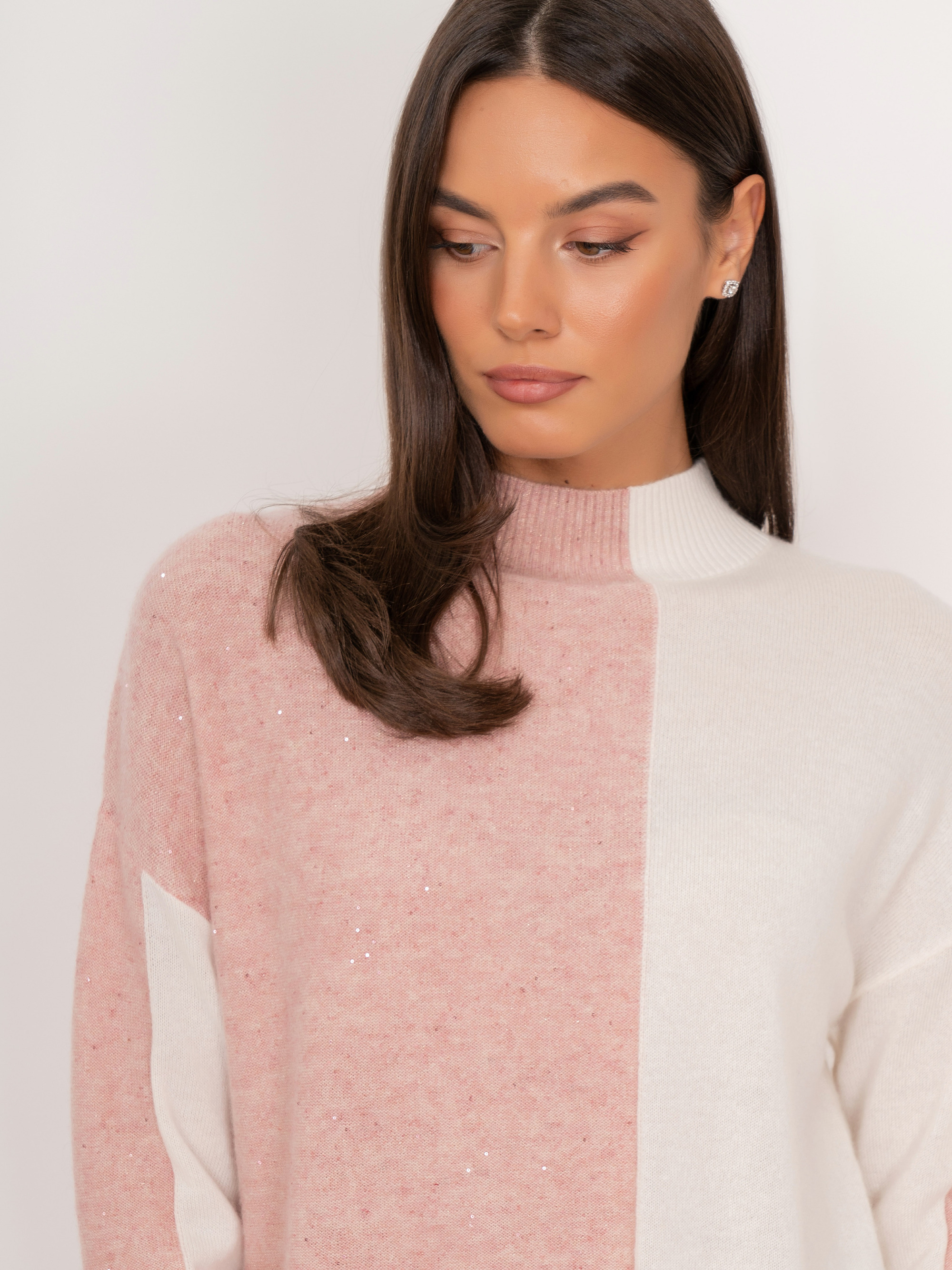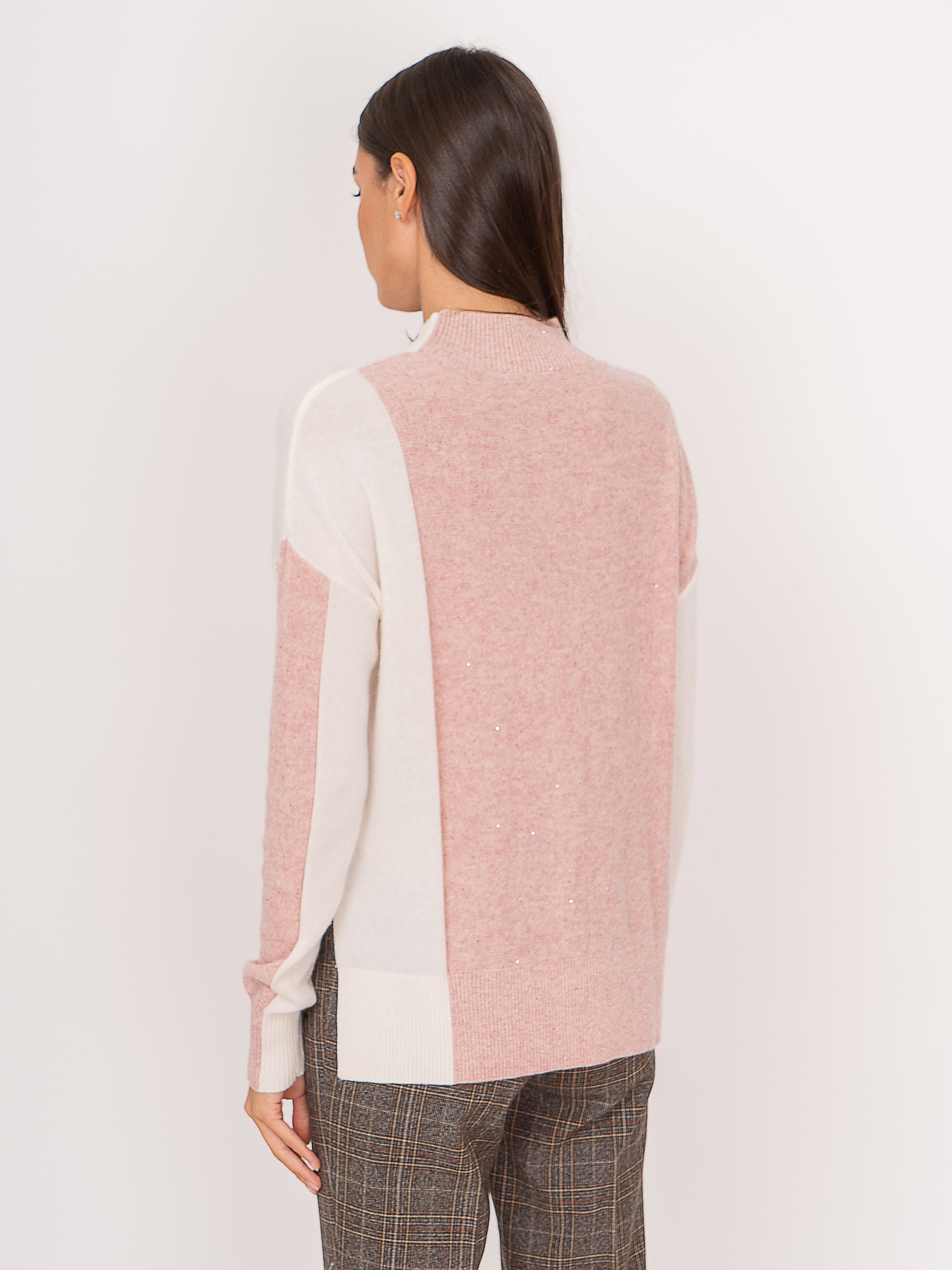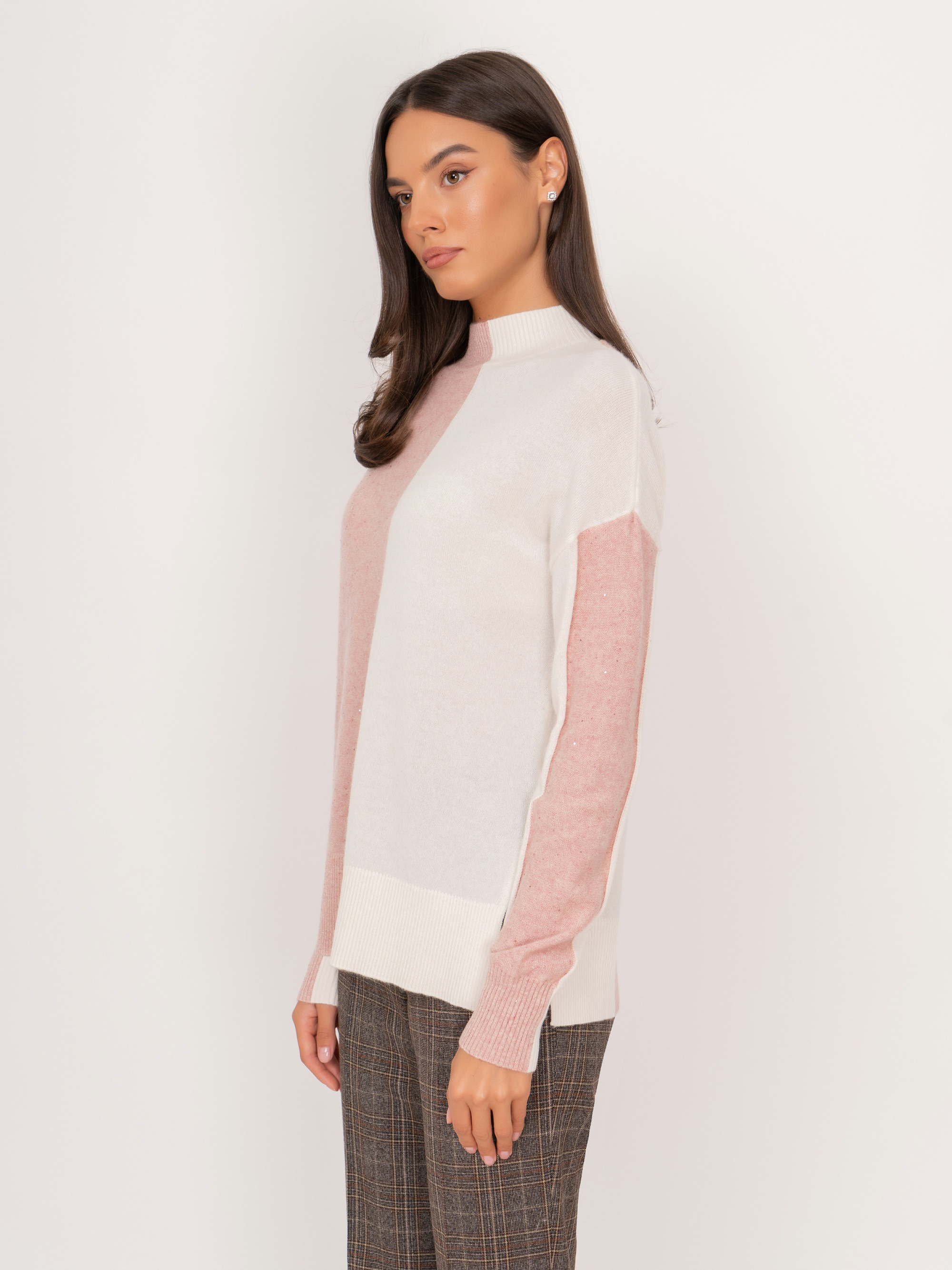 На сайте указаны российские размеры. Прямой шерстяной бело-розовый свитер с воротником воронка, с длинным рукавом, с боковыми разрезами, с паетками. Рост модели: 175 см. Длина джемпера: 61 см.