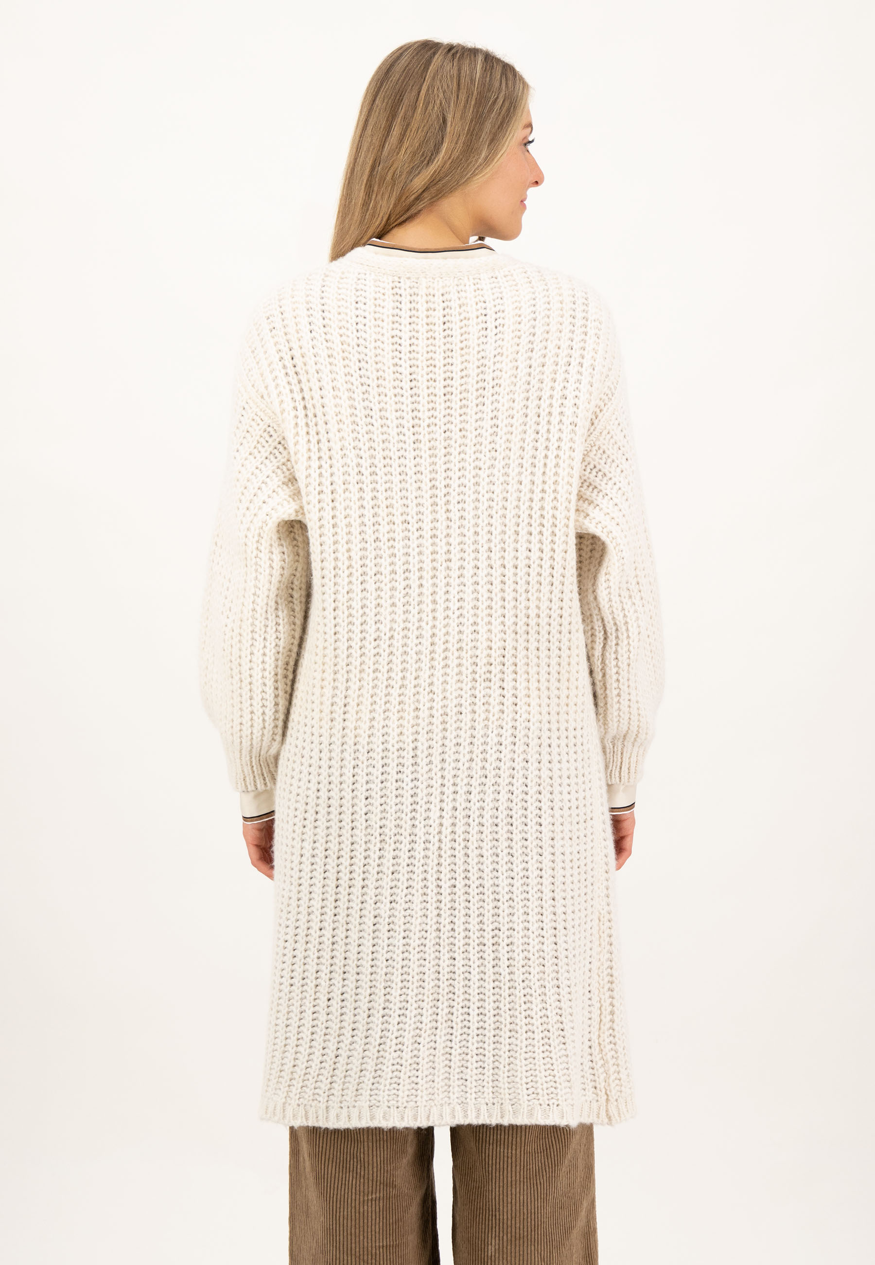 На сайте указаны российские размеры. Длинный объёмный кардиган с пышными рукавами. В сочетании с красивой блузкой , крутым свитером или повседневной толстовкой — эта модная вещь украсит любой образ и согреет и согреет вас. Грубая трикотажная структура особенно подчеркивается объемными рукавами. Благодаря более длинному повседневному крою куртка также идеально сочетается с платьем до колен. Рост модели: 177 см. Измерения для 44 размера: Окружность груди: 54 см Ширина подола: 60 см Длина по спинке: 91 см. Длина рукава: 68 см.