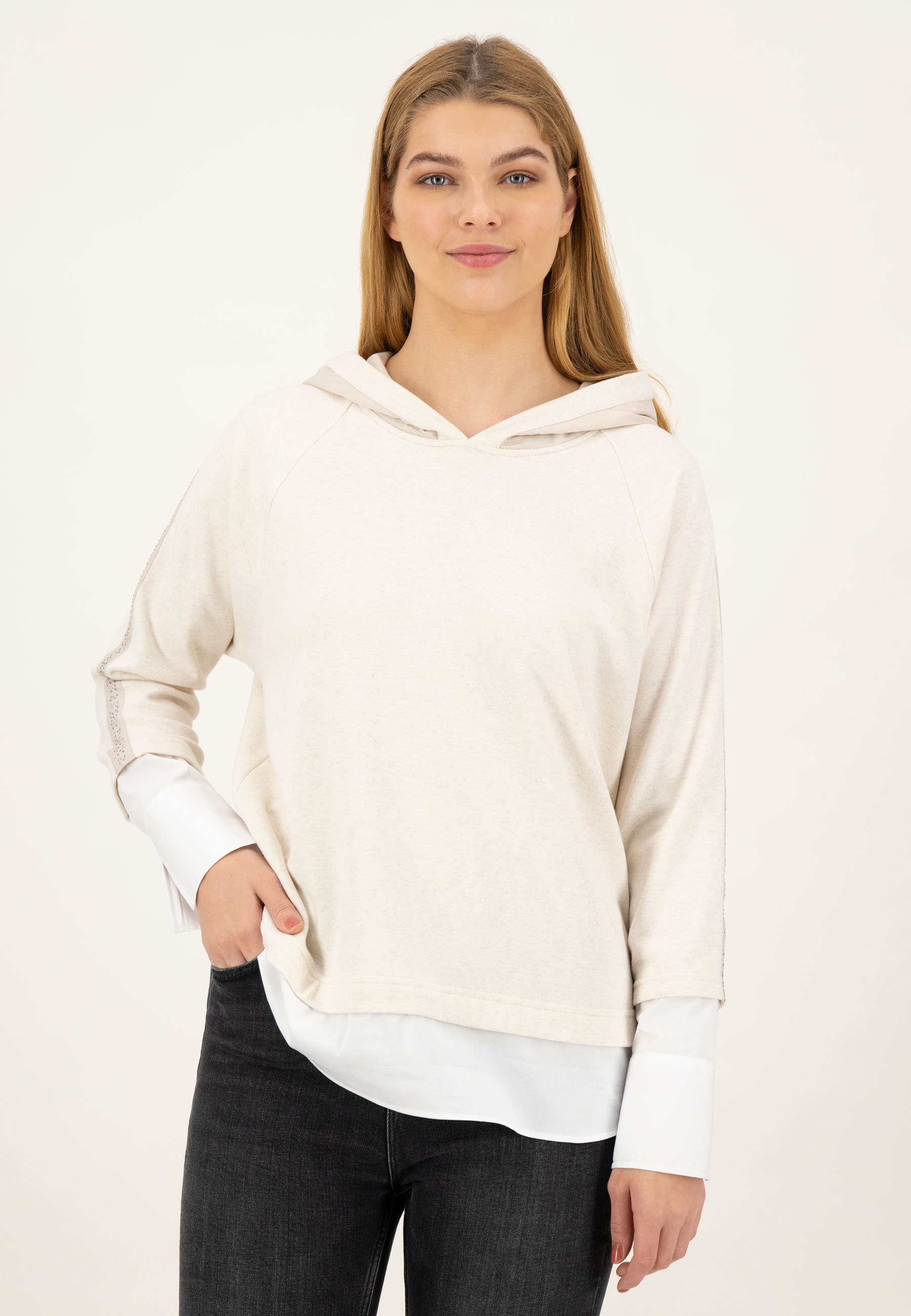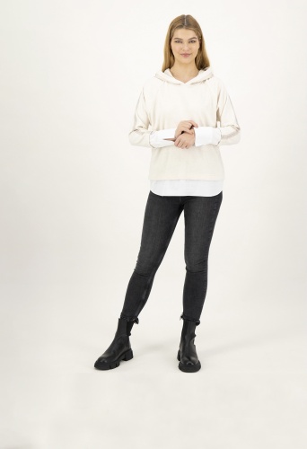 На сайте указаны российские размеры. Удобный пуловер с капюшоном, блузочной вставкой и блестящими деталями. Простая толстовка с капюшоном сочетает в себе все эти свойства со встроенной блузочной вставкой. Капюшон привлекает особое внимание, так как выполнен из слегка мерцающего атласа и умело выделяется на фоне остального потового материала. Модель ростом 177 см Измерения для 44 размера: Окружность груди: 113 см Обхват бедер: 112 см Длина спинки: 70 см Длина рукава: 71 см
