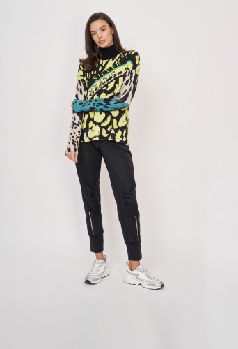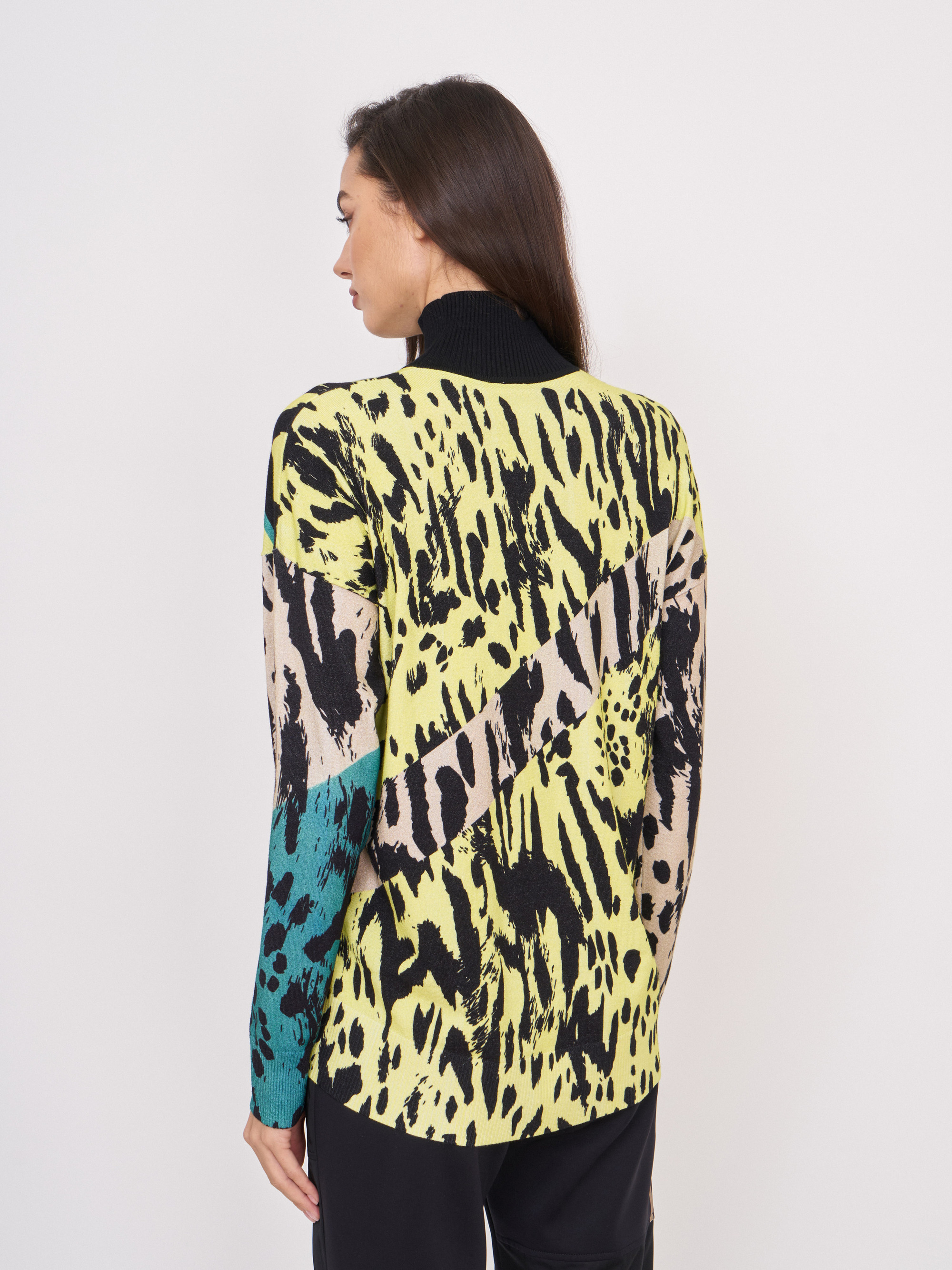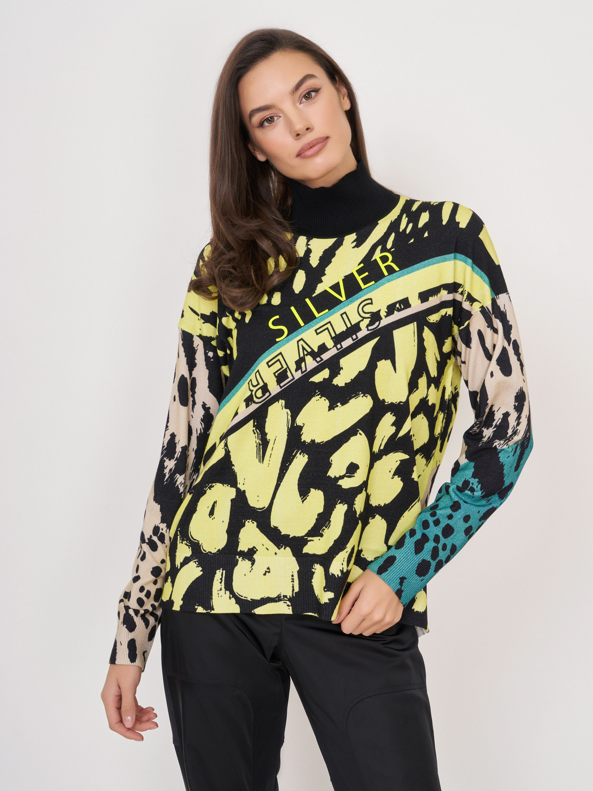 На сайте указаны российские размеры. Прямой трикотажный черно-салатовый свитер, с воротником-стойка, с длинным рукавом, с абстрактным рисунком, с бежевыми и зелеными вставками, с надписями. Длина по спинке: 66 см. Рост модели: 175 см.