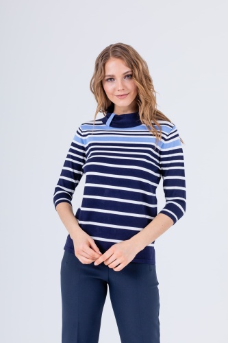 На сайте указаны российские размеры. Джемпер средней длины прямого силуэта из легкой, мягкой вискозы с добавлением нейлона, дизайнерская особенность модели – принт в полоску. Втачные рукава ¾. Воротник «хомут» с декоративной петелькой.