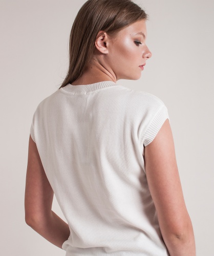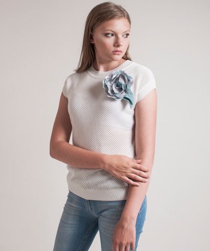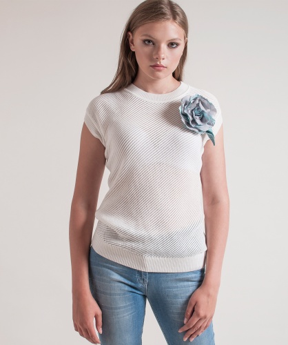 Джемпер прямого кроя. Круглый вырез горловины, короткие цельнокроеные рукава. Перед изделия выполнен ажурной машинной вязкой. Украшение в виде цветка.