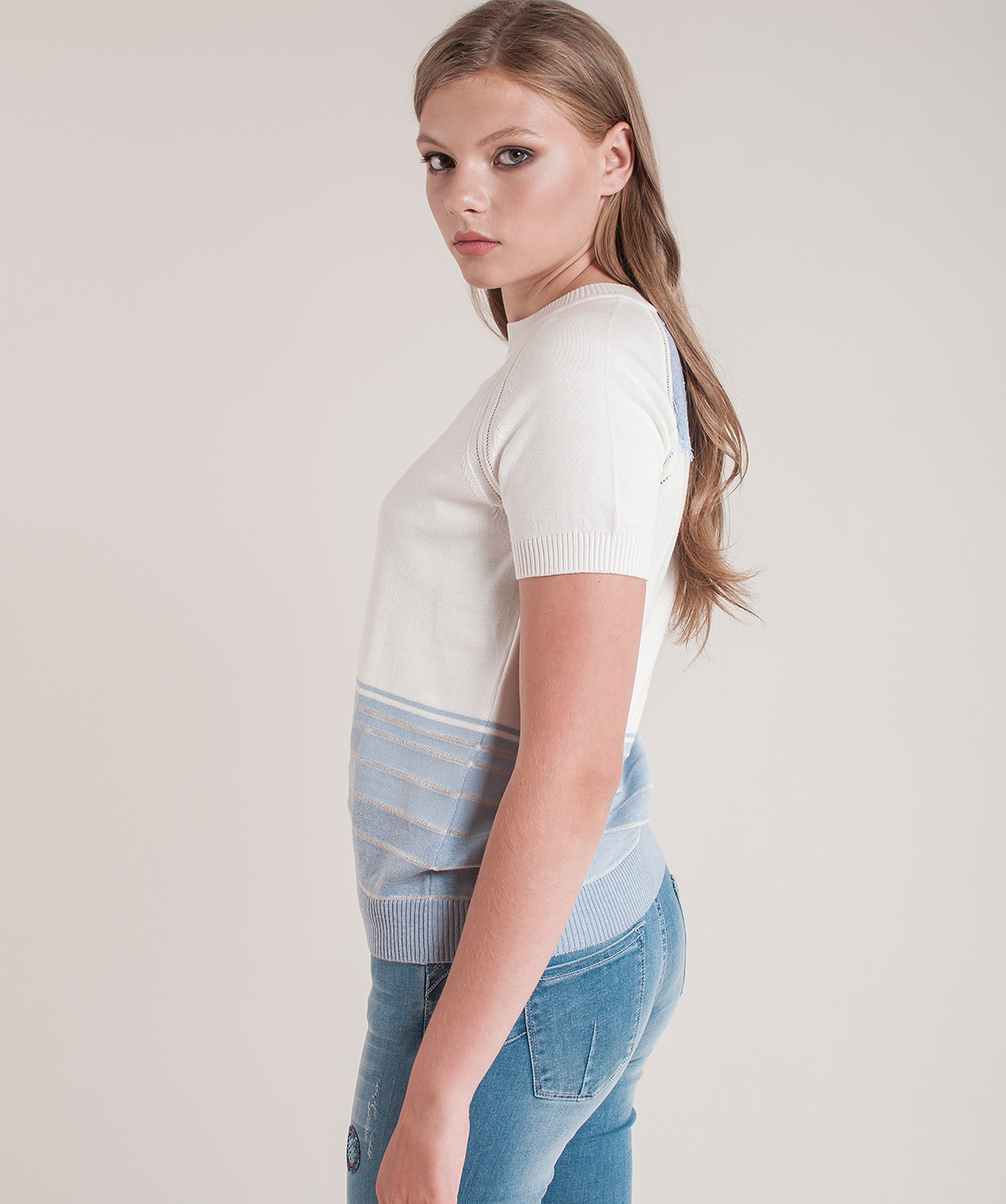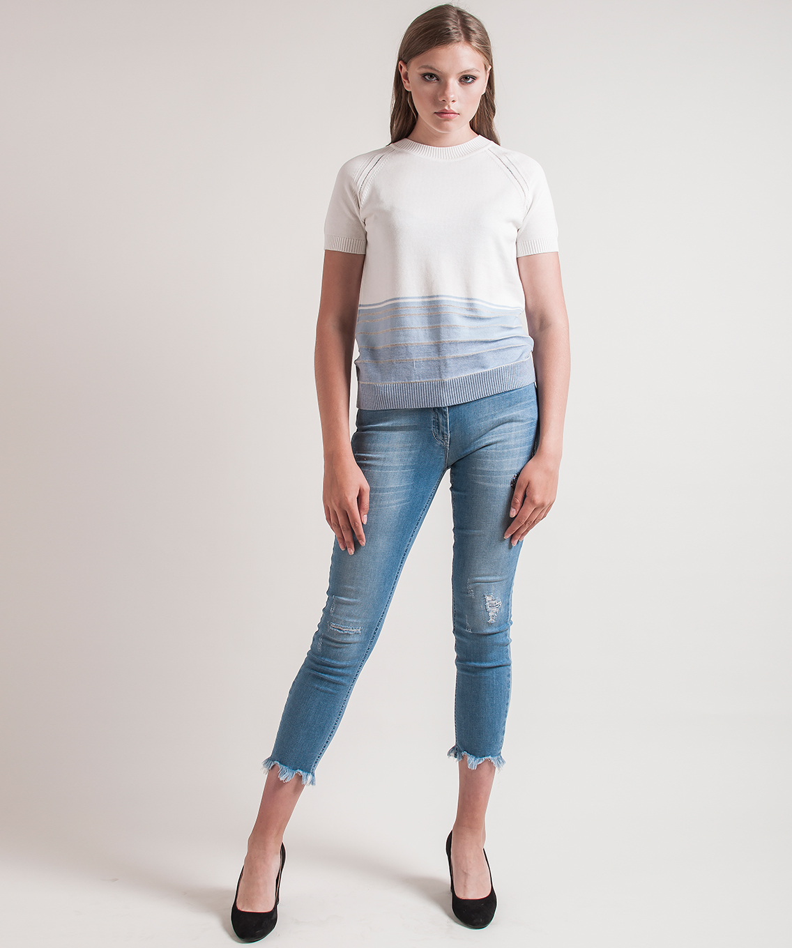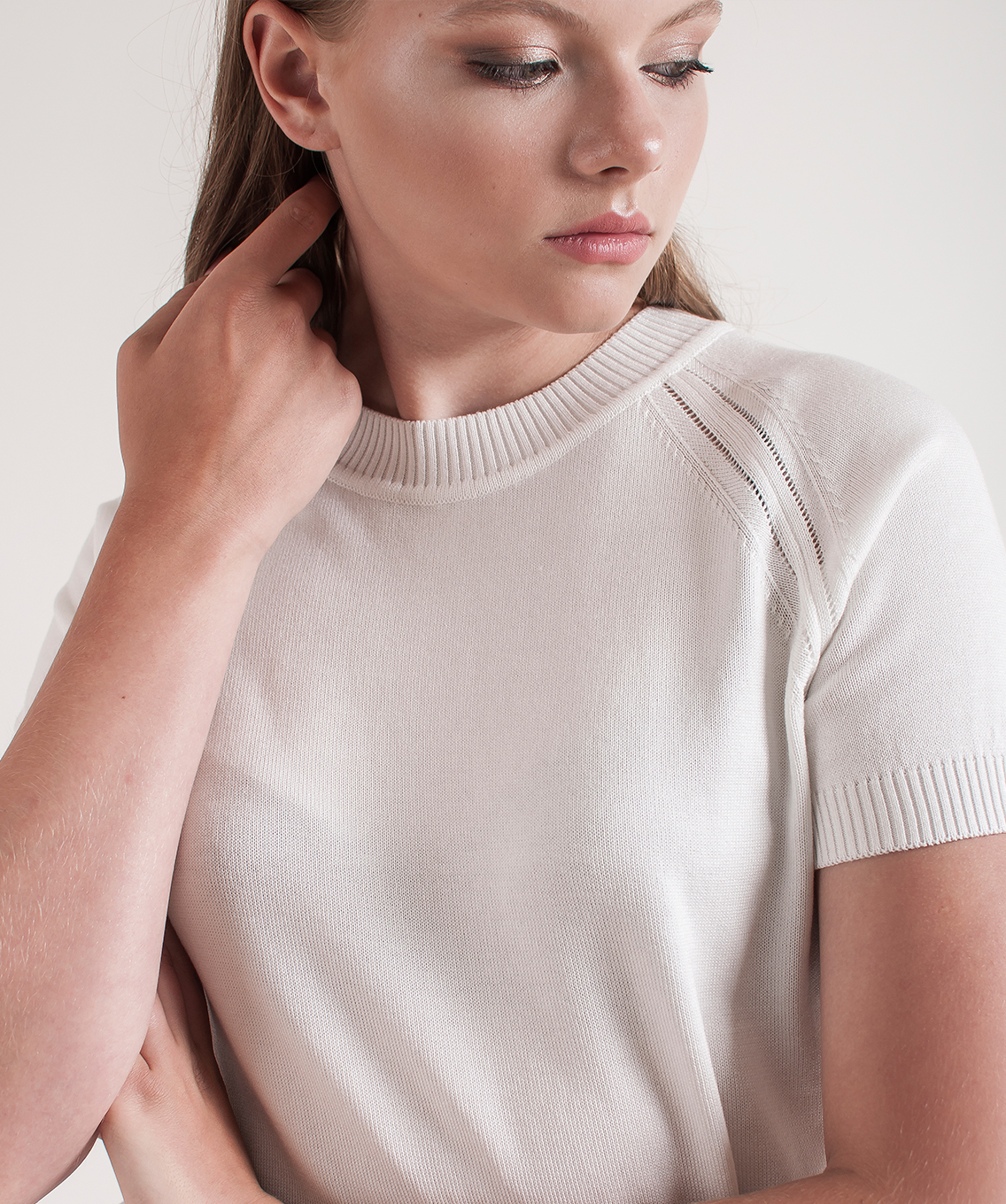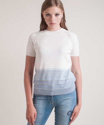 Джемпер прямого кроя. Короткие рукава реглан с ажурными элементами вдоль линии шва, круглый вырез горловины. Кружевная вставка на спинке.
