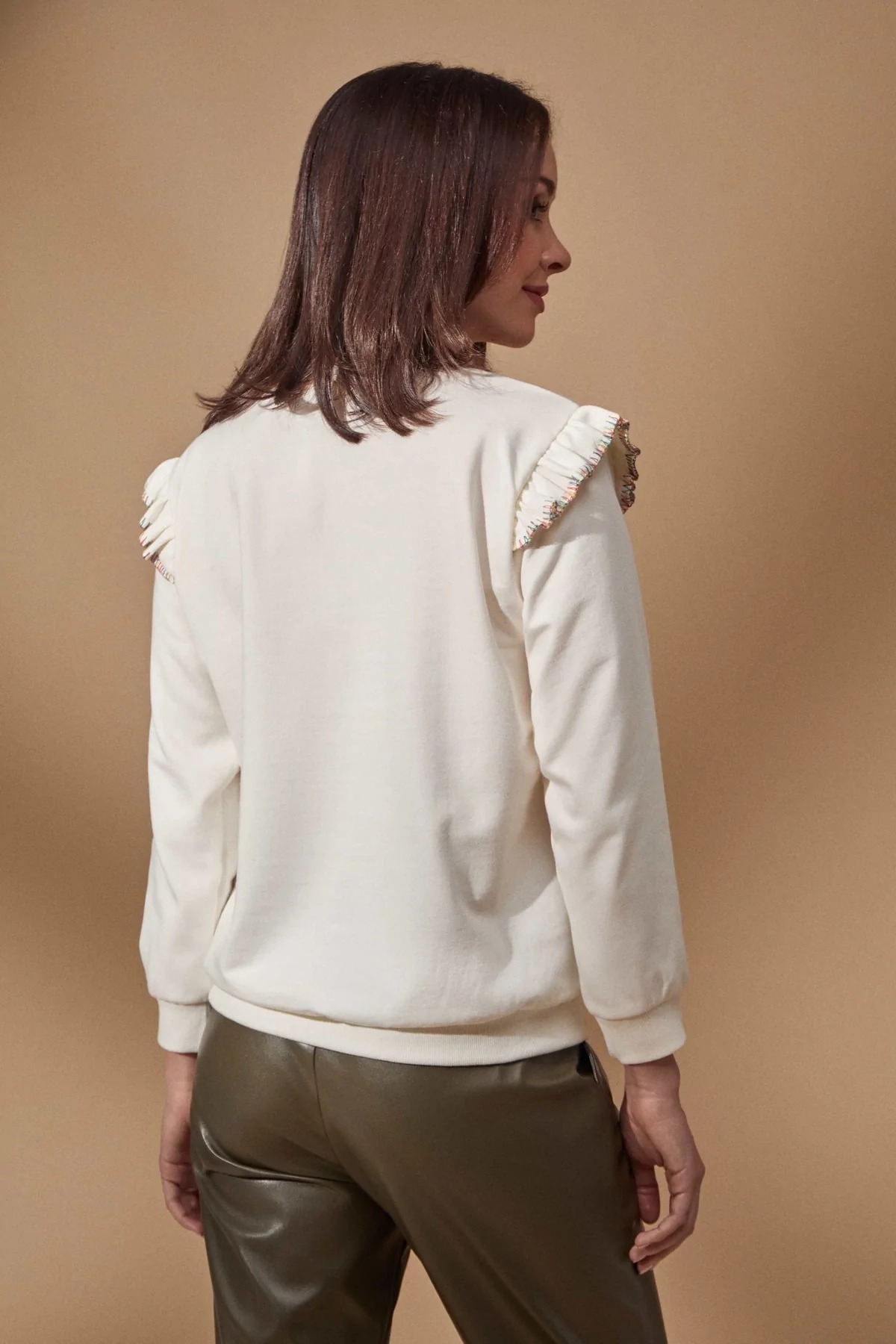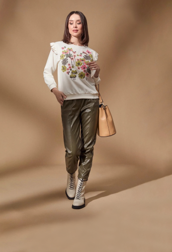 На сайте указаны российские размеры. Белая толстовка, вышитая цветами, с длинными рукавами. Также на рукавах, отделанных манжетами, имеется небольшой рюш на части чашки, отделанной разноцветной вышивкой. Рост нашей модели 170 см. Длина 59 см для размера 44.