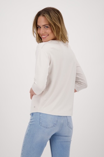 На сайте указаны российские размеры. Трикотажная рубашка от monari изготовлена из вискозы, модала и эластана и поэтому удобна в носке. Рубашка с круглым вырезом источает нотку гламура со стильными надписями из страз и привлекает внимание. Прямой силуэт и рукава 3/4 со слегка приспущенной линией плеч и закругленным низом обещают идеальную посадку на весь день. Будь то в повседневной жизни или в офисе - с этой блестящей рубашкой вы хорошо подготовлены к гламурному внешнему виду. Длина по спинке 44 размера составляет 62 см. Модель ростом 178 см