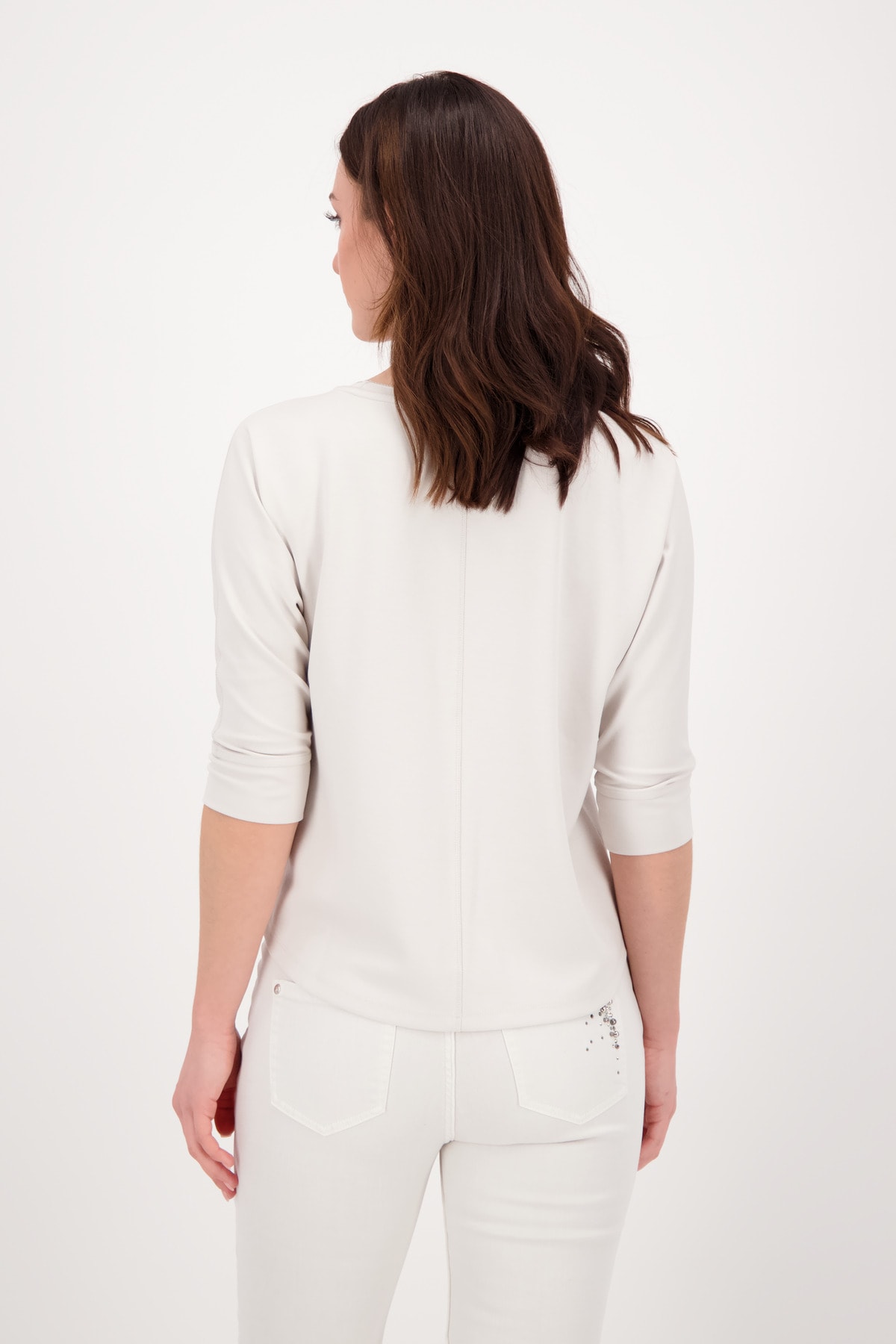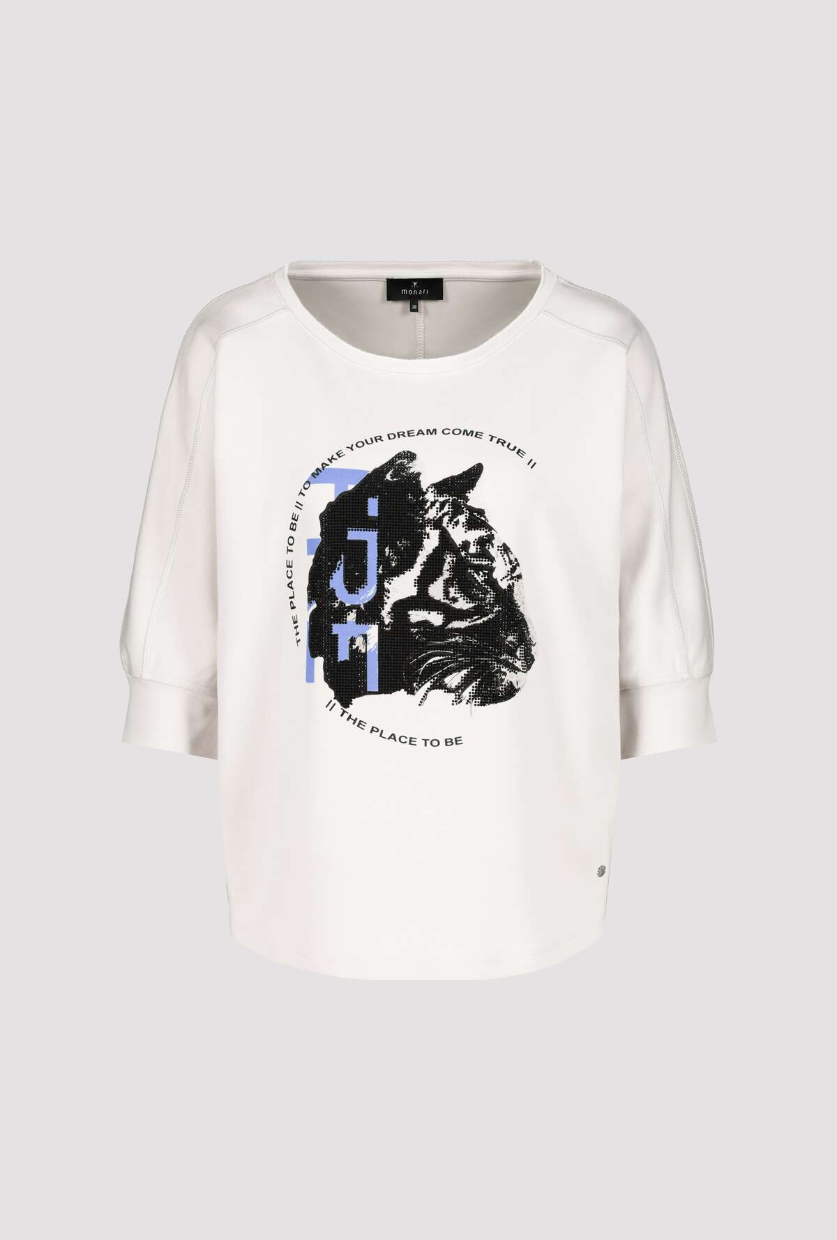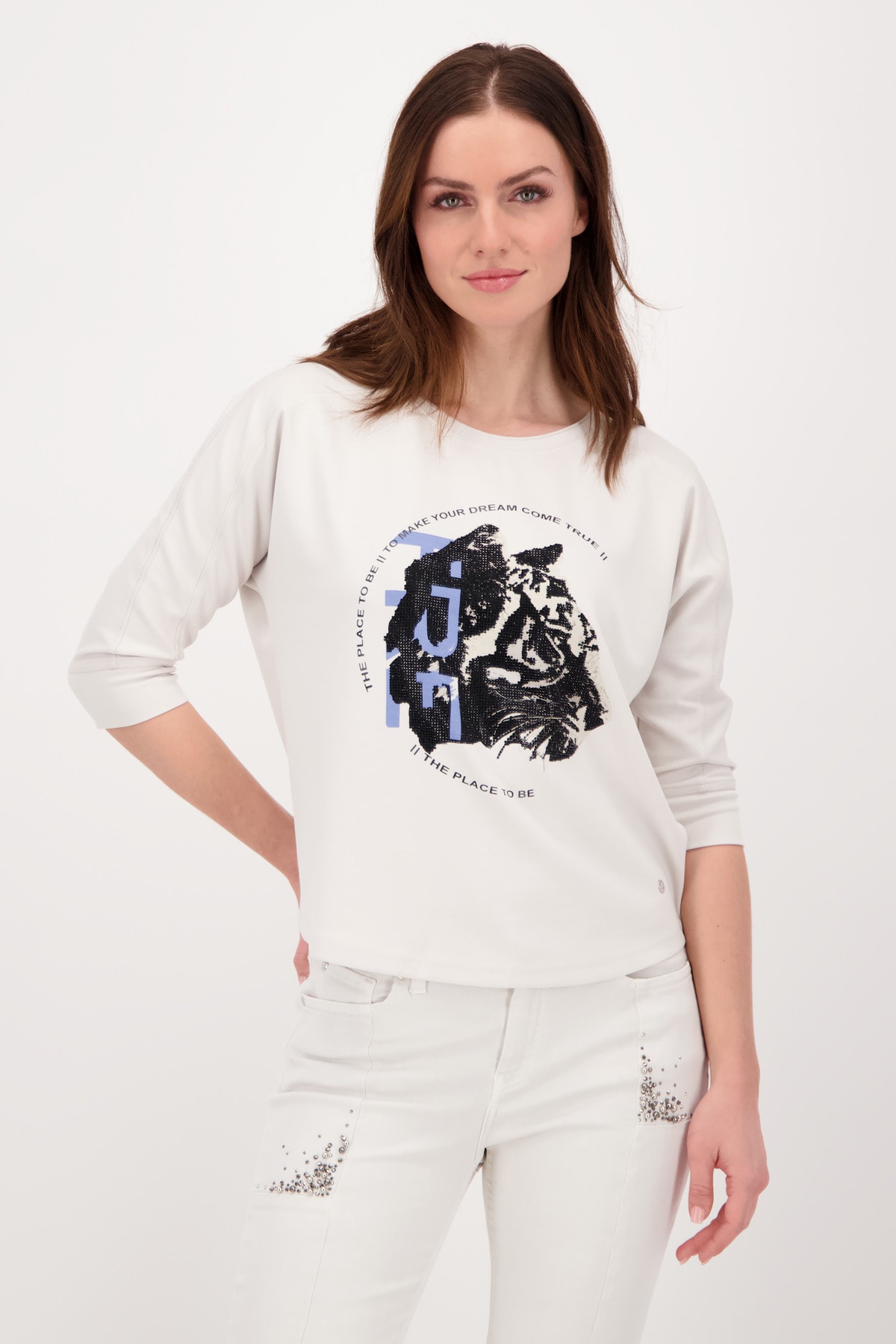 На сайте указаны российские размеры. Рубашка из джерси 3/4 с анималистичным принтом и стразами. Перед украшен крутым анималистическим принтом в виде головы тигра со сверкающими стразами и крутыми надписями. Блестящий оверлочный шов на круглом вырезе, на плече и вдоль длинных рукавов завершает дизайн женской рубашки. Закругленный низ и широкие манжеты на кромке рукава 3/4 не только гарантируют стильную деталь, но и удобную посадку, а струящаяся вискоза в миксе и эластичный материал также приятны для кожи. Длина по спинке 44 размера составляет 62 см. Модель ростом 179 см