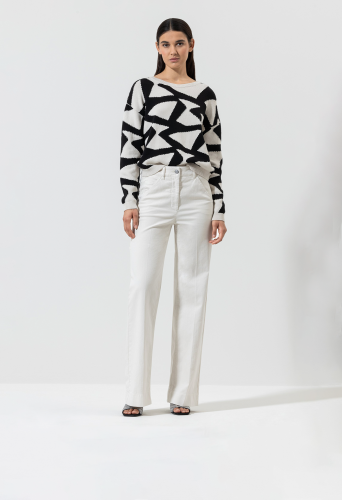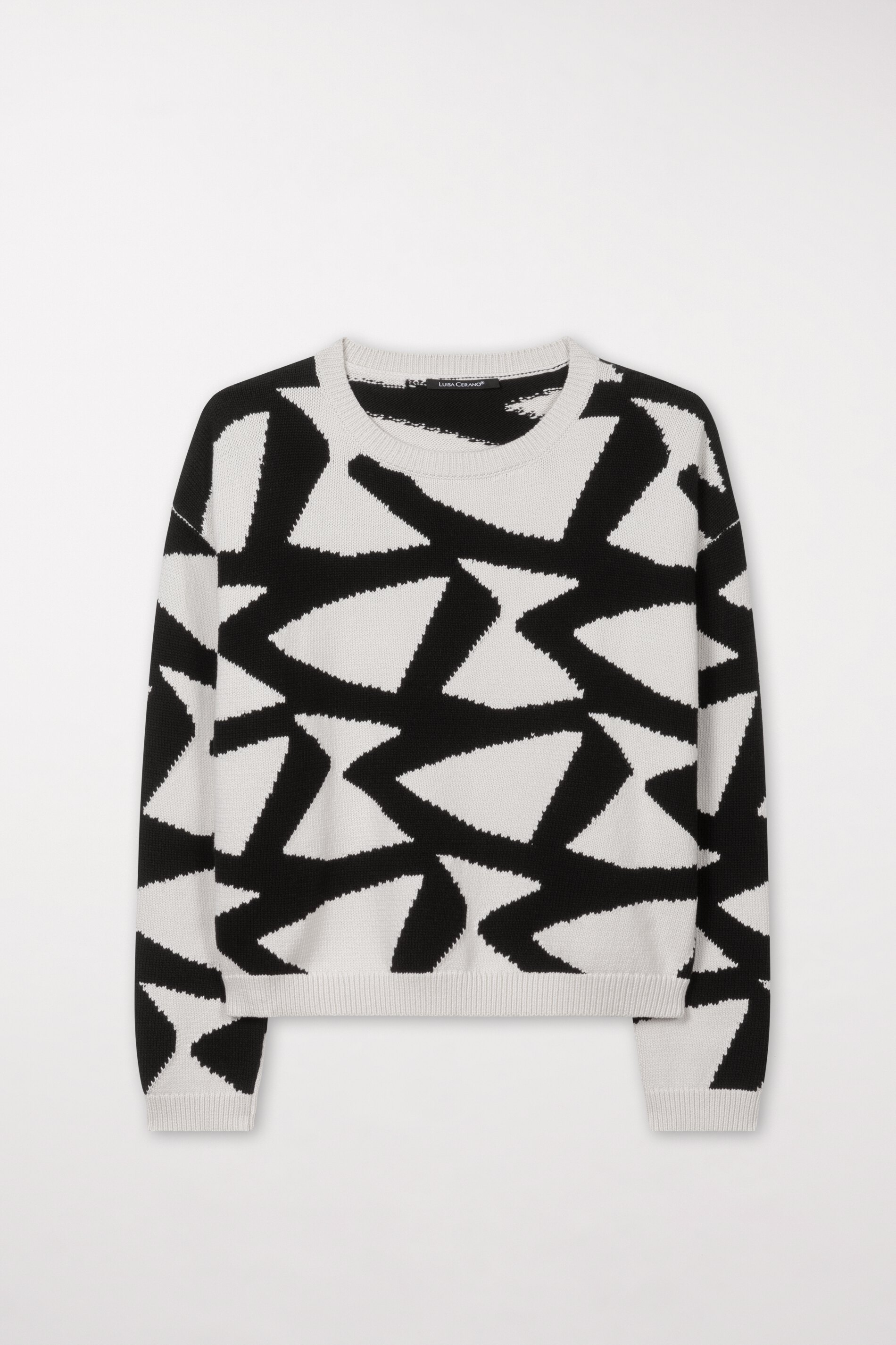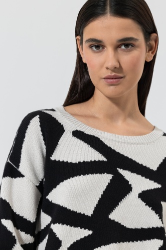 На сайте указаны российские размеры. Укороченный пуловер с круглым вырезом горловины в рубчик, манжетами и нижней каймой. Крупные узоры интарсии добавлены в легкую переплетенную хлопковую пряжу. Рост модели 178 см