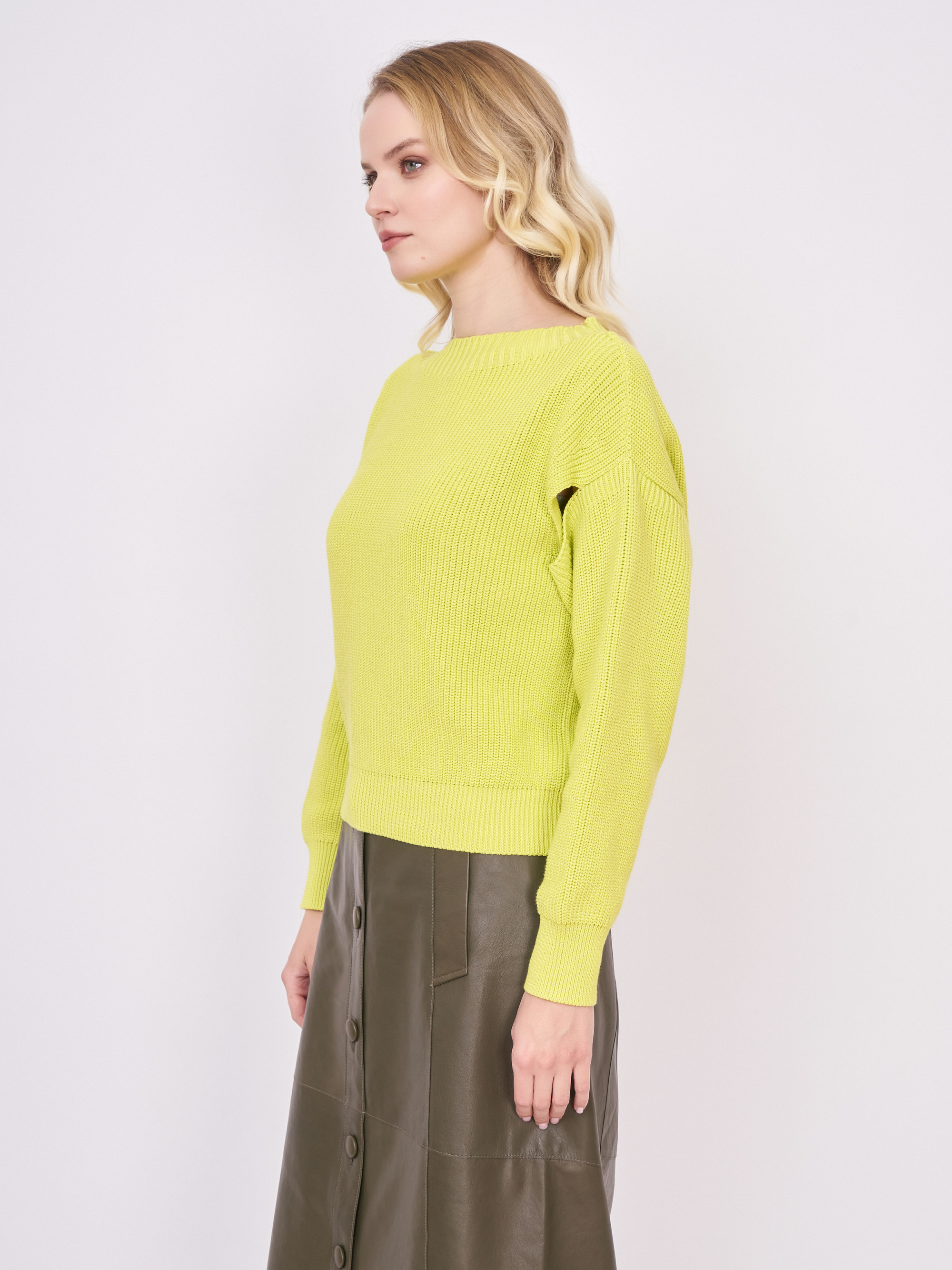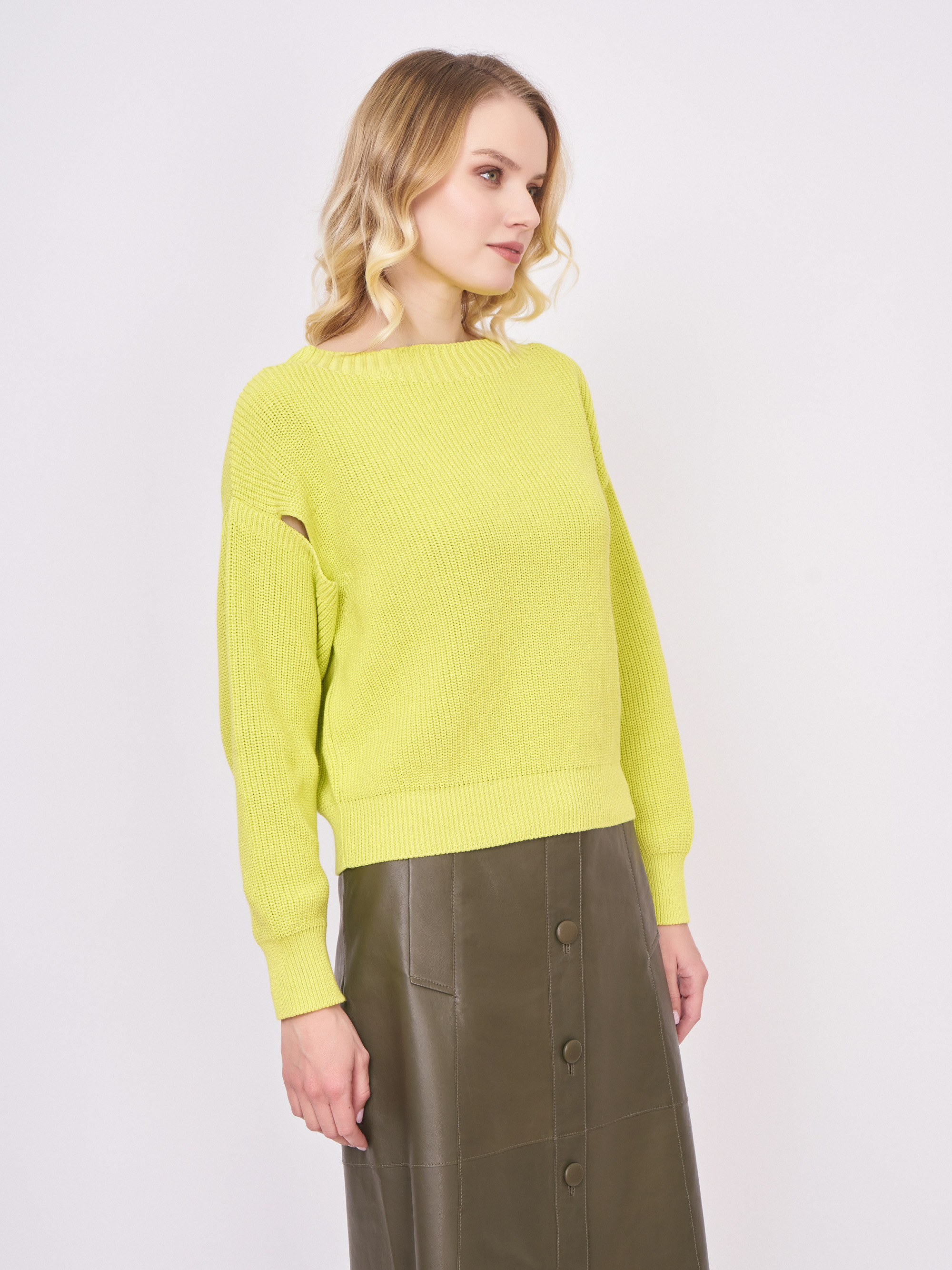 На сайте указаны российские размеры. Пуловер из органического хлопка с широким круглым вырезом идеально подходит для повседневной носки. Модная изюминка: модные вырезы на пышных рукавах. Базовый комбинируем с кожаной юбкой, лоферами и маленькой сумкой. Кстати, благоприятная для кожи хлопковая пряжа изготовлена из растений, не содержащих генной инженерии и пестицидов, в соответствии с идеей устойчивого развития. Длина по спинке: 48 см. Рост модели: 176 см.