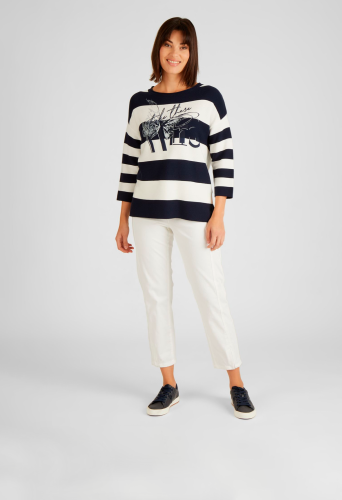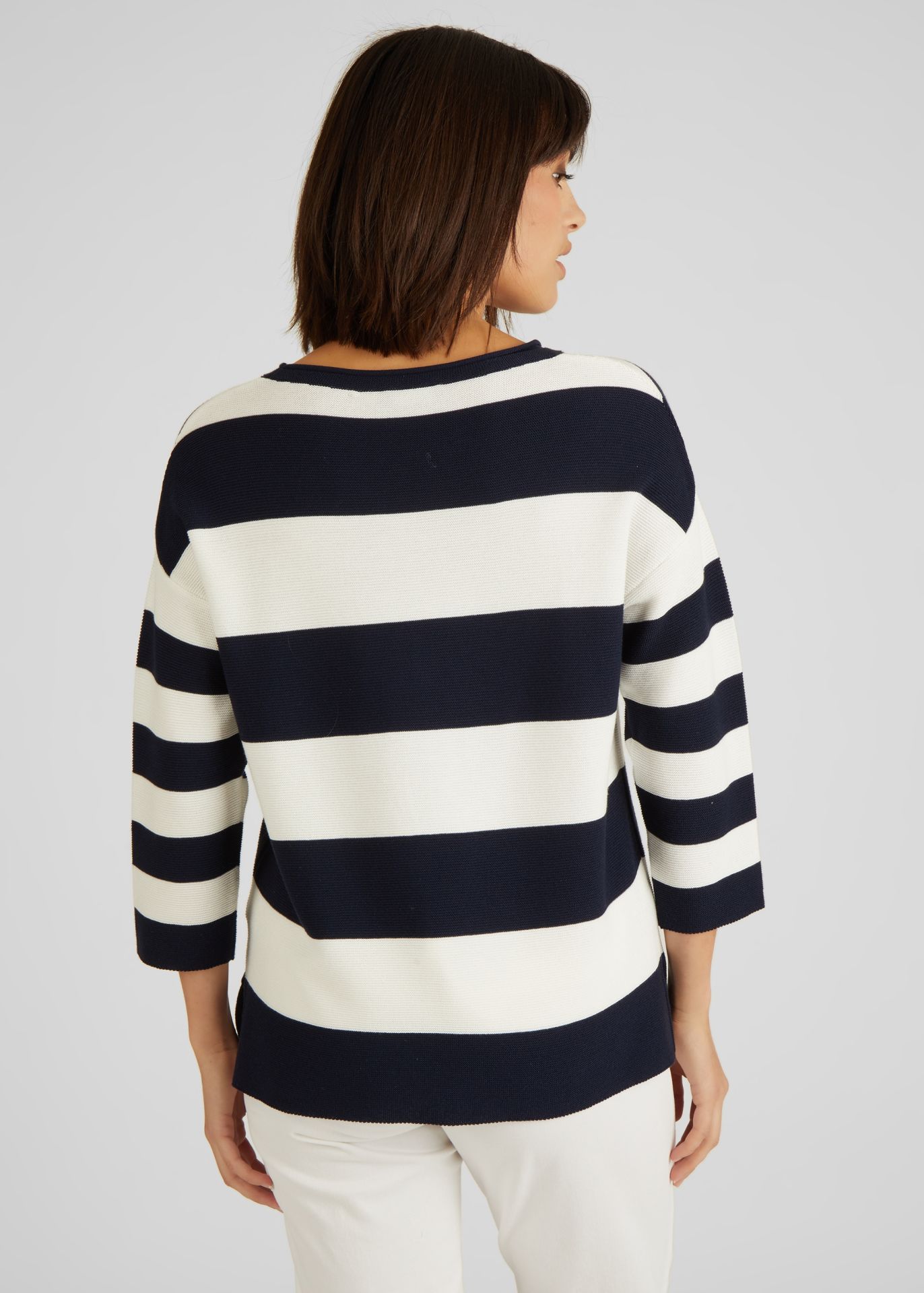 На сайте указаны российские размеры. Этот вязаный свитер с рукавами 3/4 привлекает своим абстрактным мотивом. Абстрактный мотив с буквами слегка выделяется на полосатом фоне и придает свитеру современный вид. Длина по спинке от плеча для размера 46: 62 см. Рост модели 176 см.
