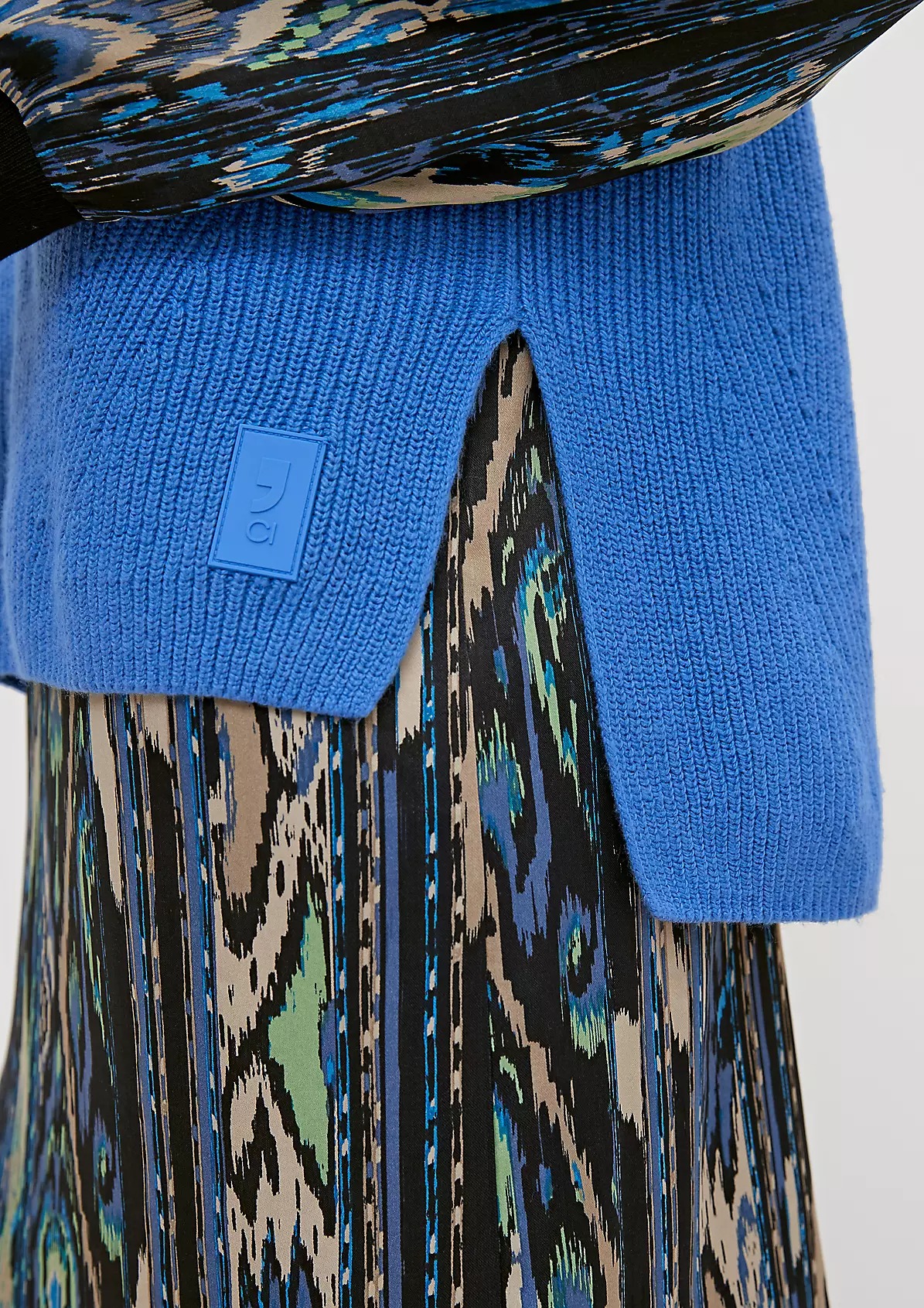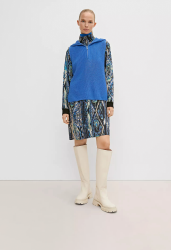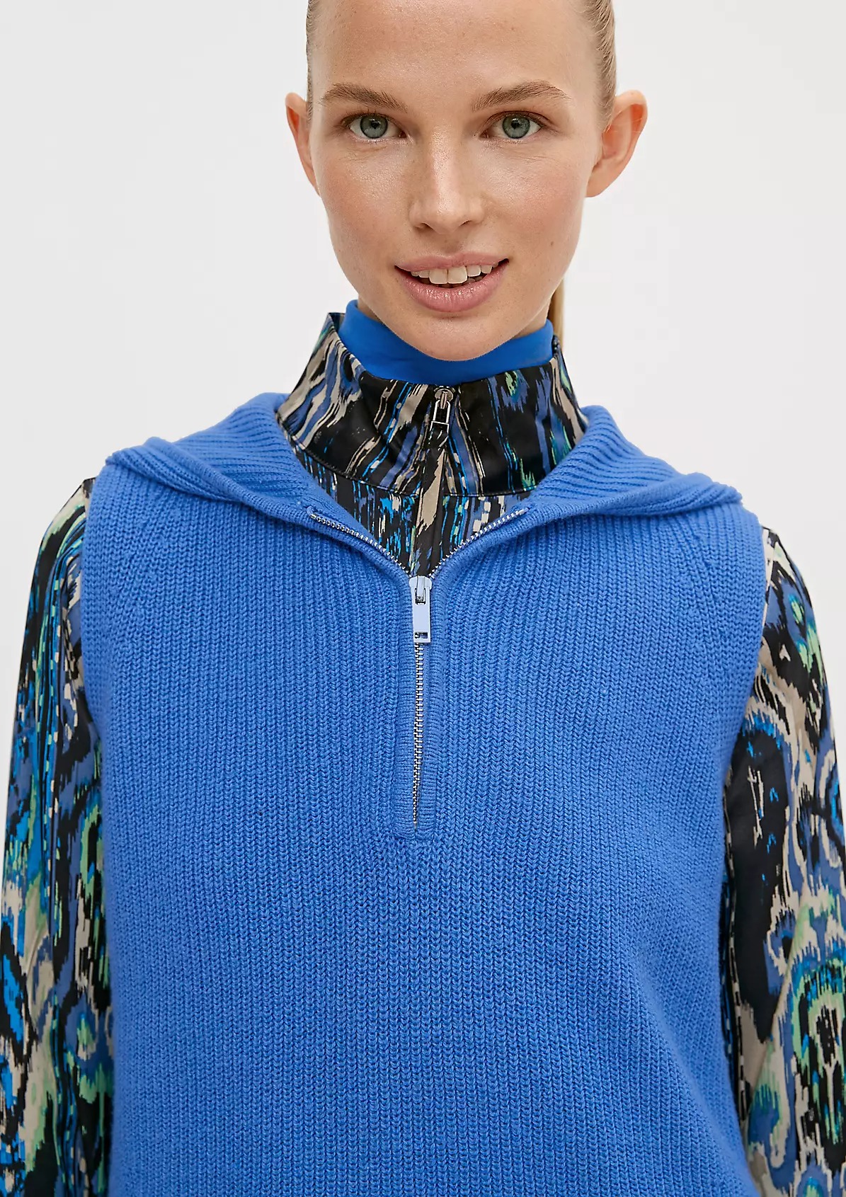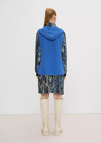 На сайте указаны российские размеры. Трикотажный жилет с капюшоном и удлиненной спинкой. Подол с разрезом сбоку. Застежка на молнию. Длина спины 63 см в размере 42 Рост модели 178 см.
