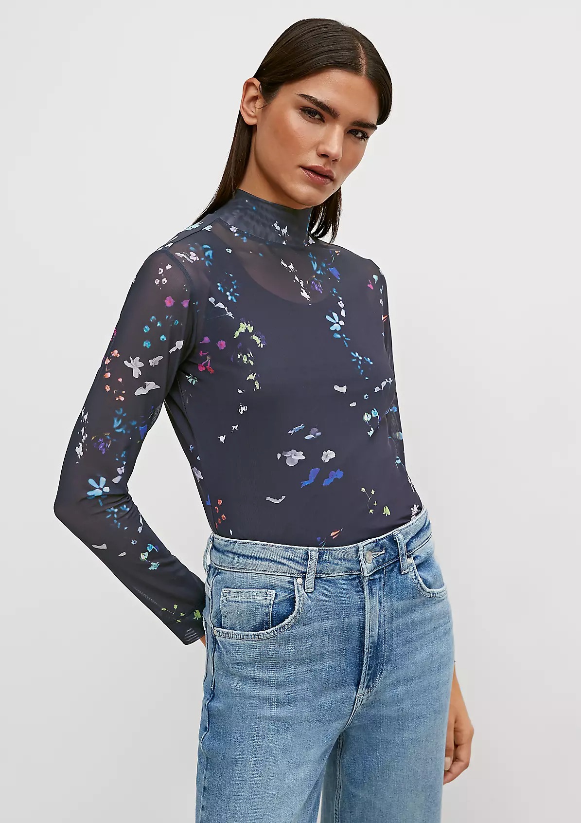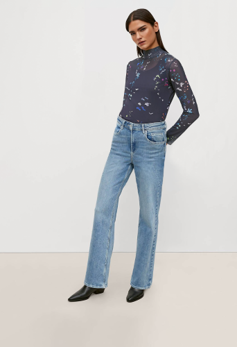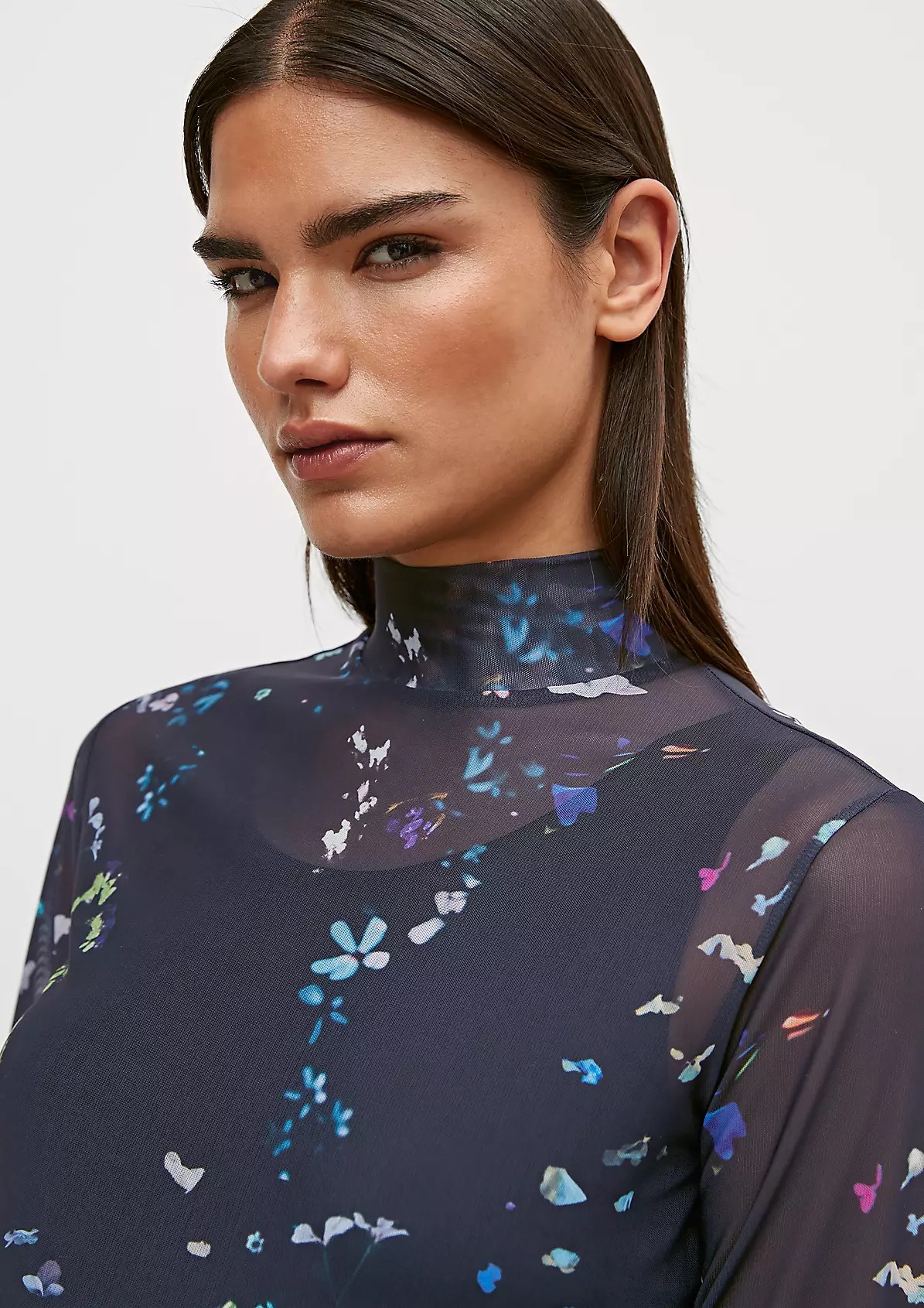 На сайте указаны российские размеры. Сетчатый топ со сплошным принтом. Длина спины 58 см в размере 42. Рост модели 177 см.