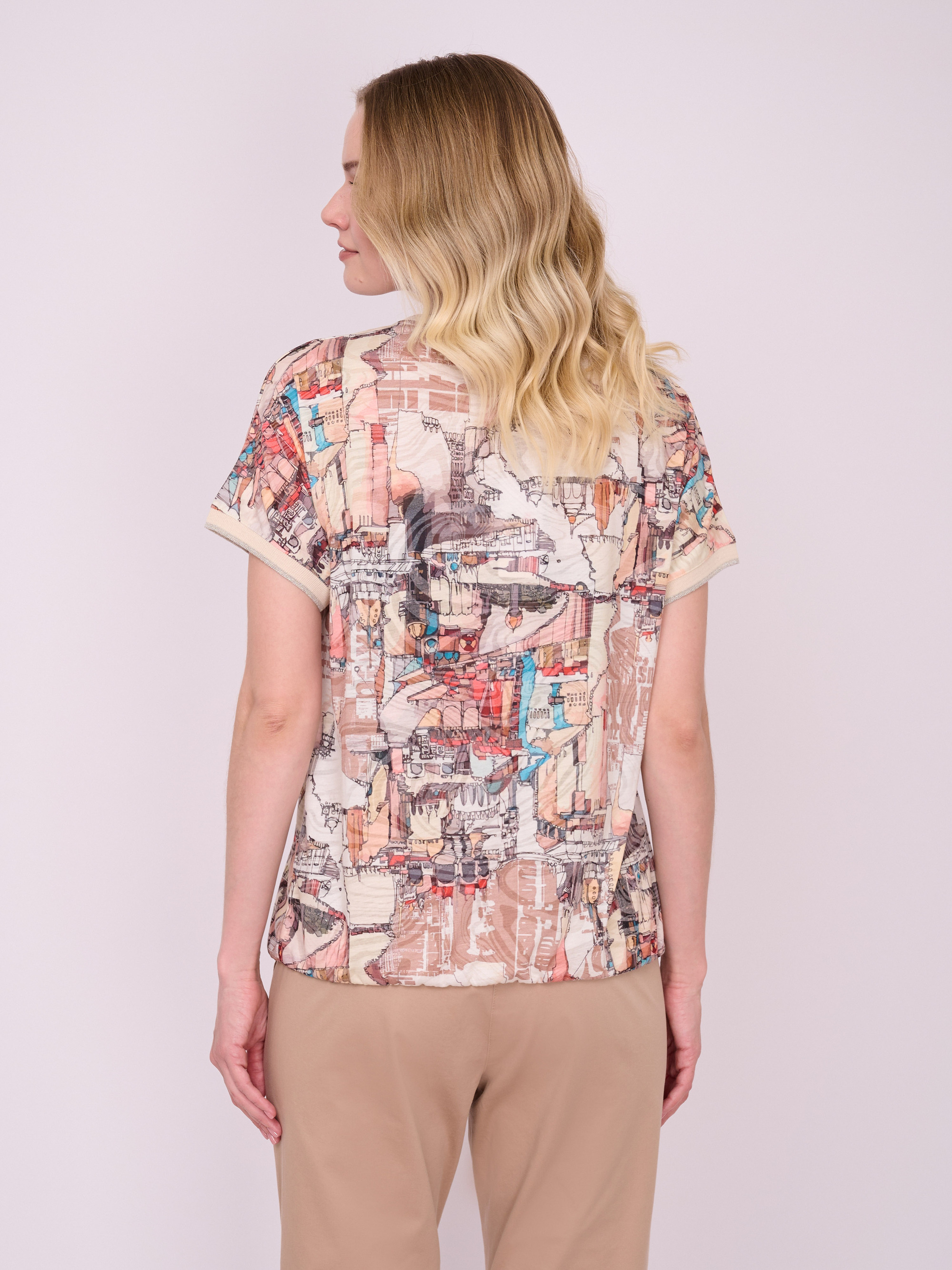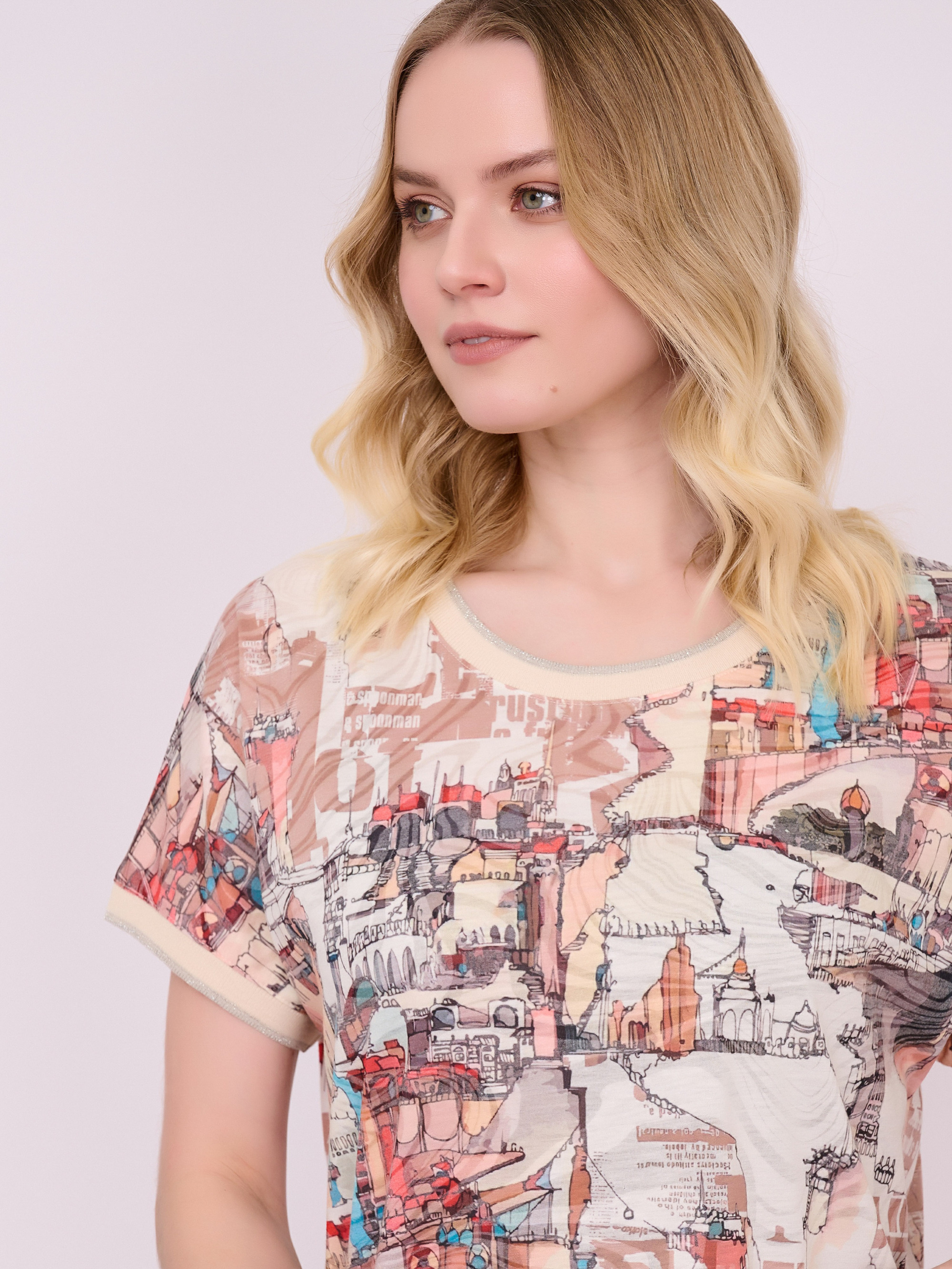 На сайте указаны российские размеры. Трикотажная футболка с короткими цельнокроеными рукавами и низом на резинке. Длина по спинке: 60 см. Рост модели 175 см.