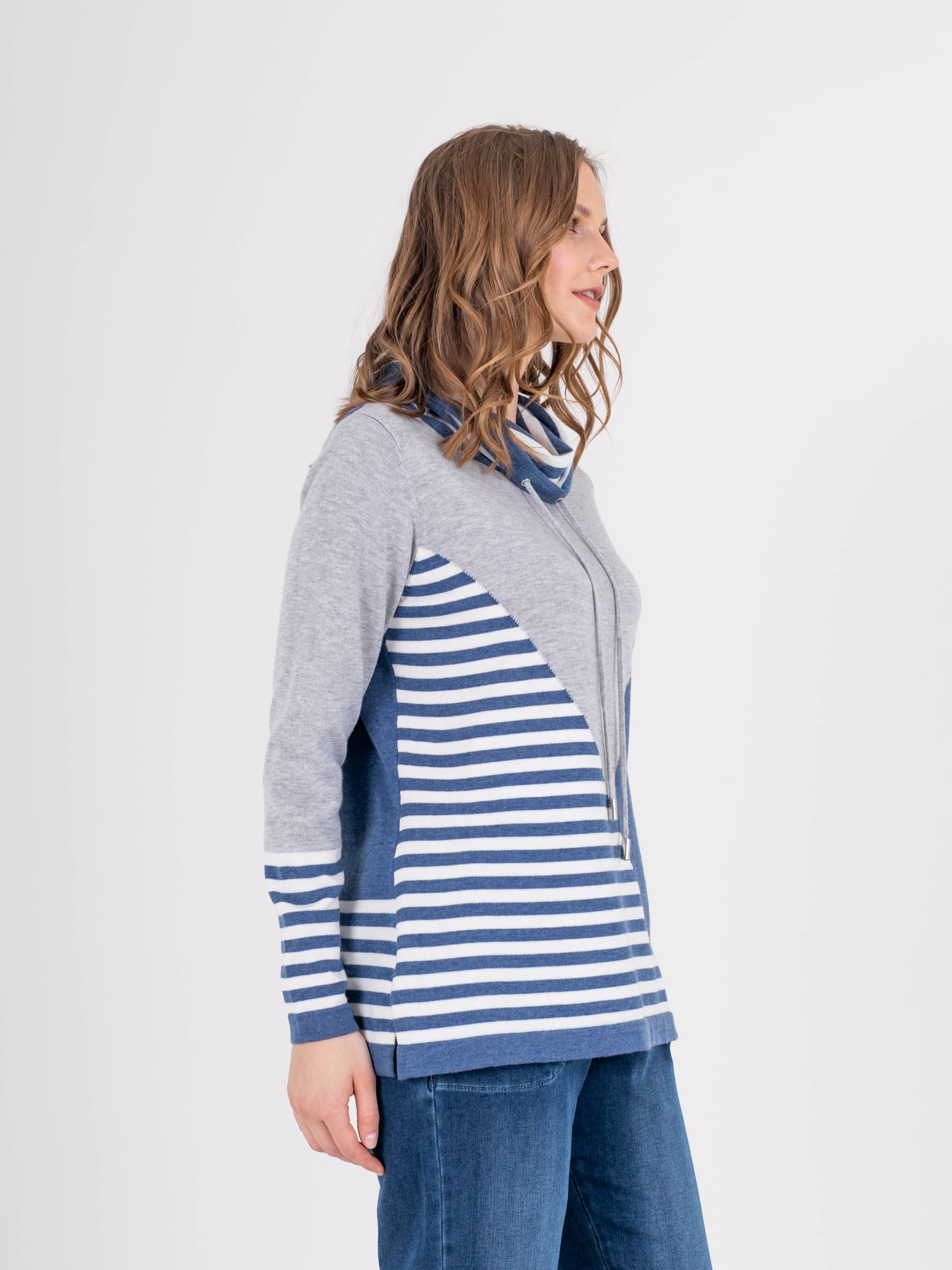 Джемпер удлиненный прямого силуэта с разрезами в боковых швах из легкого хлопка с добавлением акрила, дизайнерская особенность модели – геометрический рисунок трикотажа. Длинные втачные рукава. Воротник «хомут» со шнурами и металлическими наконечниками для регулировки прилегания.
