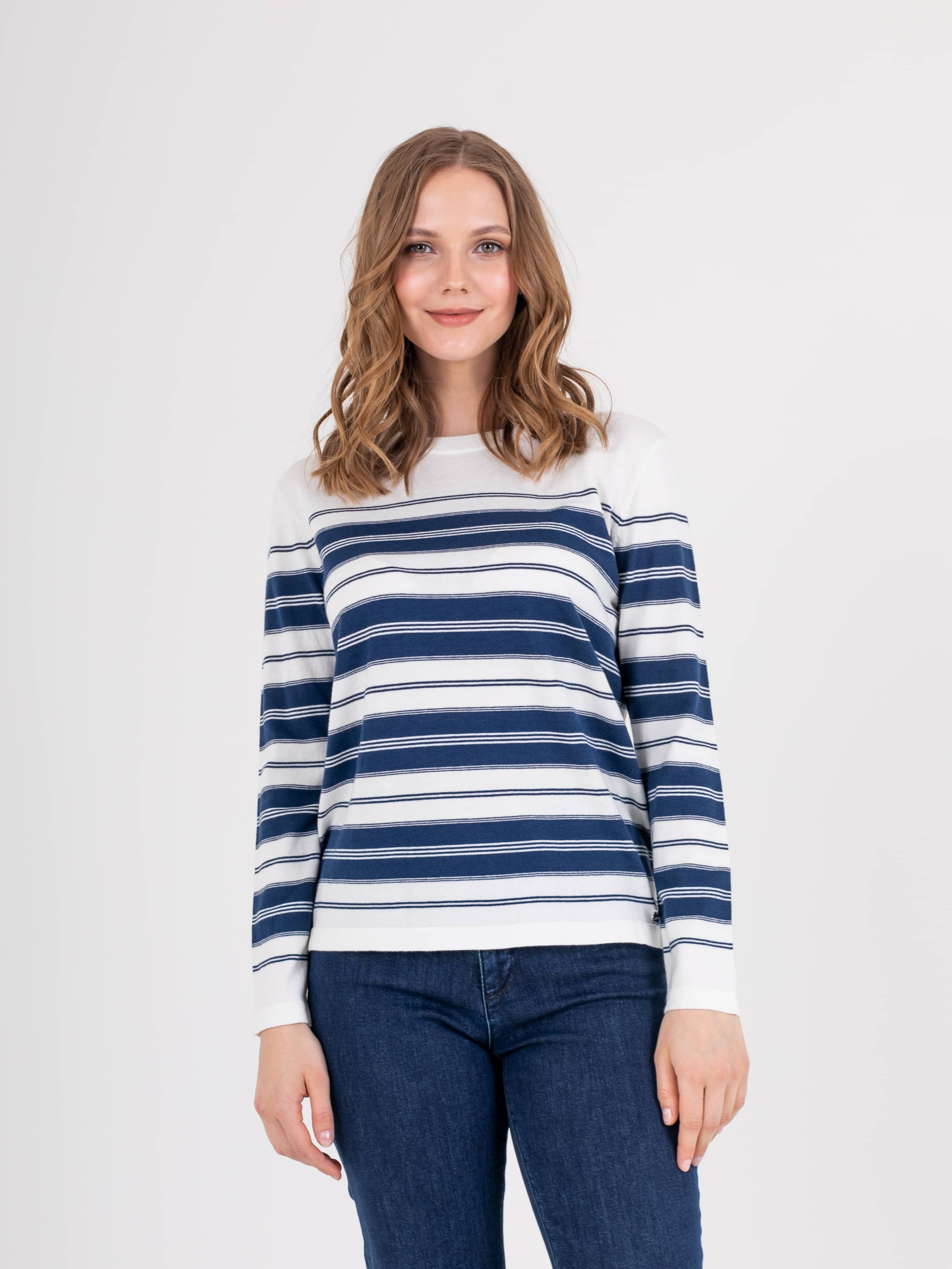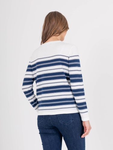 Джемпер средней длины прямого силуэта из легкого хлопка с добавлением акрила, дизайнерская особенность модели – рисунок в полоску. Длинные втачные рукава. Круглый вырез горловины.