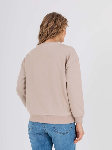 Свитшот прямого силуэта средней длины из легкого хлопка с добавлением полиэстера. Перед и спинка по низу обработаны манжетой. Перед украшен аппликациями в виде надписей из страз. Длинные втачные рукава со спущенной линией плеча и манжетами. Круглый вырез горловины.