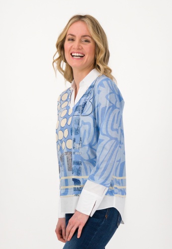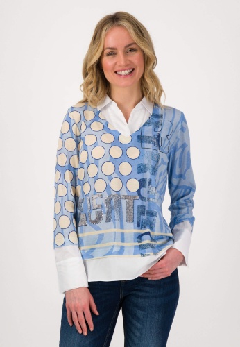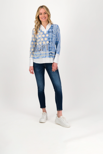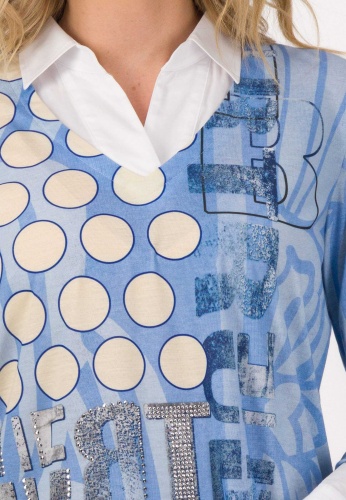 Рубашка с длинными рукавами с принтом и блузочной вставкой. Шикарная, как блузка, удобная, как рубашка из джерси, эта особенная вещь убеждает нас своим детальным принтом спереди со стразами. Закругленный низ и воротник рубашки с V-образным вырезом в сочетании с прорезными манжетами подчеркивают спортивную элегантность рубашки.