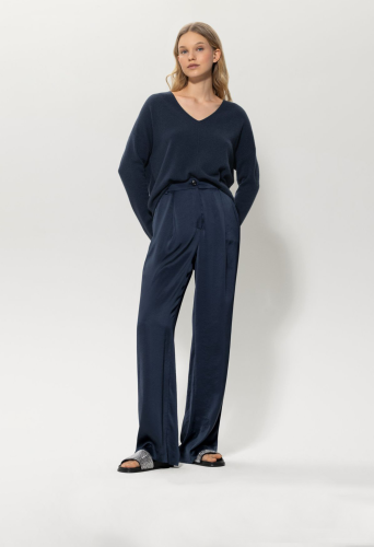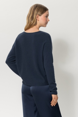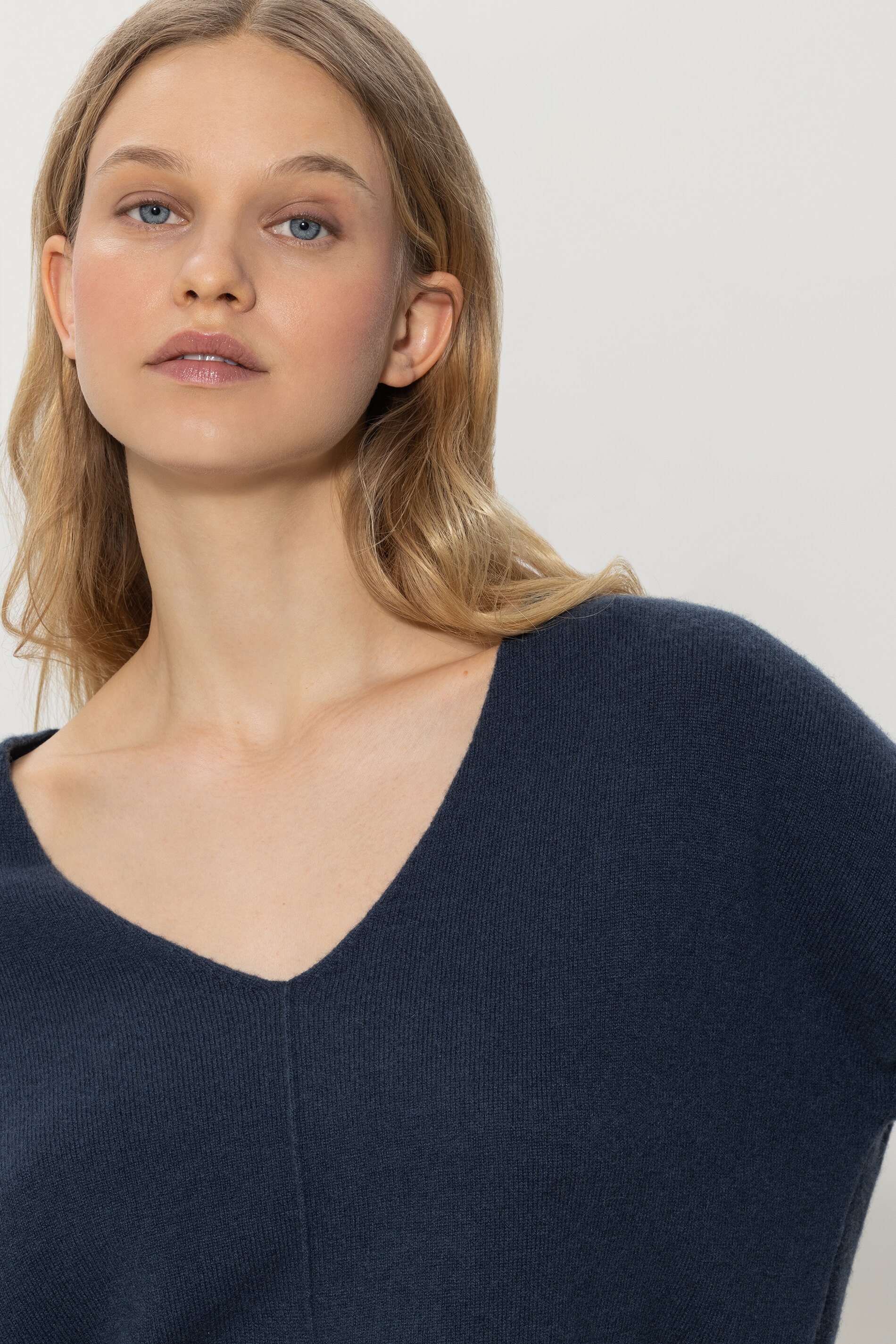 Пуловер в мелкую крапинку из тонкого смесового кашемира. V-образный вырез, заниженная линия плеча, декоративный центральный шов и закругленный низ подчеркивают утонченный дизайн.