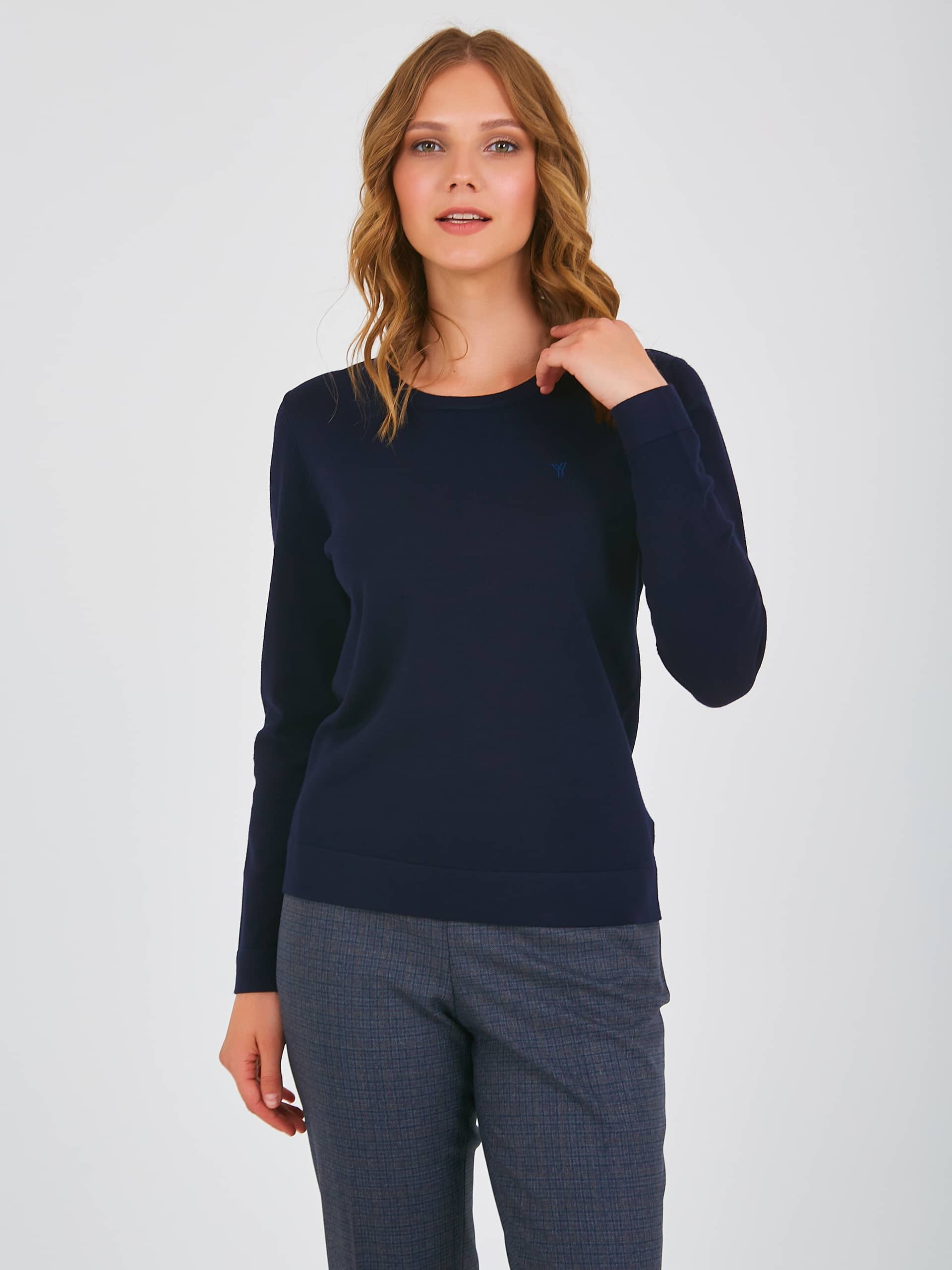 Джемпер средней длины полуприлегающего силуэта из мягкой вискозы с добавлением нейлона, дизайнерская особенность модели – небольшие нашивки по переду и спинке. Перед и спинка по низу обработаны манжетой. Длинные втачные рукава с манжетами. Круглый вырез горловины.