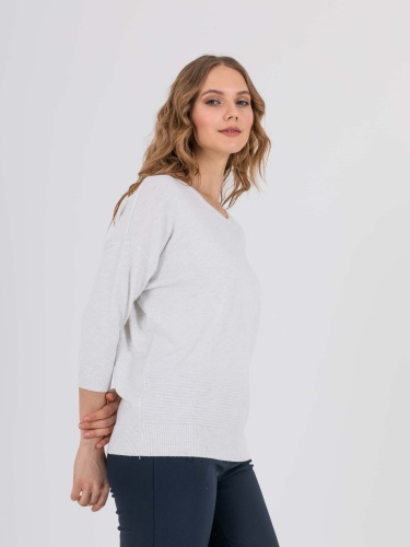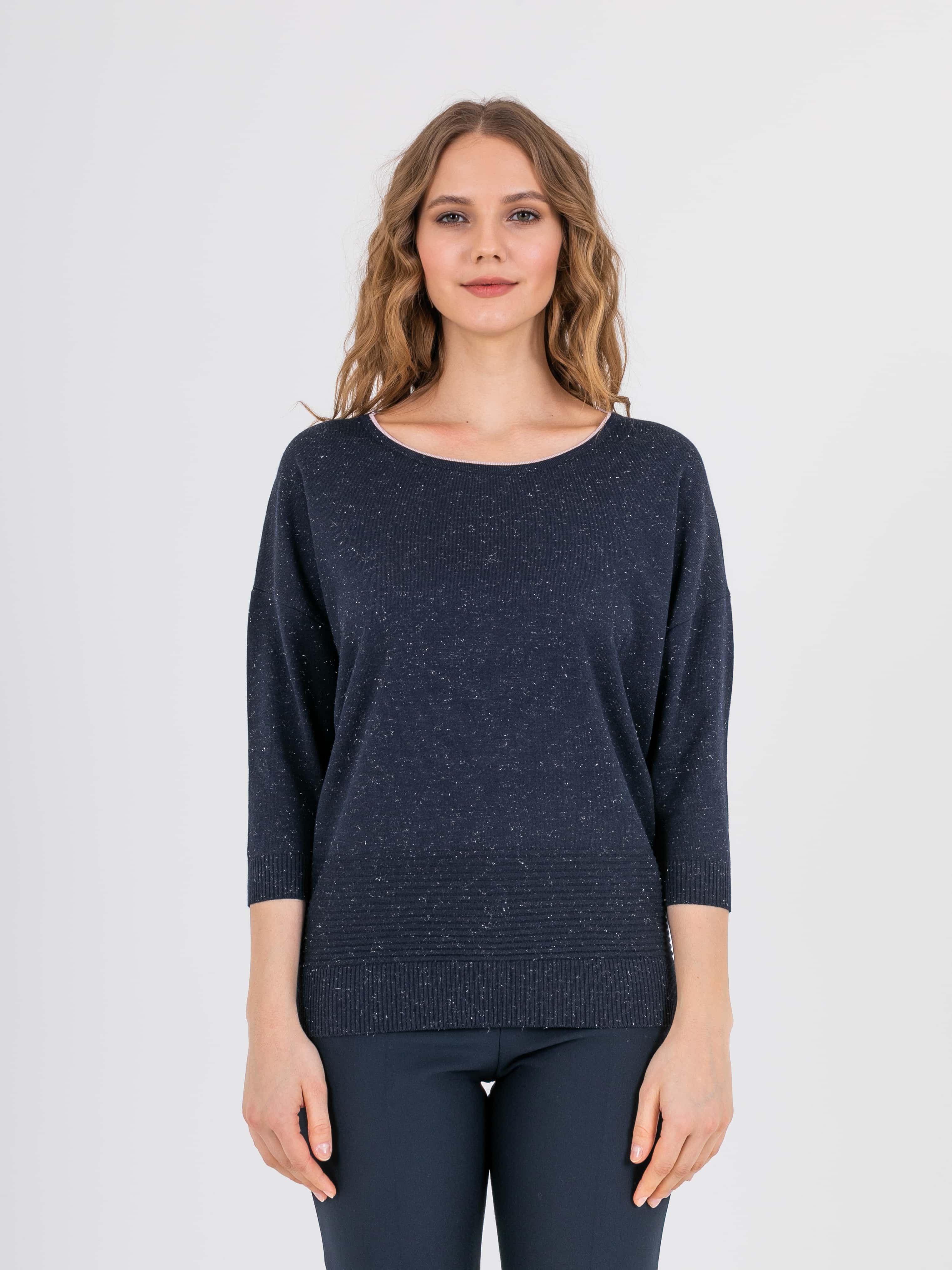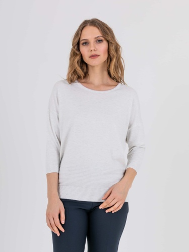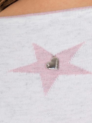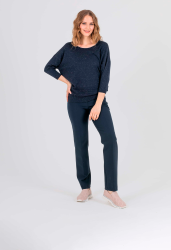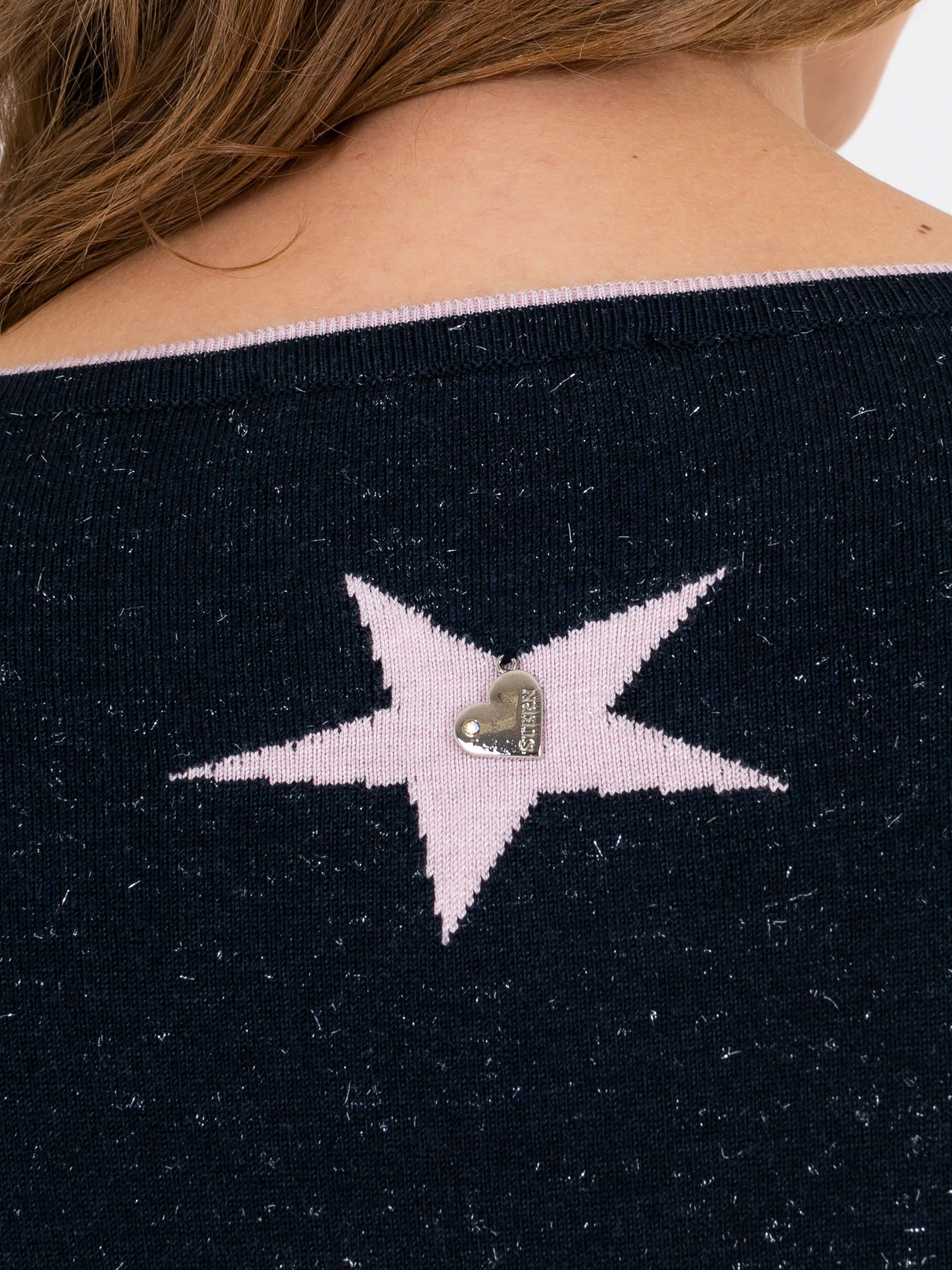 Джемпер прямого силуэта средней длины из мягкой вискозы с добавлением эластана и люрекса. Перед и спинка по низу обработаны манжетой. Перед выполнен из фактурного трикотажа. По спинке расположен нежный рисунок в виде звезды. Рукава втачные ¾ со спущенной линией плеча и манжетами. Круглый вырез горловины.