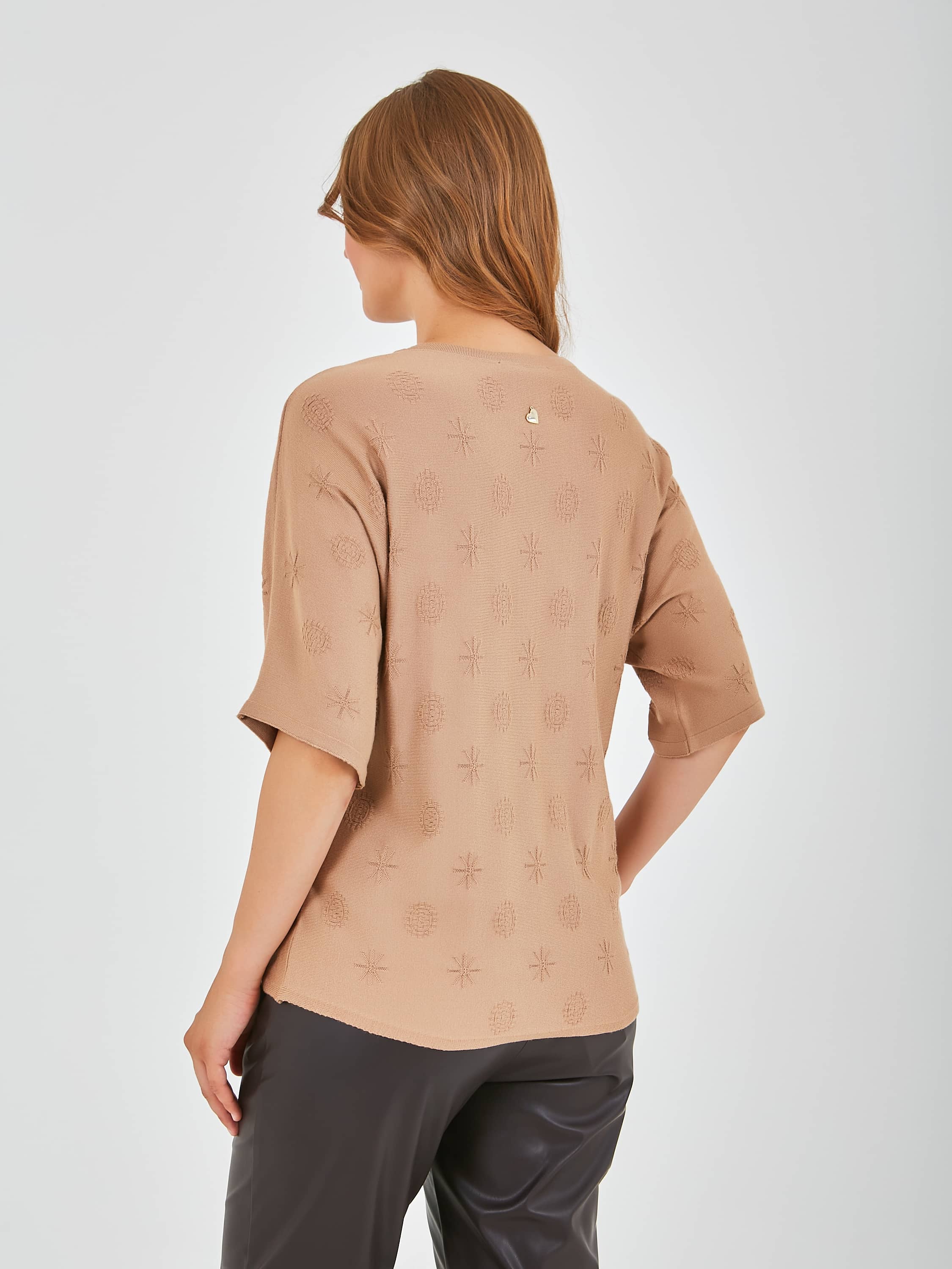Джемпер средней длины прямого силуэта из мягкой вискозы с добавлением эластана, дизайнерская особенность модели – ажурный трикотаж с имитацией карманов и стразами. Цельнокроеные рукава до локтя. Круглый вырез горловины.