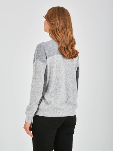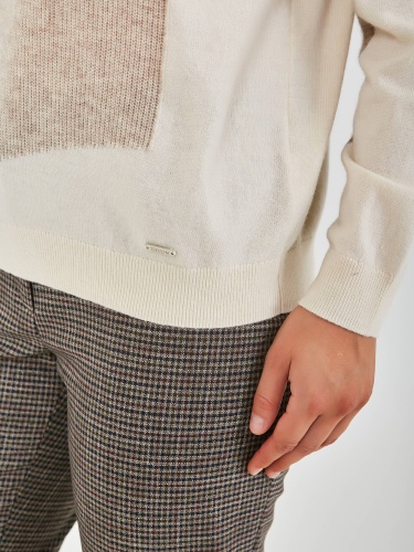 Джемпер средней длины прямого силуэта из мягкой шерсти с добавлением полиэстера и нейлона, дизайнерская особенность модели – геометрический рисунок и перфорированный трикотаж. Перед и спинка по низу обработаны манжетой. Длинные втачные рукава со спущенной линией плеча и манжетами. Воротник стойка.