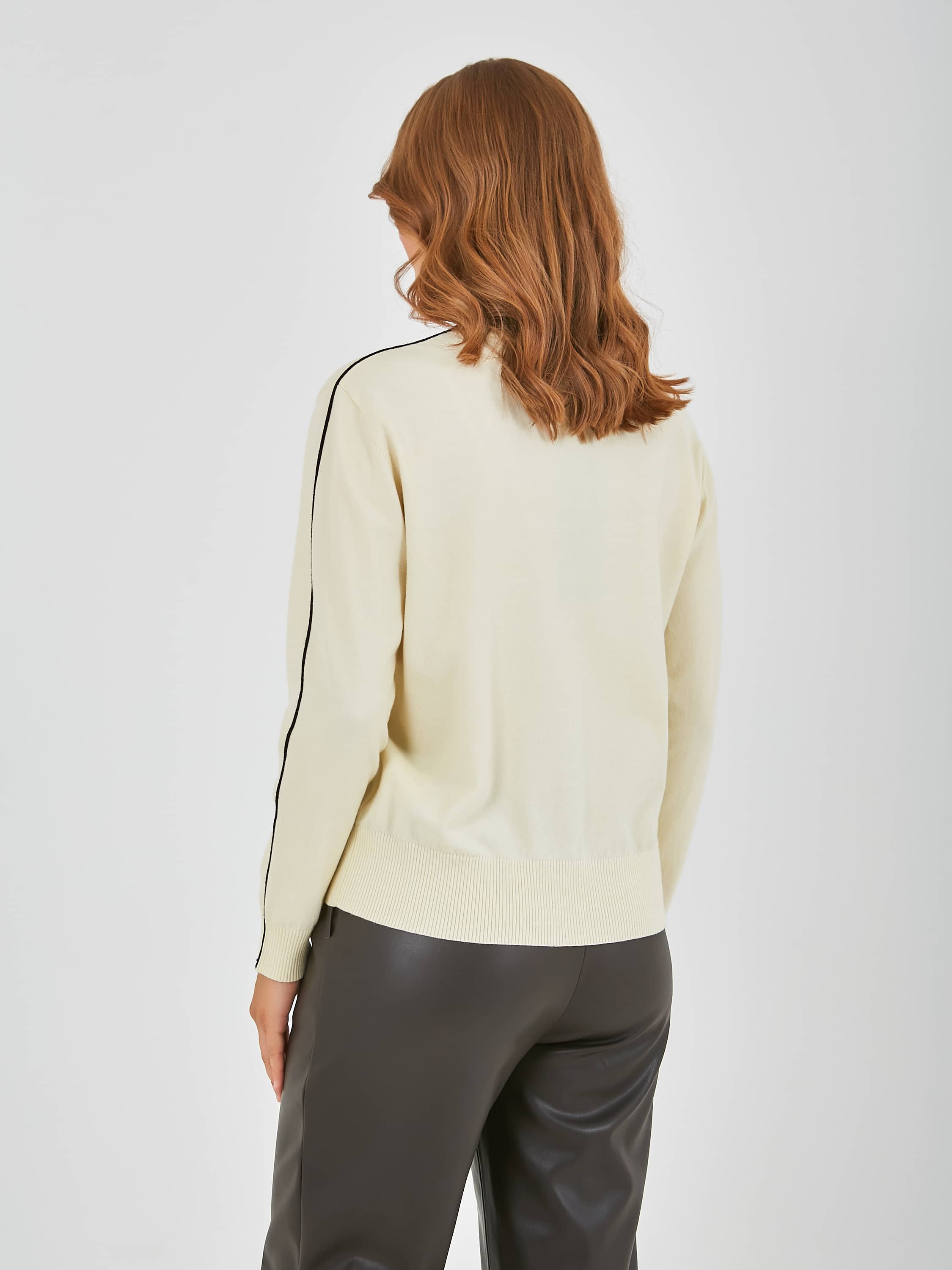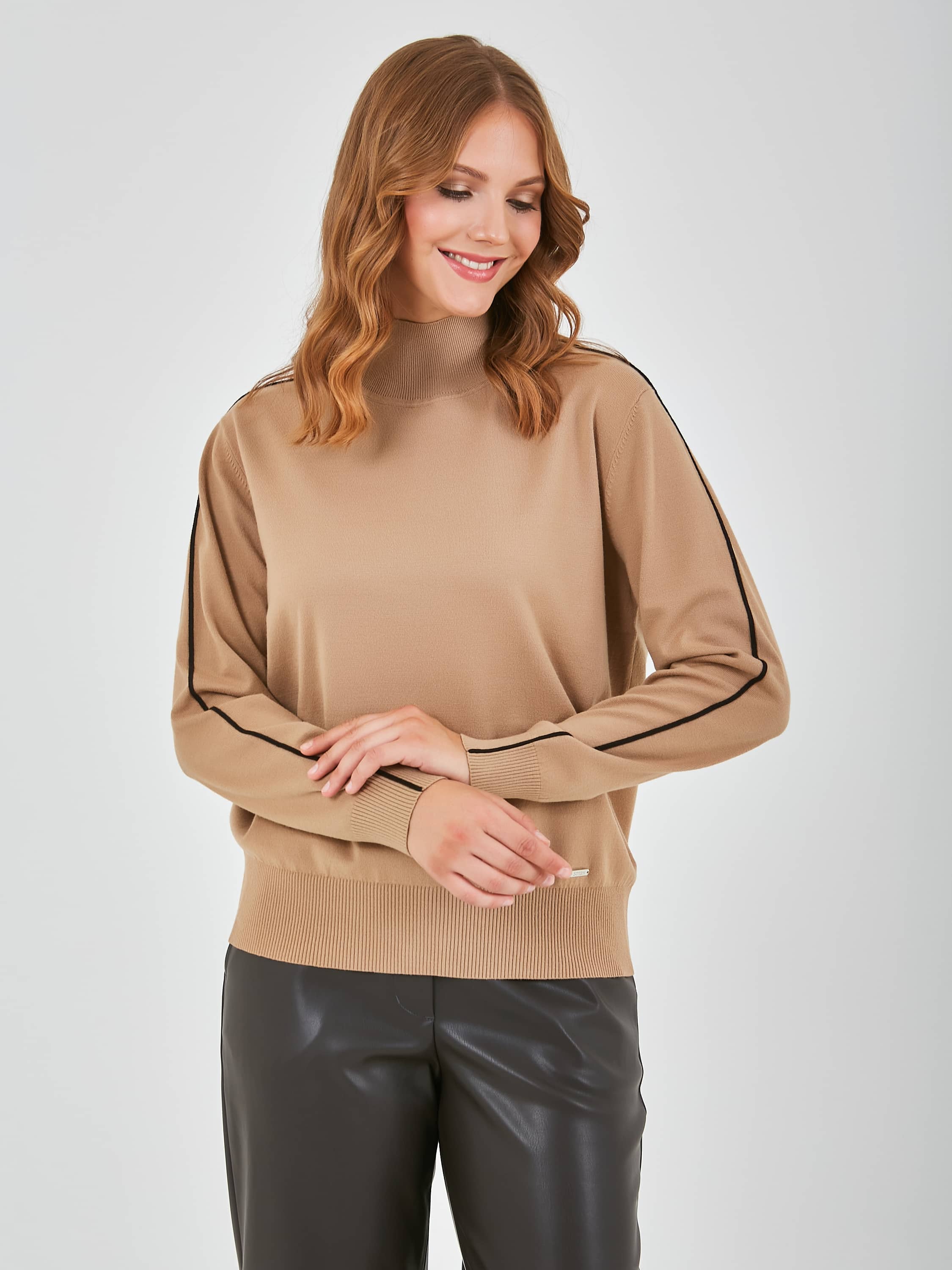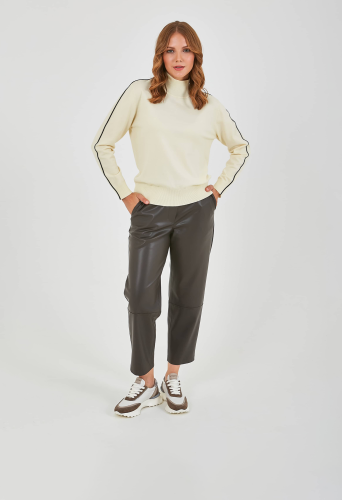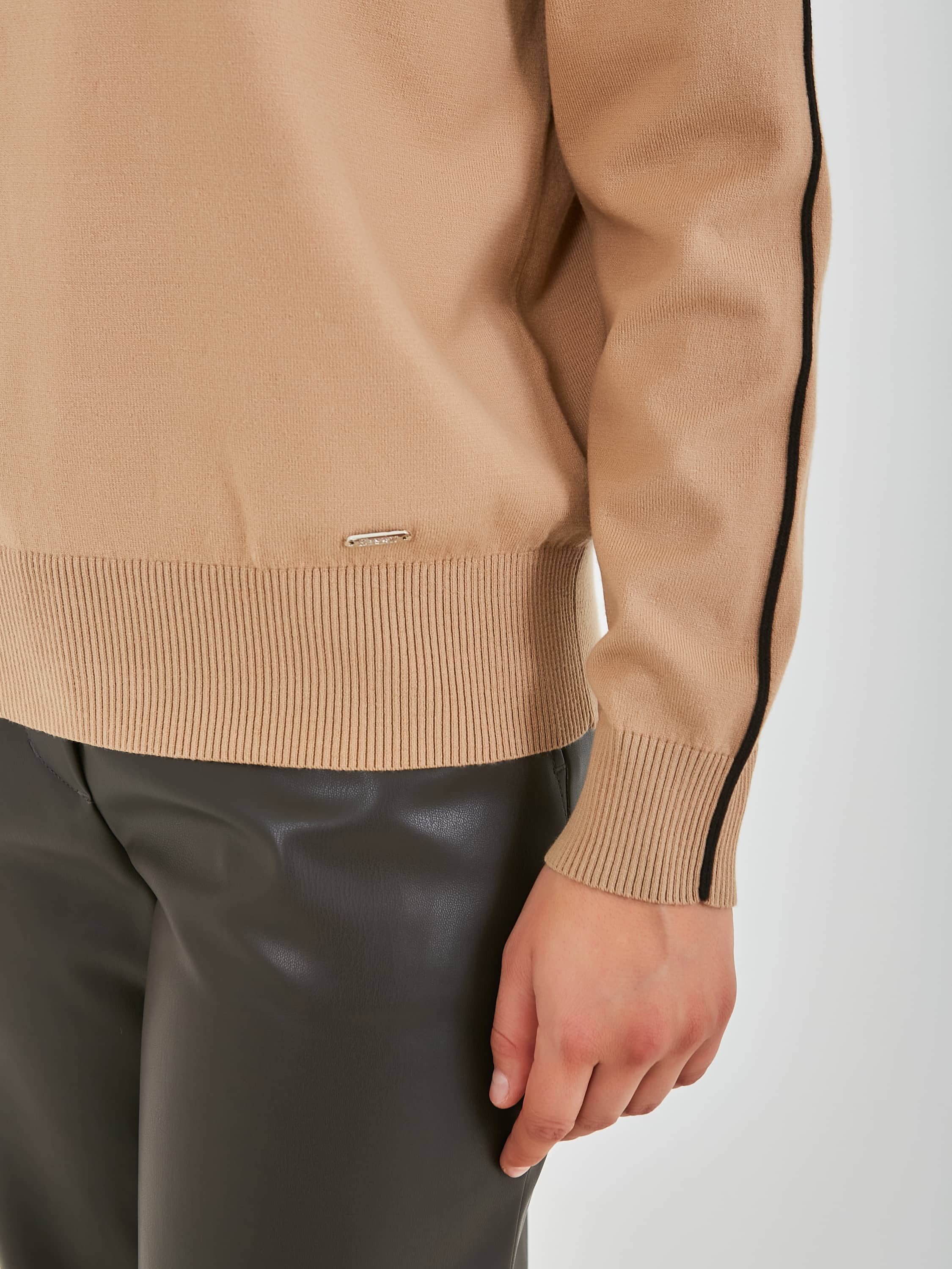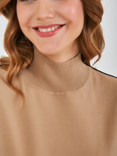 Джемпер средней длины прямого силуэта из легкого хлопка с добавлением вискозы, акрила и полиэстера, дизайнерская особенность модели - контрастный кант по всей длине рукава. Перед и спинка по низу обработаны манжетой. Длинные втачные рукава с манжетами. Воротник «хомут».