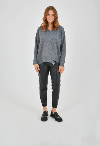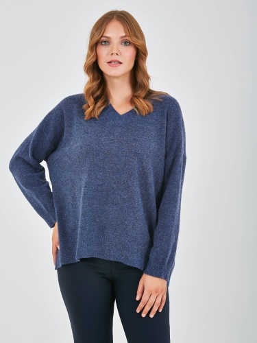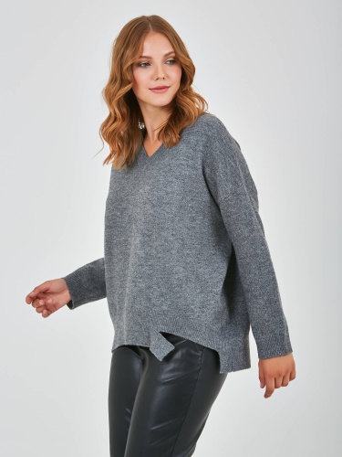 Джемпер средней длины прямого оверсайз силуэта из полиэстера, акрила, с добавлением мягкой шерсти с добавлением нейлона и акрила, дизайнерская особенность модели - эффект "драной" одежды. Перед и спинка по низу обработаны манжетой. Длинные втачные рукава со спущенной линией плеча и манжетами. V-образный вырез горловины.