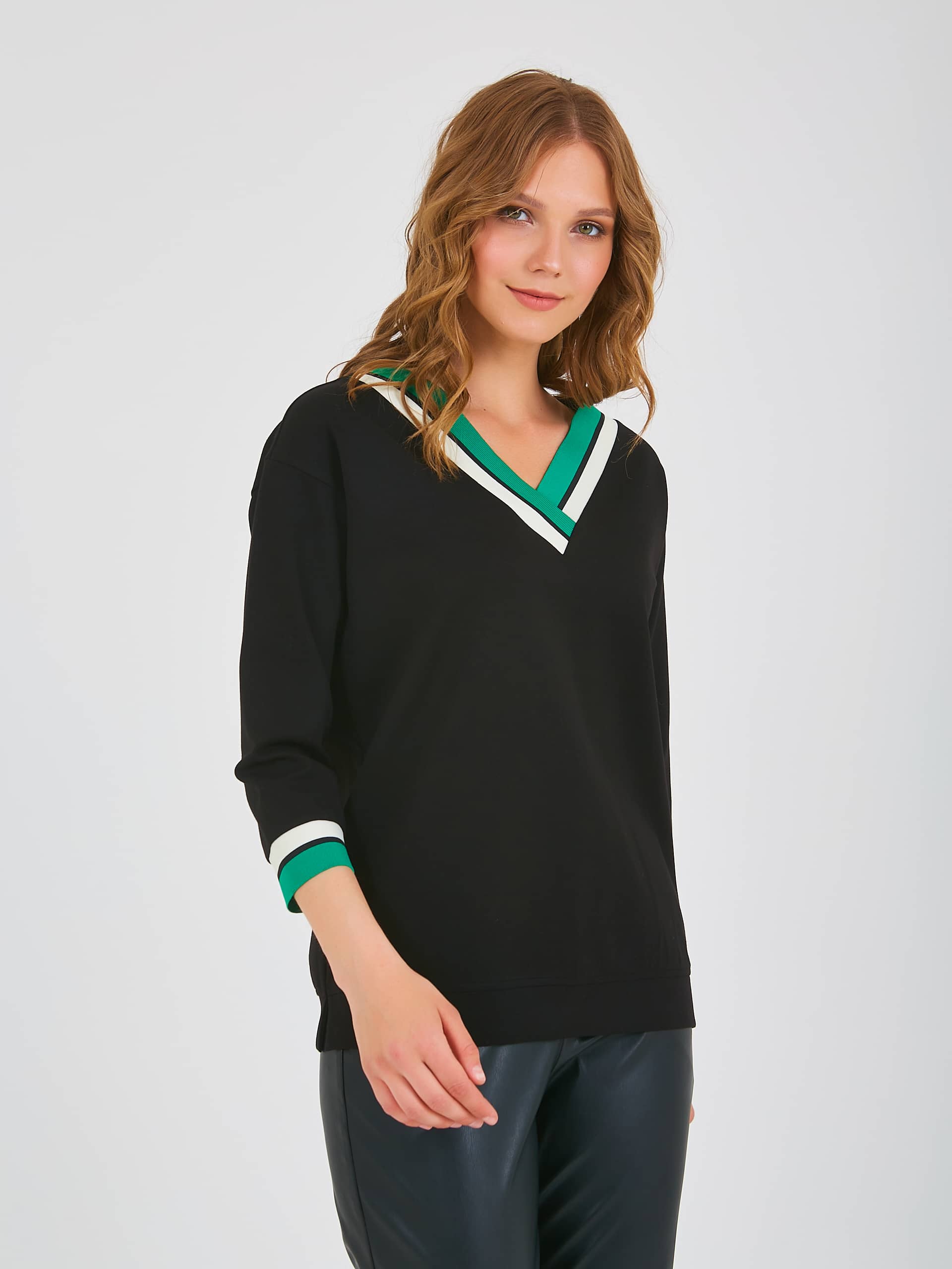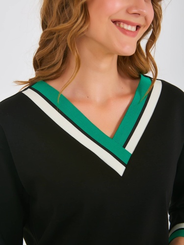 Джемпер средней длины прямого силуэта из мягкой вискозы с добавлением нейлона и лайкры, дизайнерская особенность модели – контрастный геометрический рисунок на манжетах и горловине по переду. Перед и спинка по низу обработаны манжетой с боковыми разрезами. Втачные рукава 3/4 со спущенной линией плеча с манжетами. V-образный вырез горловины.