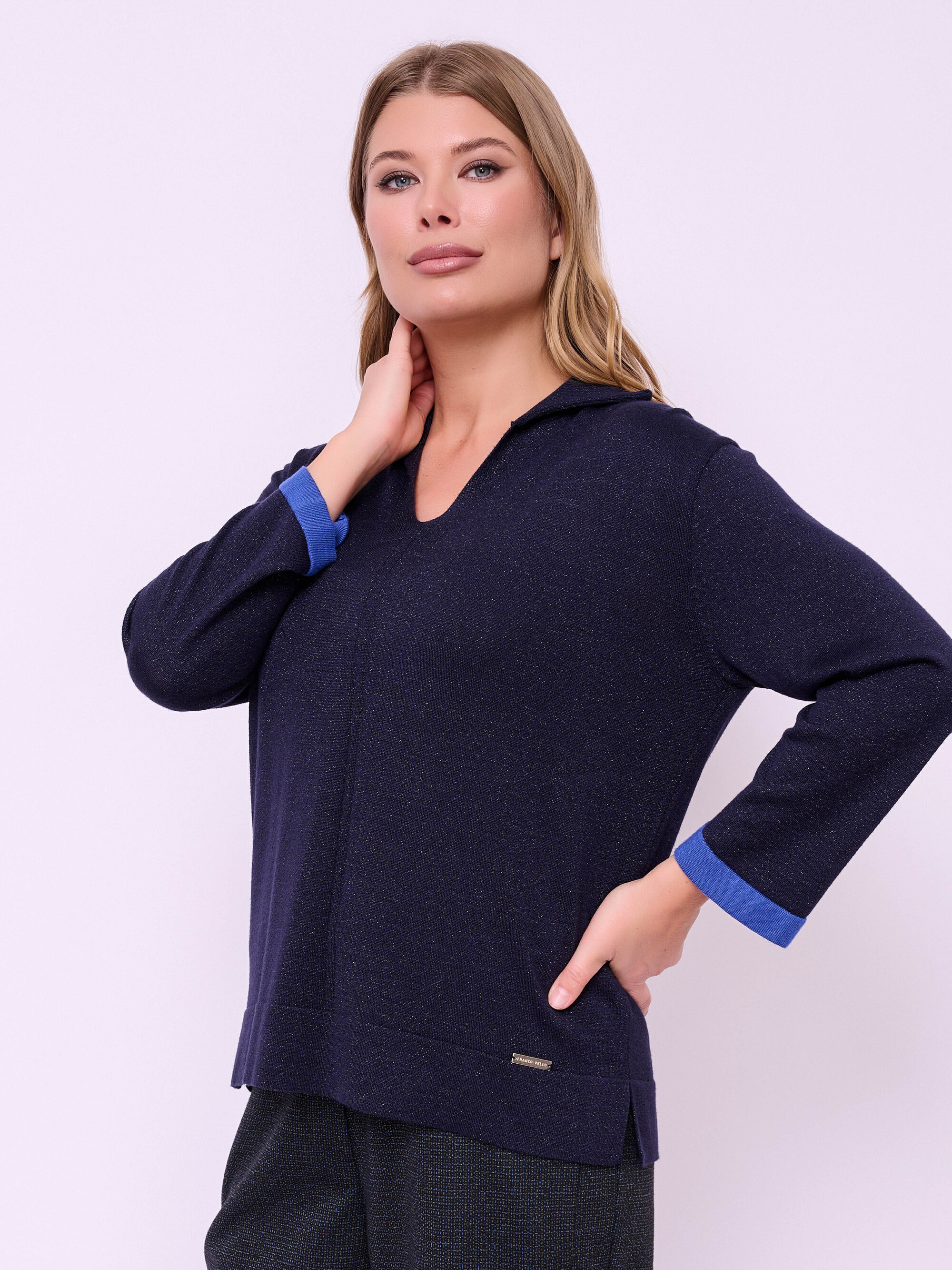 Трикотажный джемпер прямого покроя из вискозной пряжи с добавлением люрекса с отложным воротником и боковыми разрезами. Длина по спинке: 60 см.
