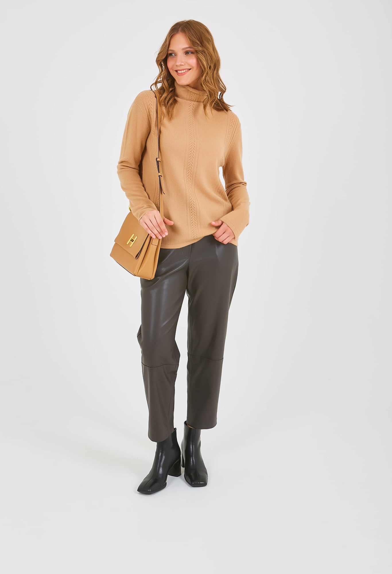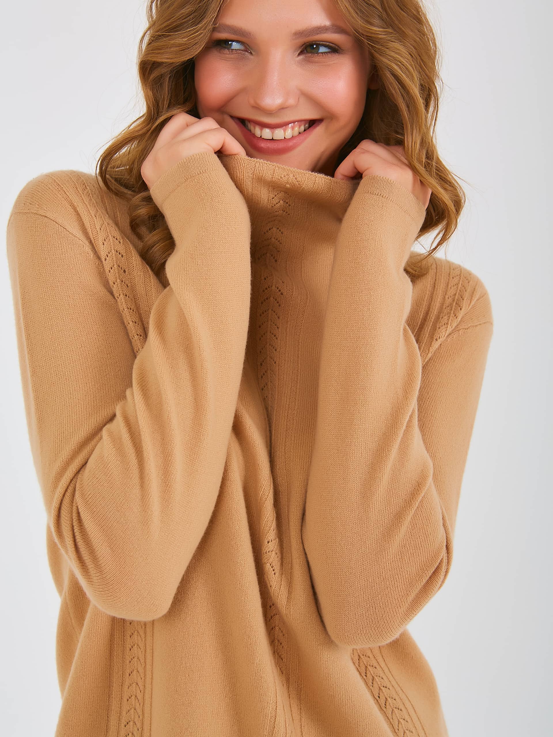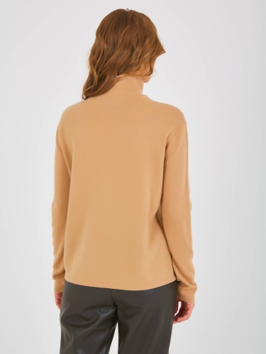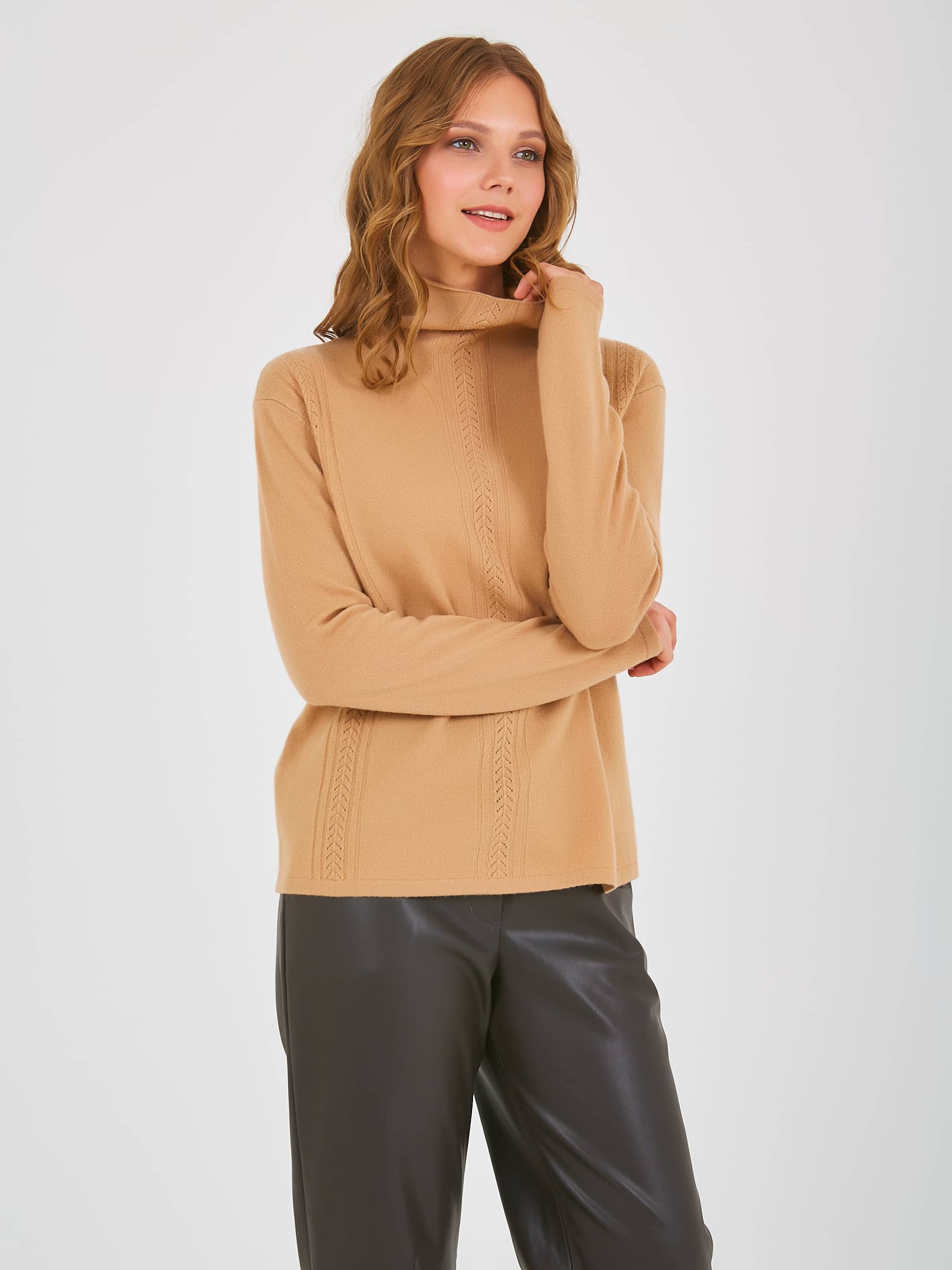 Джемпер средней длины прямого силуэта из мягкой шерсти, дизайнерская особенность модели – узорная вязка по переду. Длинные втачные рукава со спущенной линией плеча. Цельнокроеная стойка. Осень-Зима'25/26. Капсула "Хозяйка медной горы"
