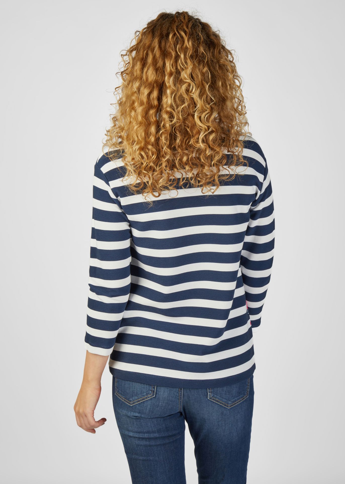 Уникальный джемпер с блочными полосками и изящно расположенными цветочными мотивами, украшенными сверкающими камнями. Толстовка впечатляет своей современной ребристой структурой и придает модный вид. Рукава 3/4 и шикарный воротник-стойка придают изделию дополнительный шарм и комфорт.