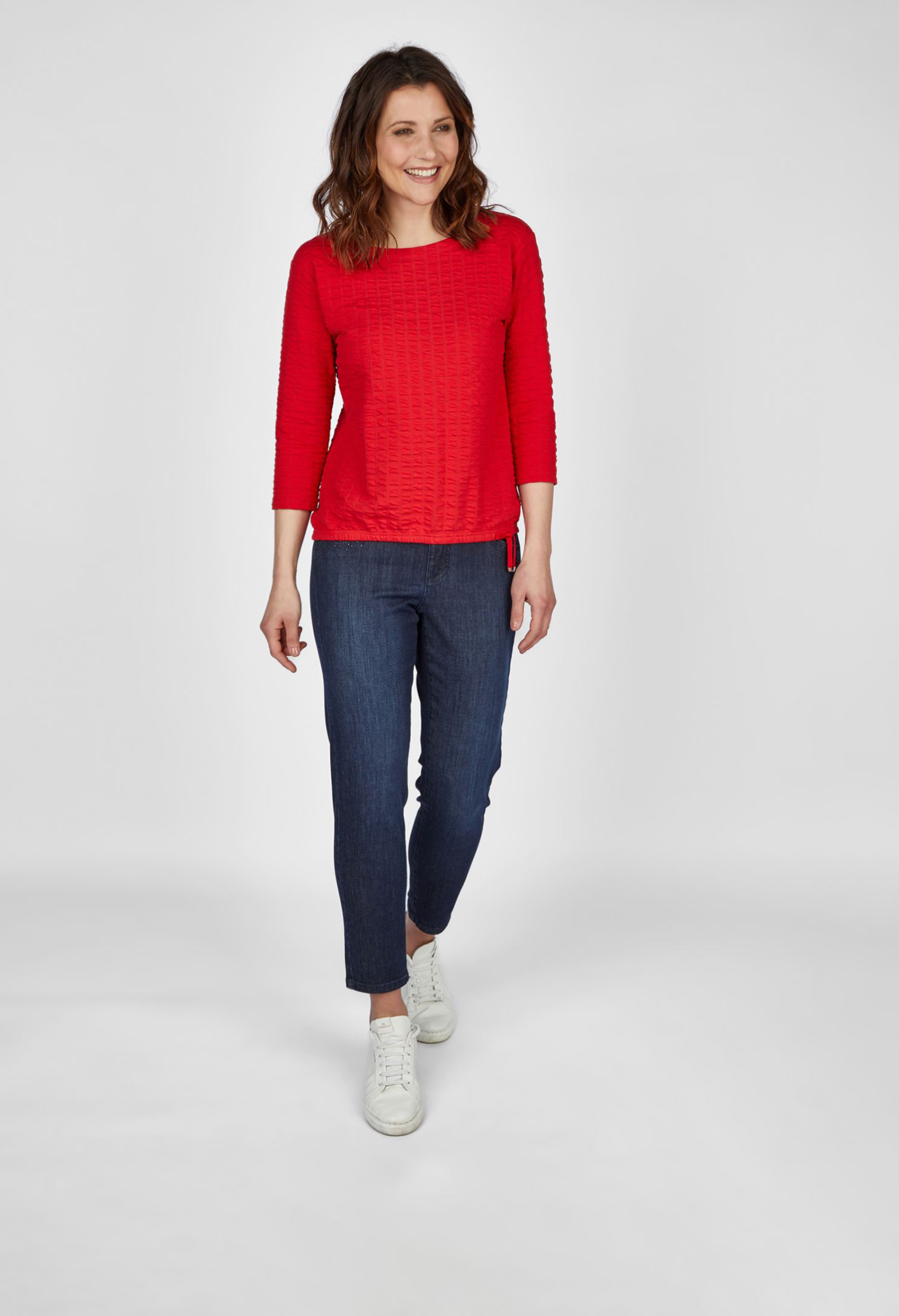 Универсальный однотонный джемпер с круглым вырезом! Этот стильный джемпер идеально подходит для любого случая и имеет удобный рукав длиной 3/4. Петли по нижнему краю придают джемперу особый вид, а структурированный материал гарантирует привлекательный вид. Прямая посадка обеспечивает оптимальную и удобную посадку. Длина спинки от плеча для 44 размера: 62см.