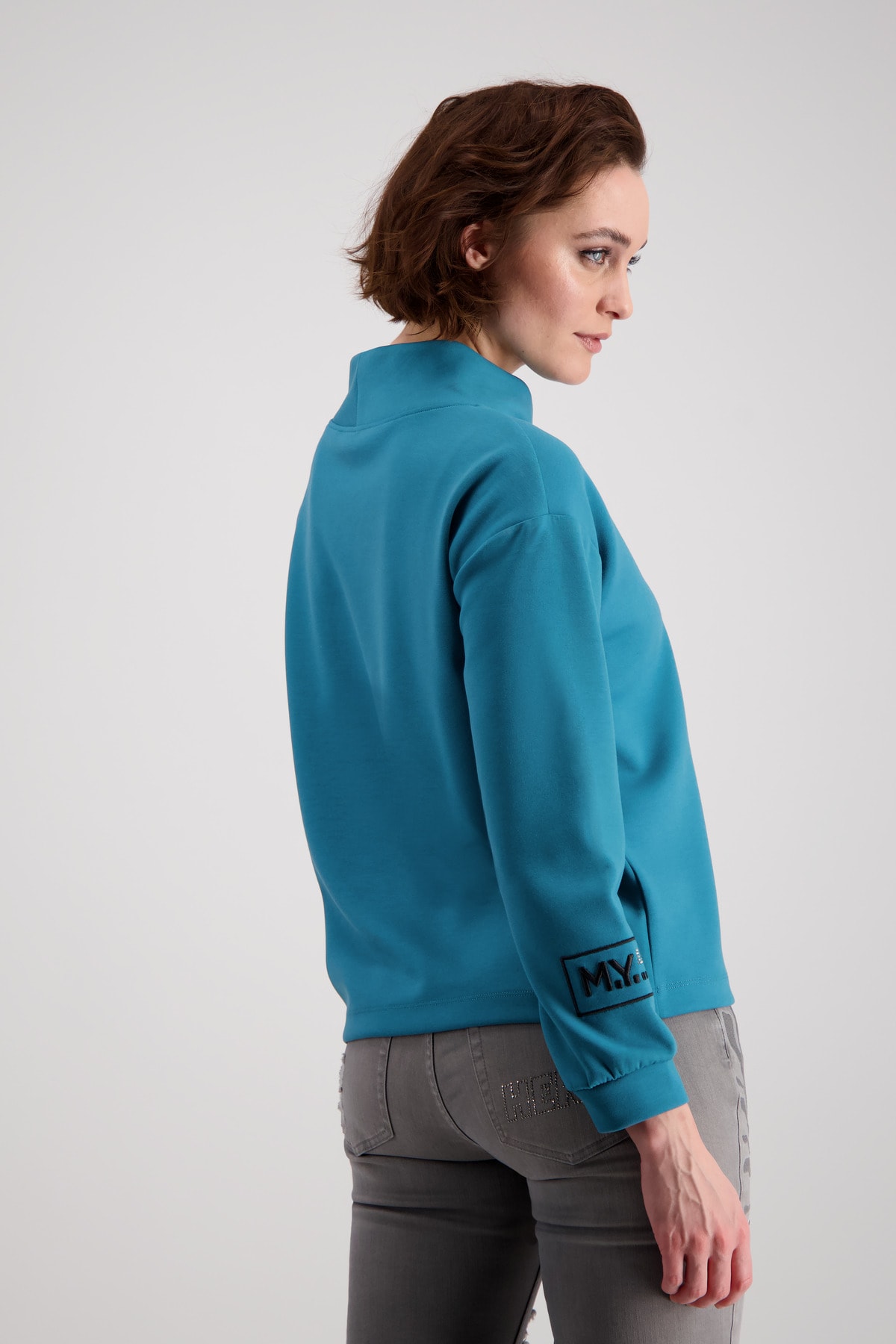 Повседневный свитер с длинными рукавами выполнен из мягкого, приятного на ощупь материала, эластичного и женственного вида. На правом рукаве и спереди модная нашивка с вышивкой и стразами. Длина 44 размера 62 см.