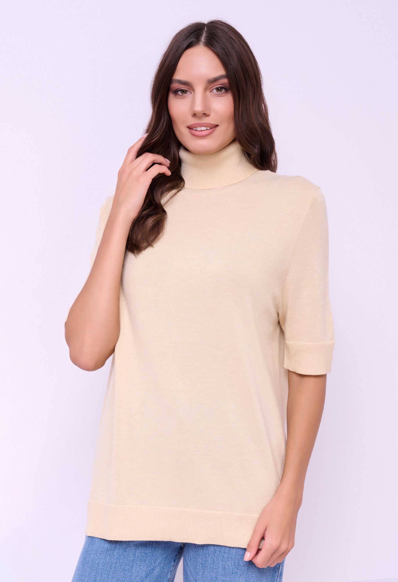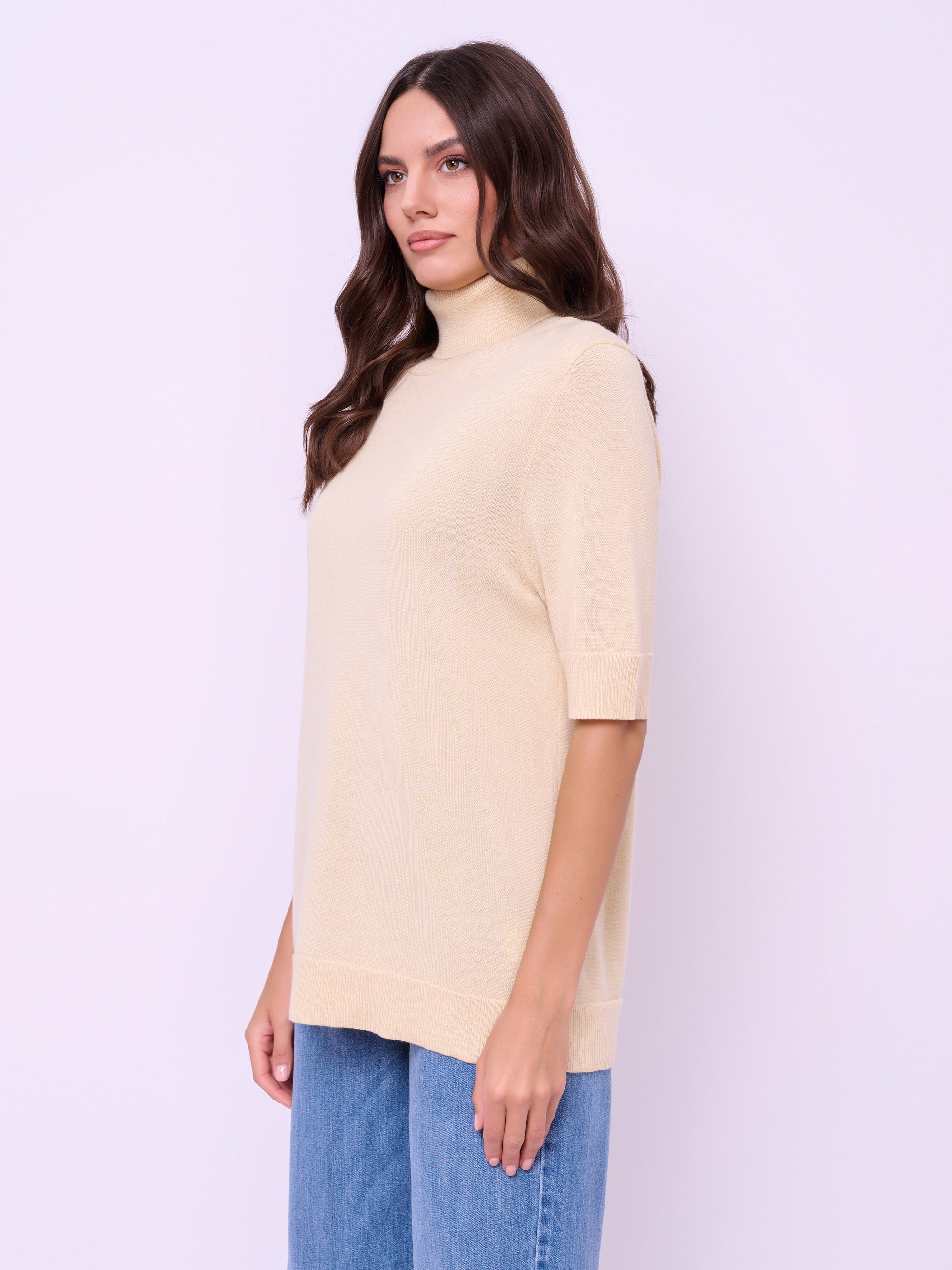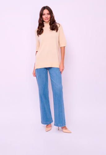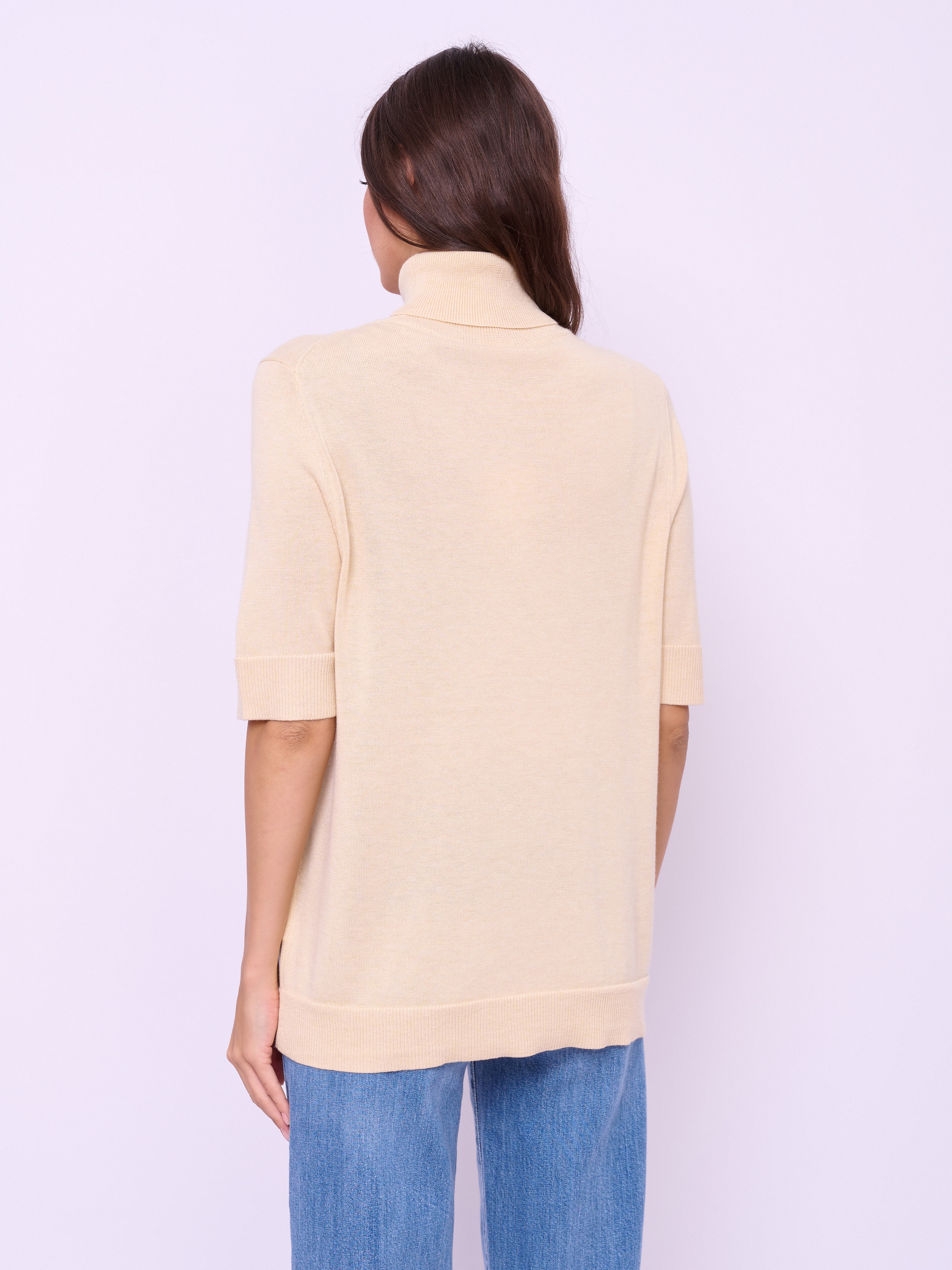 Детали: мягкая пряжа, вырез горловины воронка, рукава 1/2, покрой прямой, без рисунка. Длина по спинке: 67 см.