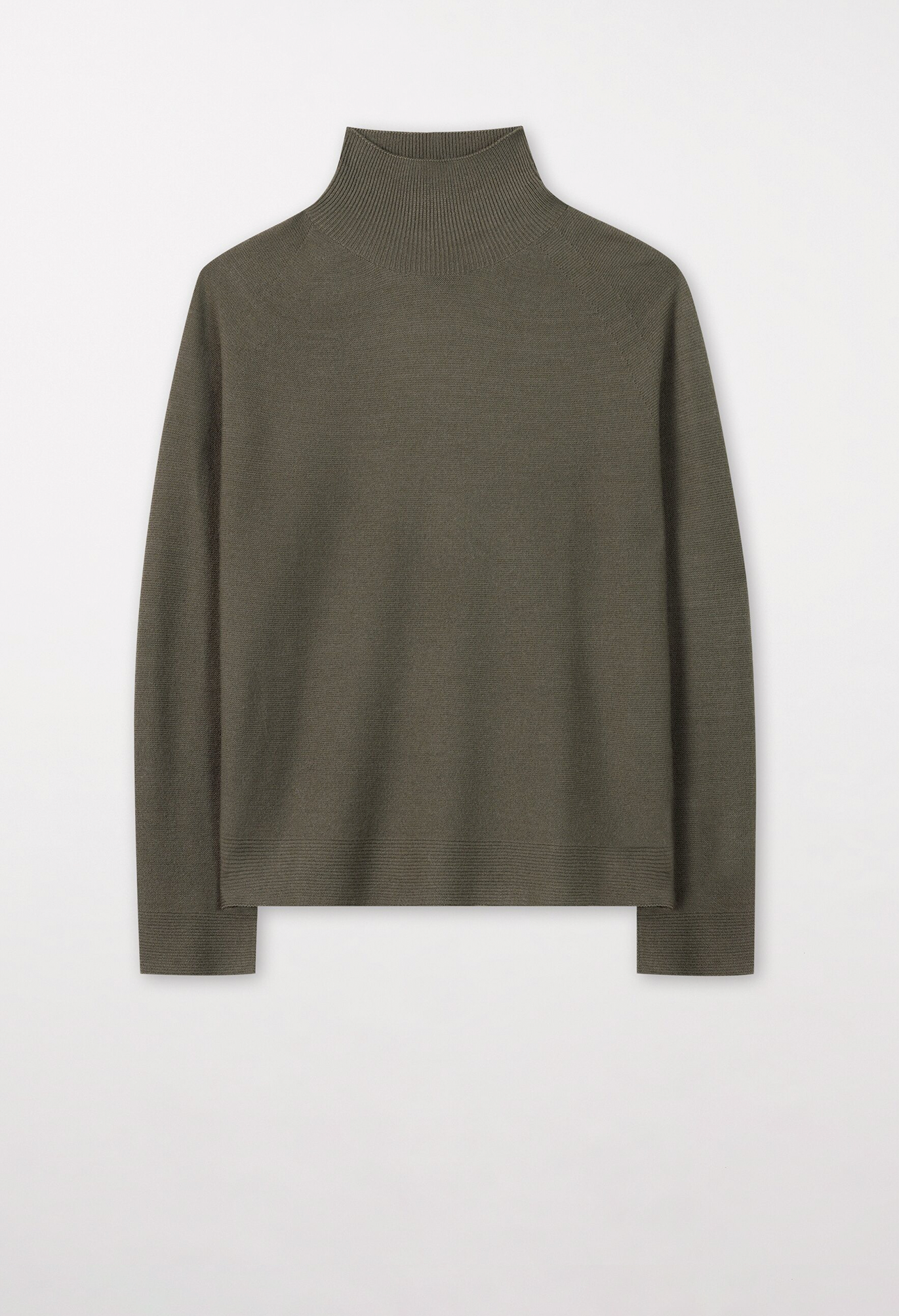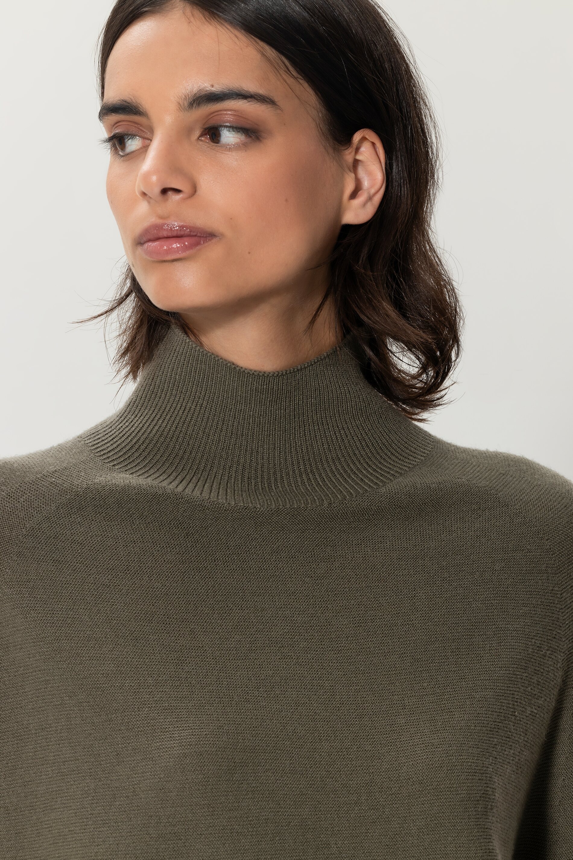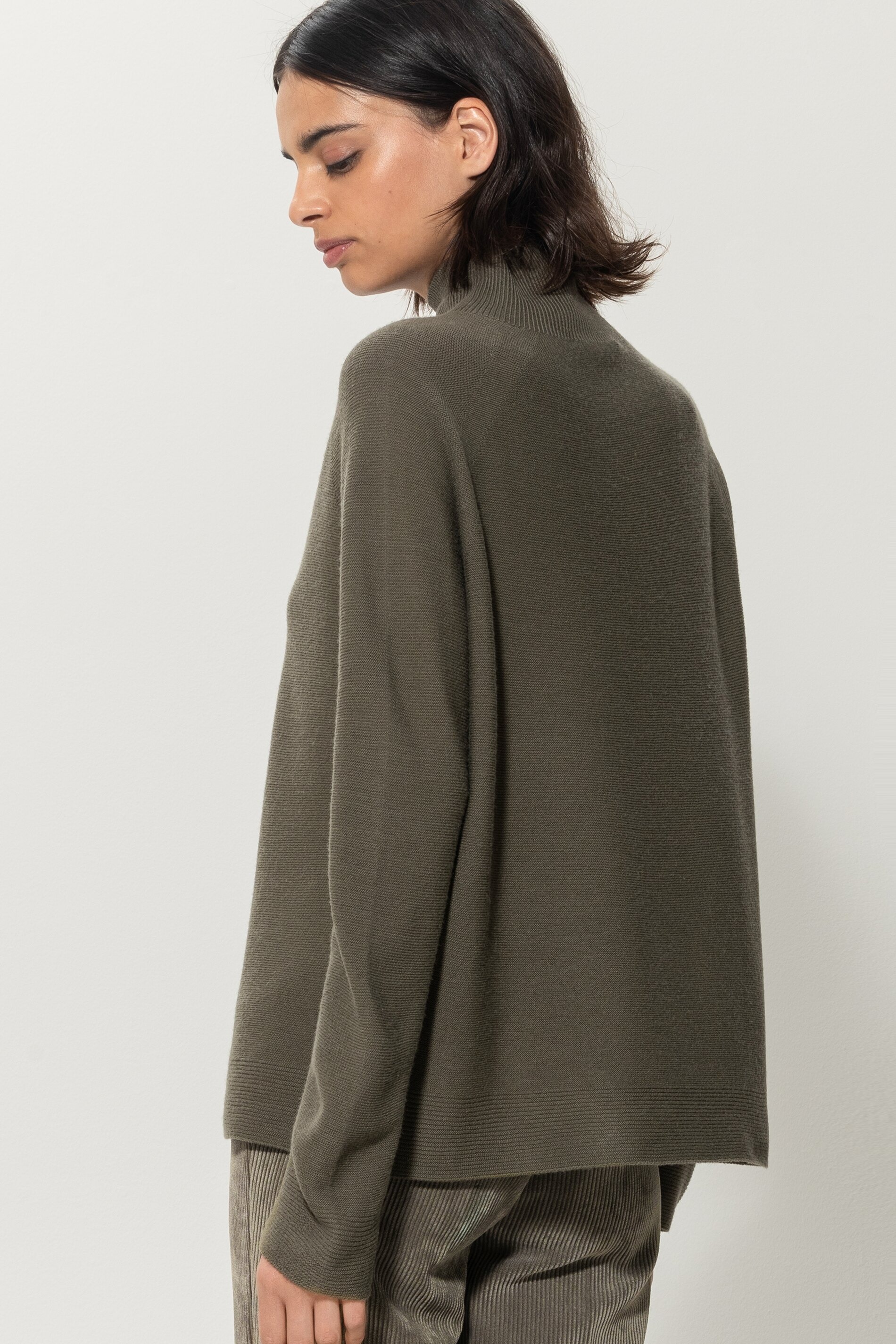 Повседневный пуловер из легкой смесовой шерсти тонкой вязки. Ложный воротник-стойка, рукава реглан и разрезы по бокам завершают этот современный дизайн.