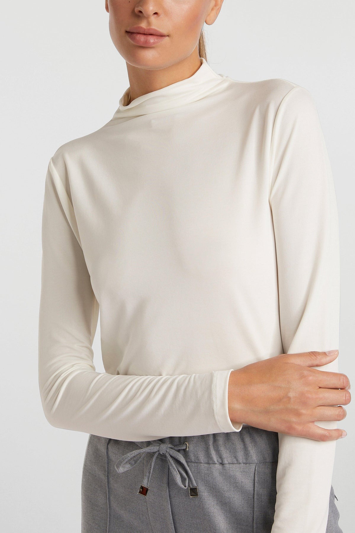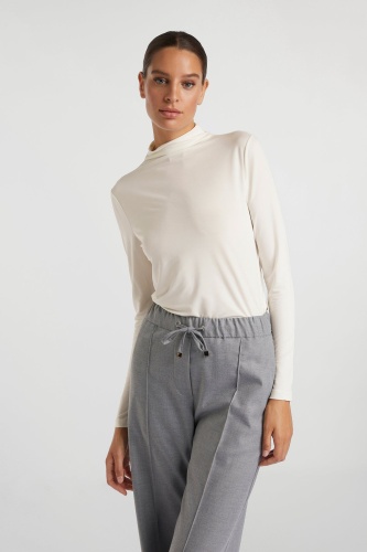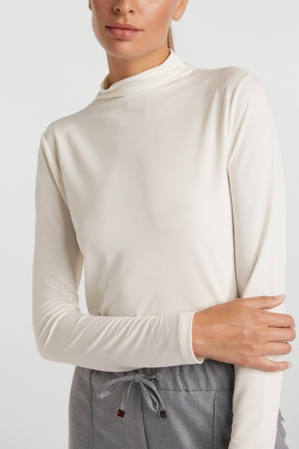 Водолазка изготовлена из нежного и мягкого материала. Модель имеет облегающий силуэт. Вырез на воротнике-водолазке придает ему особый шарм.