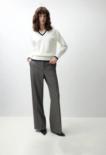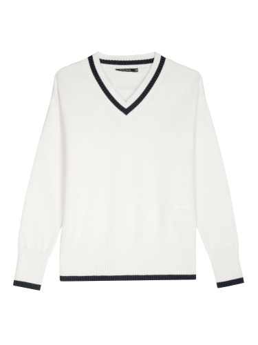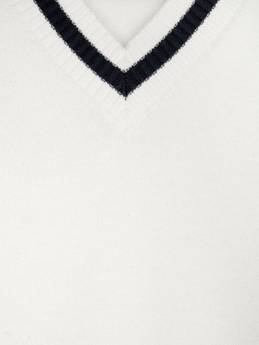 Джемпер с V-образной горловиной в нежно-белом оттенке из 100% хлопка, актуален в любое время года. Тонкая темно-синяя отделочная полоса придаст легкие морские нотки и будет выразительно смотреться с синими низами.