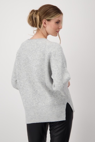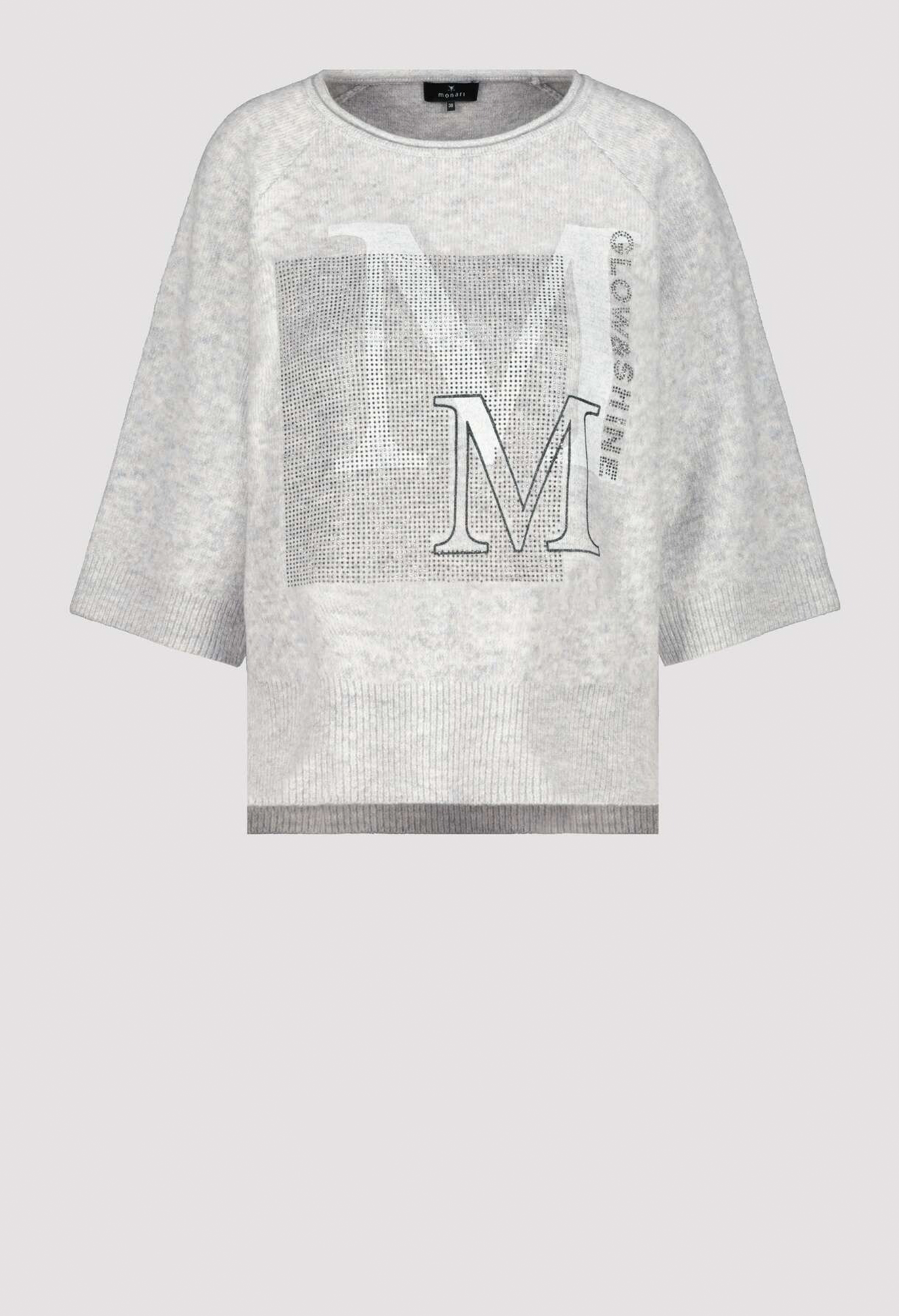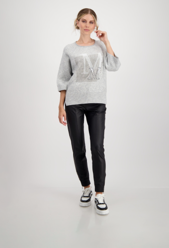 Свитер впечатляет очень мягкой поверхностью и большим прямоугольником из стразов с буквами и дополнительной надписью из стразов спереди. Круглый вырез горловины с закругленным краем. Рукава реглан 3/4. Ребристые рукава и низ корпуса. Удлиненная спинка с разрезами по бокам. Длина 44 размера по спинке составляет 65 см, длина по переду - 61 см.