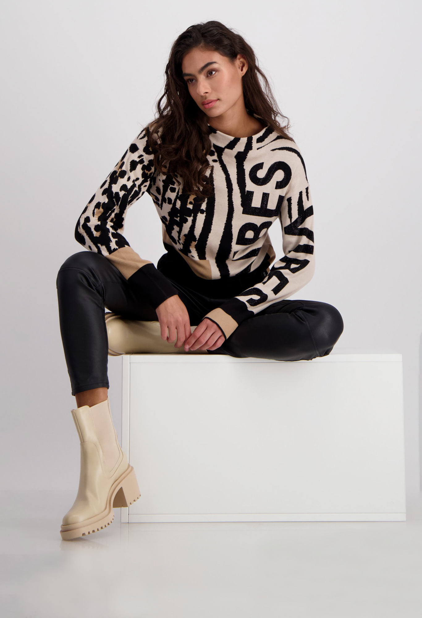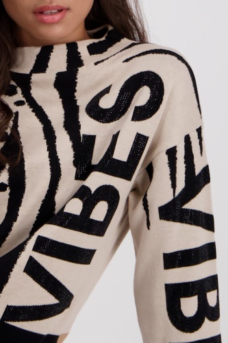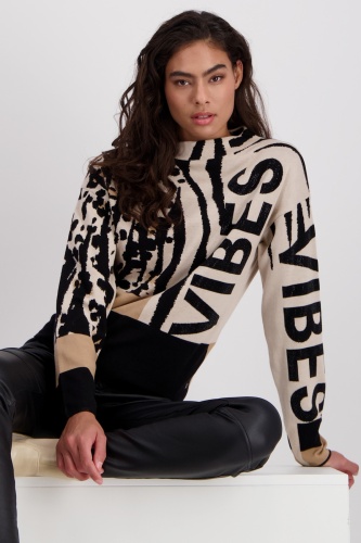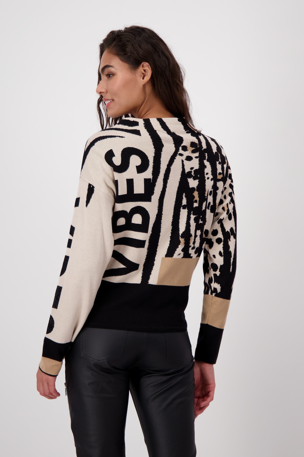 100% хлопок гарантирует высокое качество ношения. Свитер имеет интересный жаккардовый узор, напоминающий животное, с надписями и цветовыми блоками. Регулярная посадка, воротник-стойка. Длинные рукава с вырезом. Длина 44 размера 60 см.