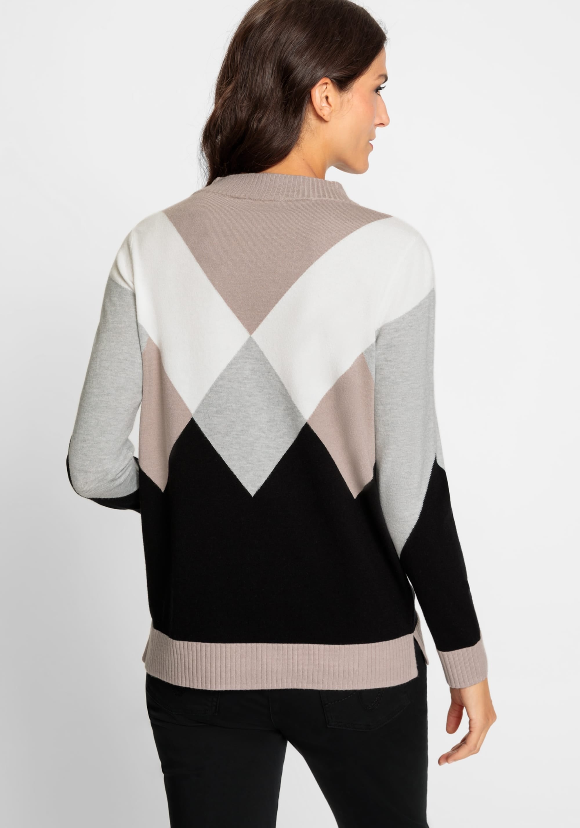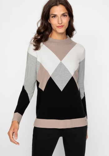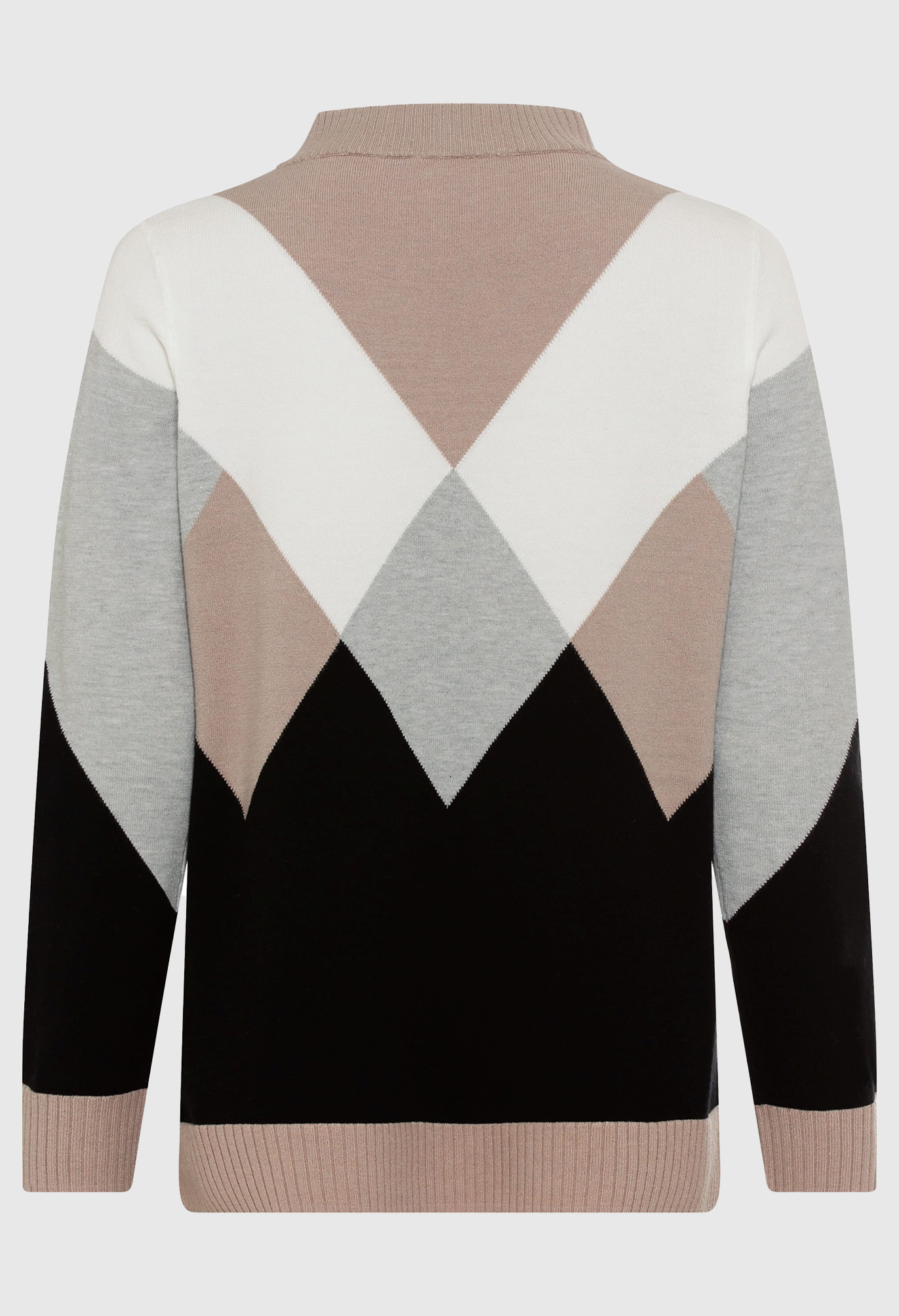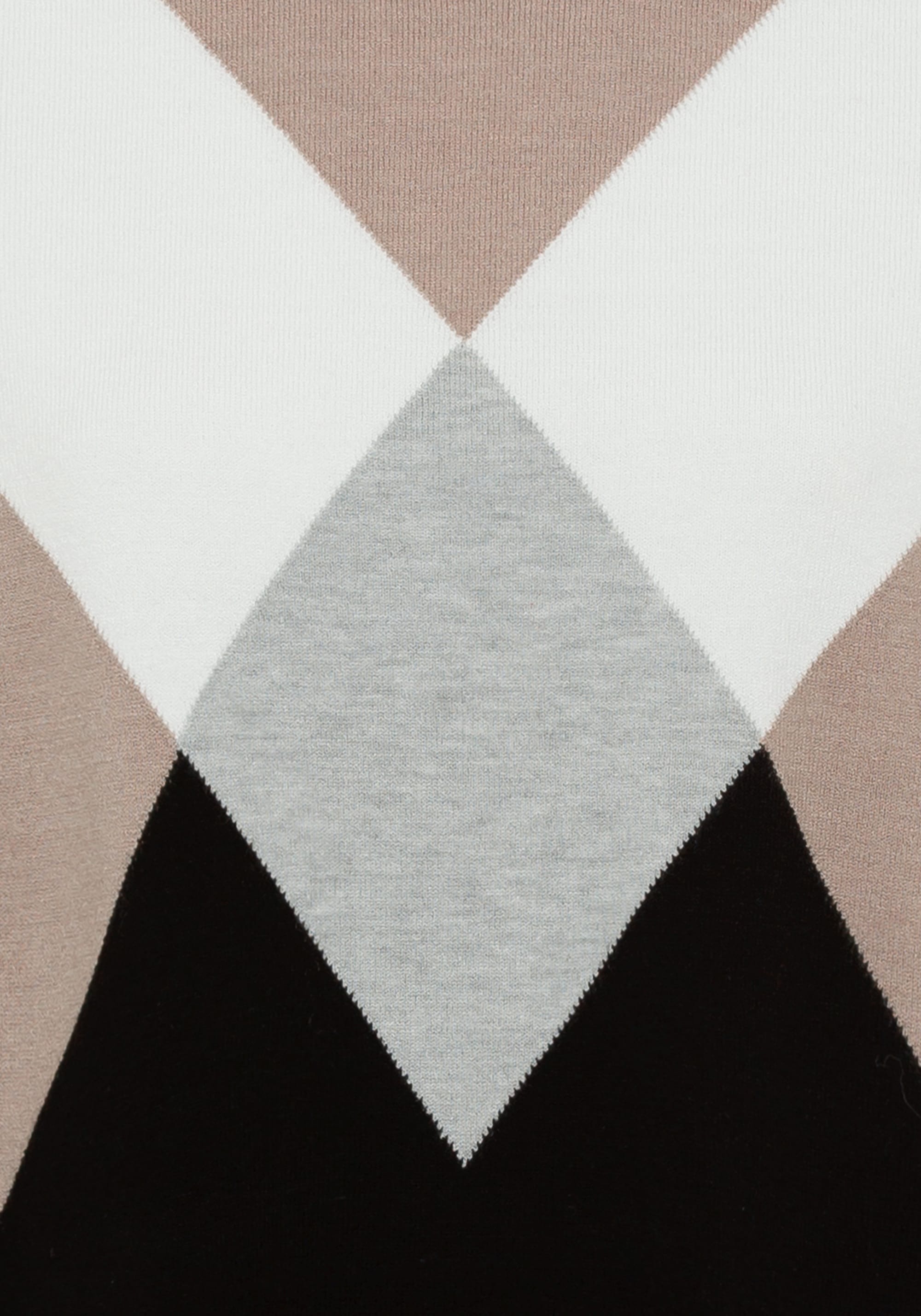 Нейтральные оттенки сочетаются в классическом ромбовидном узоре на этом бархатистом, мягком и тонком пуловере. Рельефная отделка окаймляет воротник, манжеты и подол. Модель имеет прямой крой и слегка прилегает к телу.