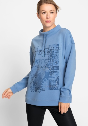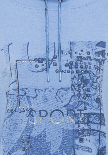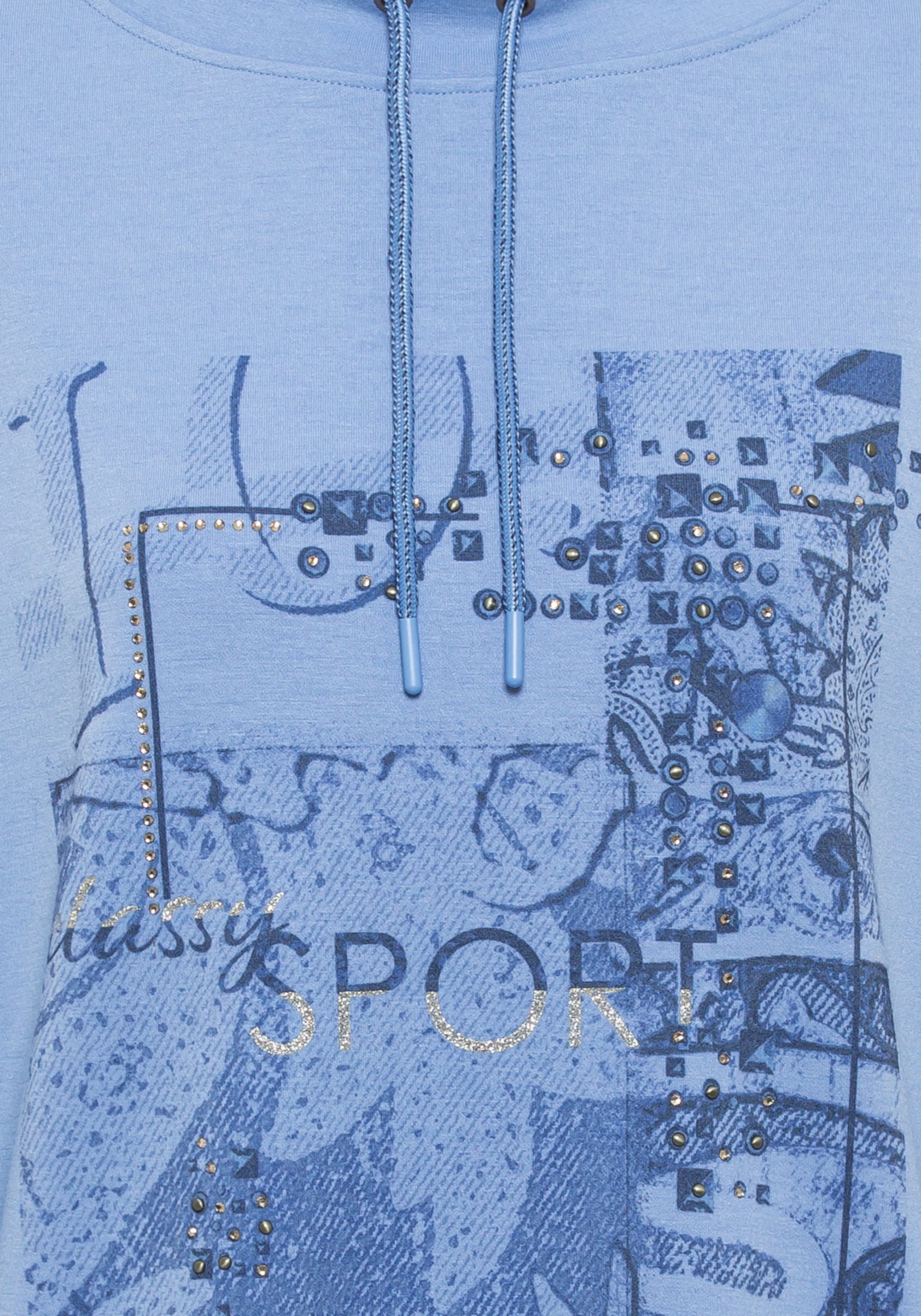 Мягкий спортивный джемпер с графическим принтом, украшенным разнообразными стразами, придающими много блеска. Модель слегка большего размера, с гладкой рукояткой и функциональной кулиской на воротнике-воронке. , которая свободно и непринужденно прилегает к телу.