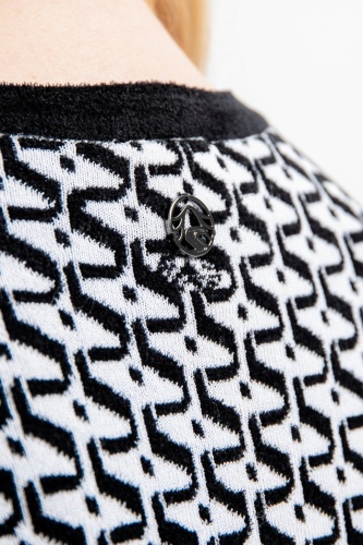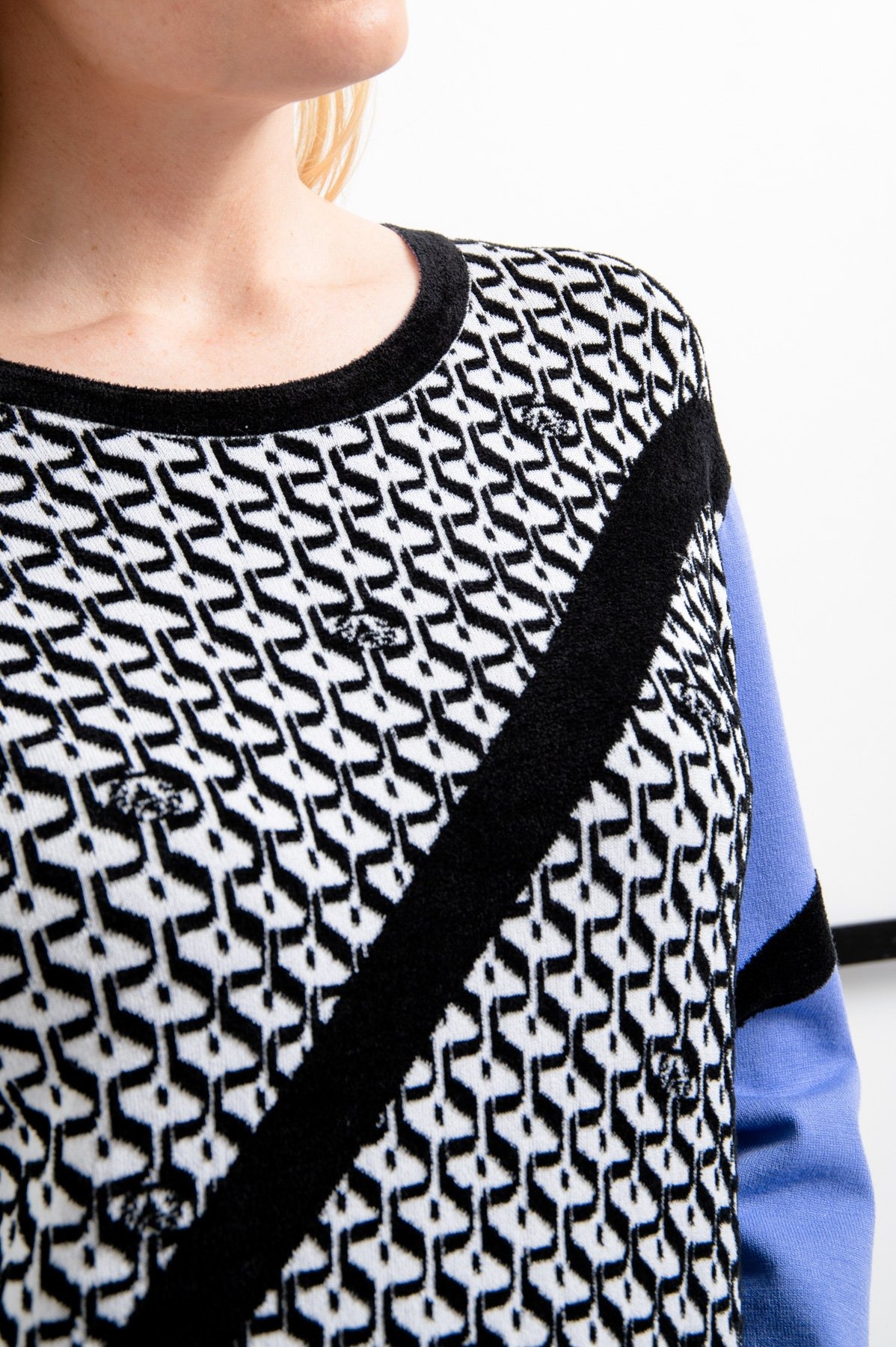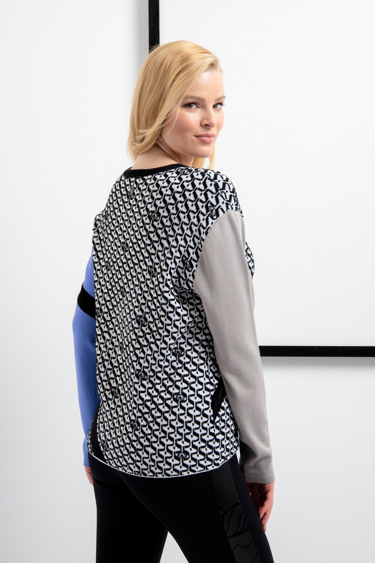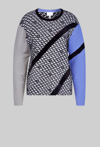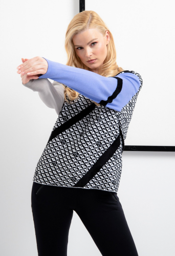 Свитер, изготовленный из сочетания высококачественных и мягких материалов. Графический жаккардовый дизайн спереди и сзади со встроенными логотипами Sportalm и полосками поражает воображение. Рукава разного цвета завершают модный образ. На спине ниже горловины прикреплена качественная металлическая бирка Sportalm. Длина спины в размере 42 - 60 см.