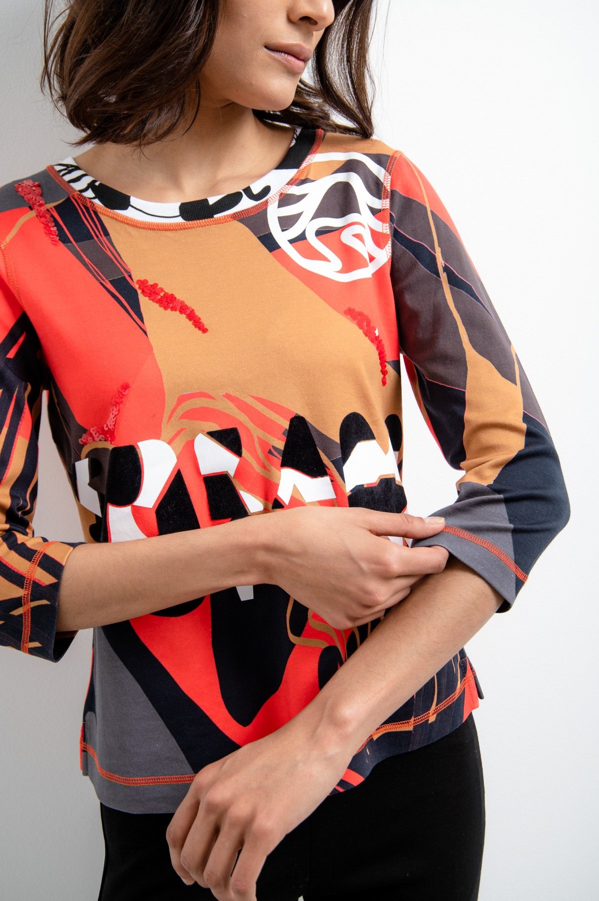 Джемпер с принтом по всей поверхности свободного кроя. Круглый вырез дополнен ребристой манжетой с принтом. Также имеется модная надпись Sportalm спереди, а левое плечо украшено логотипом Sportalm, выполненным из сочетания глянцевого и флока. Контрастные декоративные швы придают джемперу спортивный вид. В боковом шве имеются небольшие разрезы.