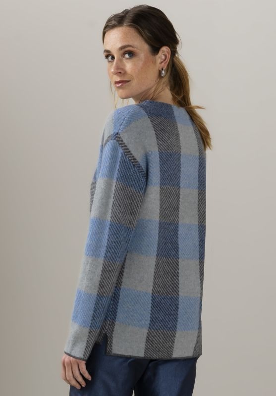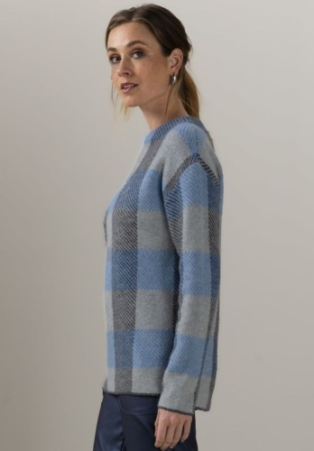 Вязаный свитер с оригинальным рисунком и длинными рукавами модных цветов. Изготовлен из мягкого плотного трикотажа с добавлением шерсти. Круглый вырез горловины и слегка удлиненная спинка. Прямой и повседневный крой. Длина модели в 44 размере - 62 см.