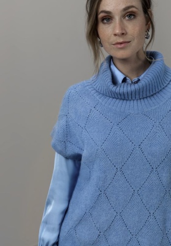 Вязаный свитер с короткими рукавами внахлест. Высококачественная смесь материалов с содержанием шерсти. С широким ребристым краем. Прямой свободный крой с боковыми разрезами по низу. Длина модели в 44 размере - 63 см.