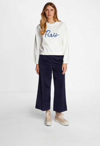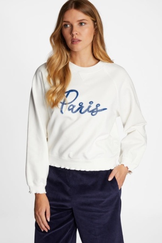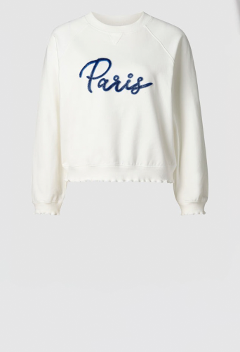 Толстовка изготовлена из удобного органического хлопка и имеет ребристый пояс с рюшами и аппликацию «Париж». Широкий силуэт дополнен рукавами реглан. Длина для размера 42: 54 см. Окружность груди для размера 42: 102 см.