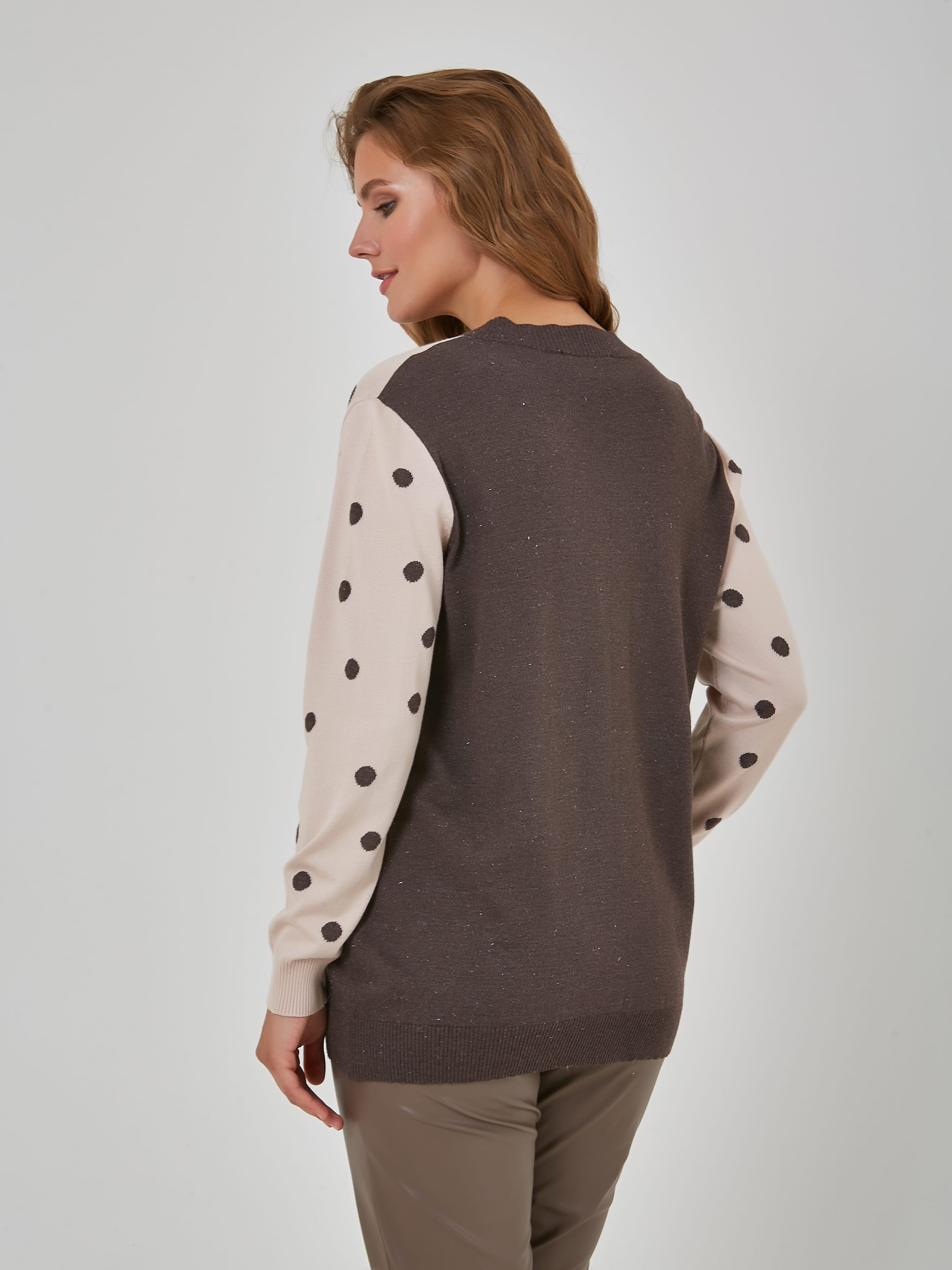 Уютный кардиган в теплых кофейных тонах с накладными карманами и широкой резинкой по низу.