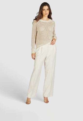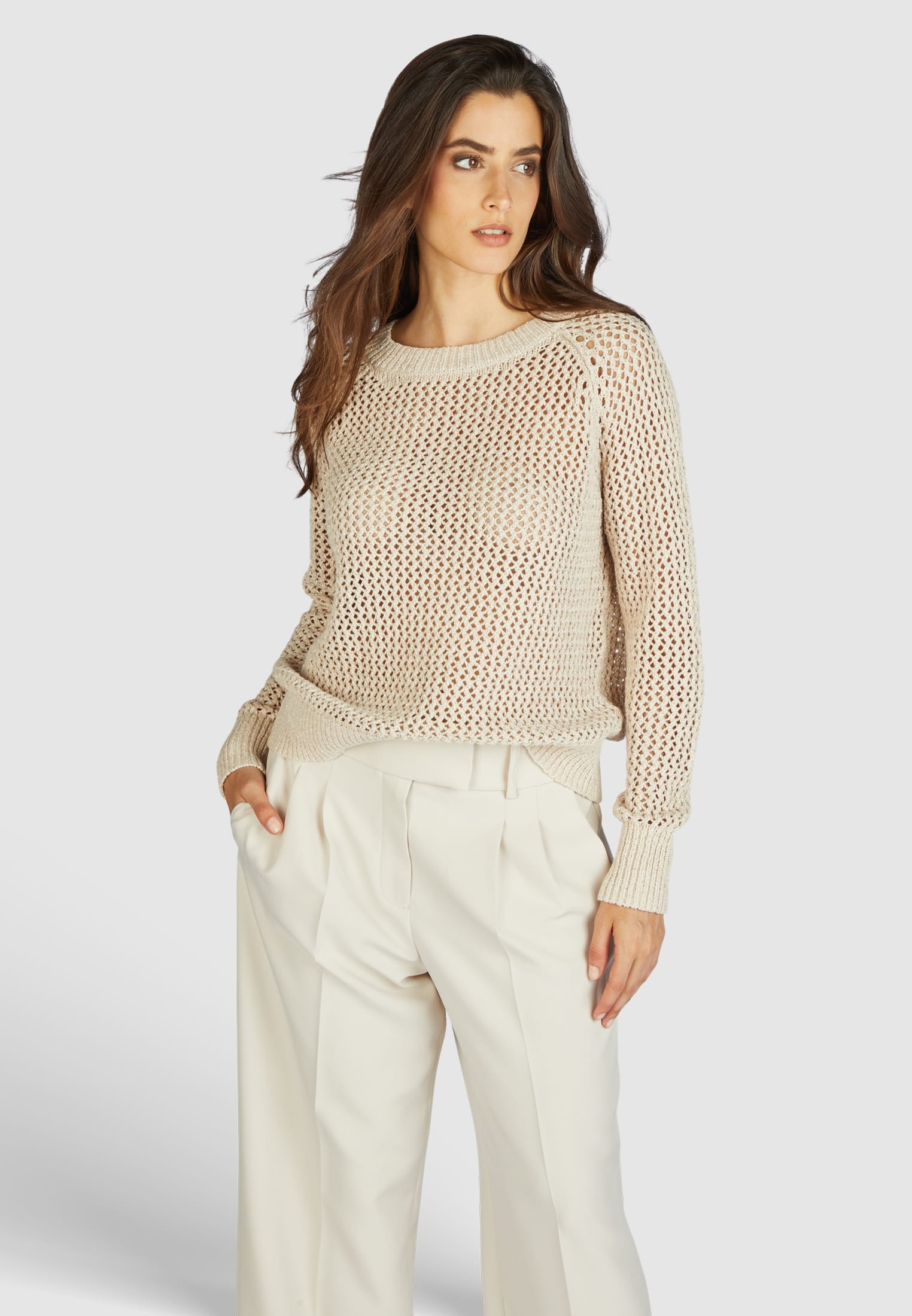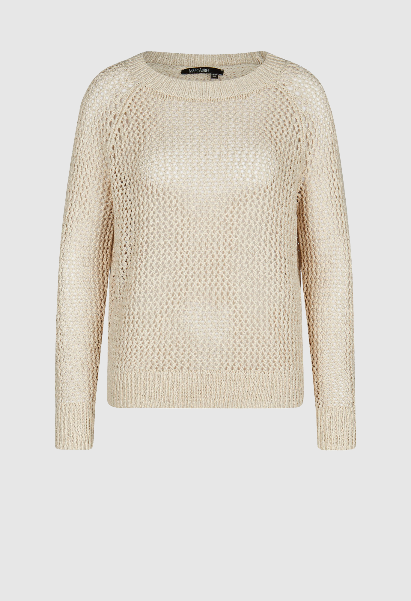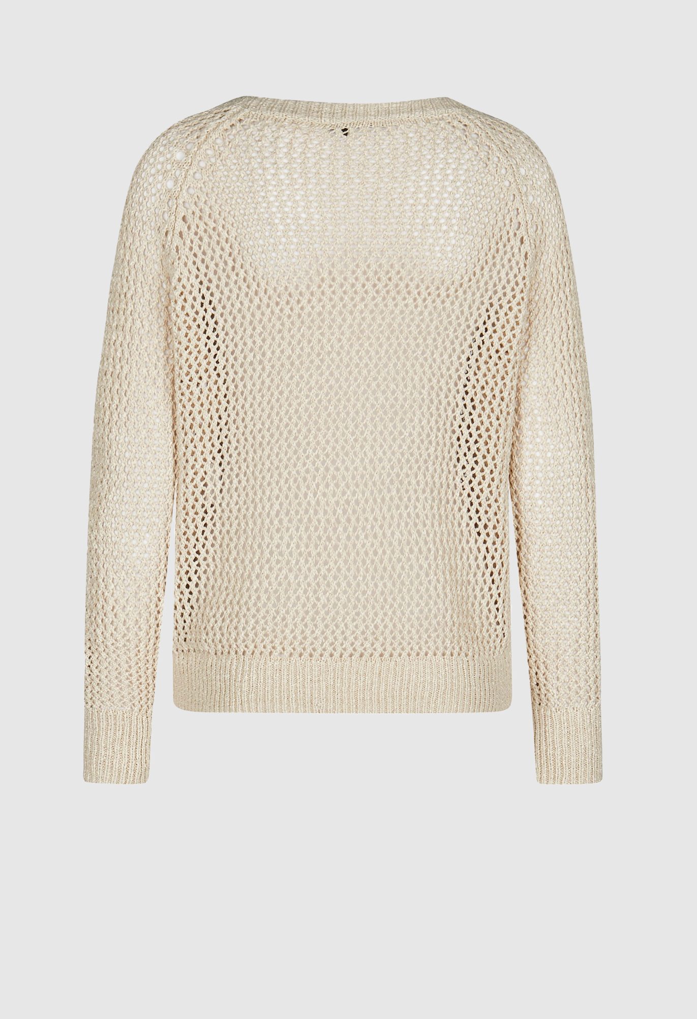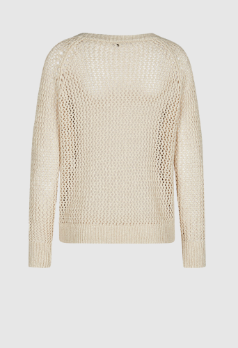 Свитер с круглым вырезом и сетчатой структурой по всей поверхности обрамлен ребристыми краями. Он изготовлен из смеси хлопка с использованием хлопка.
