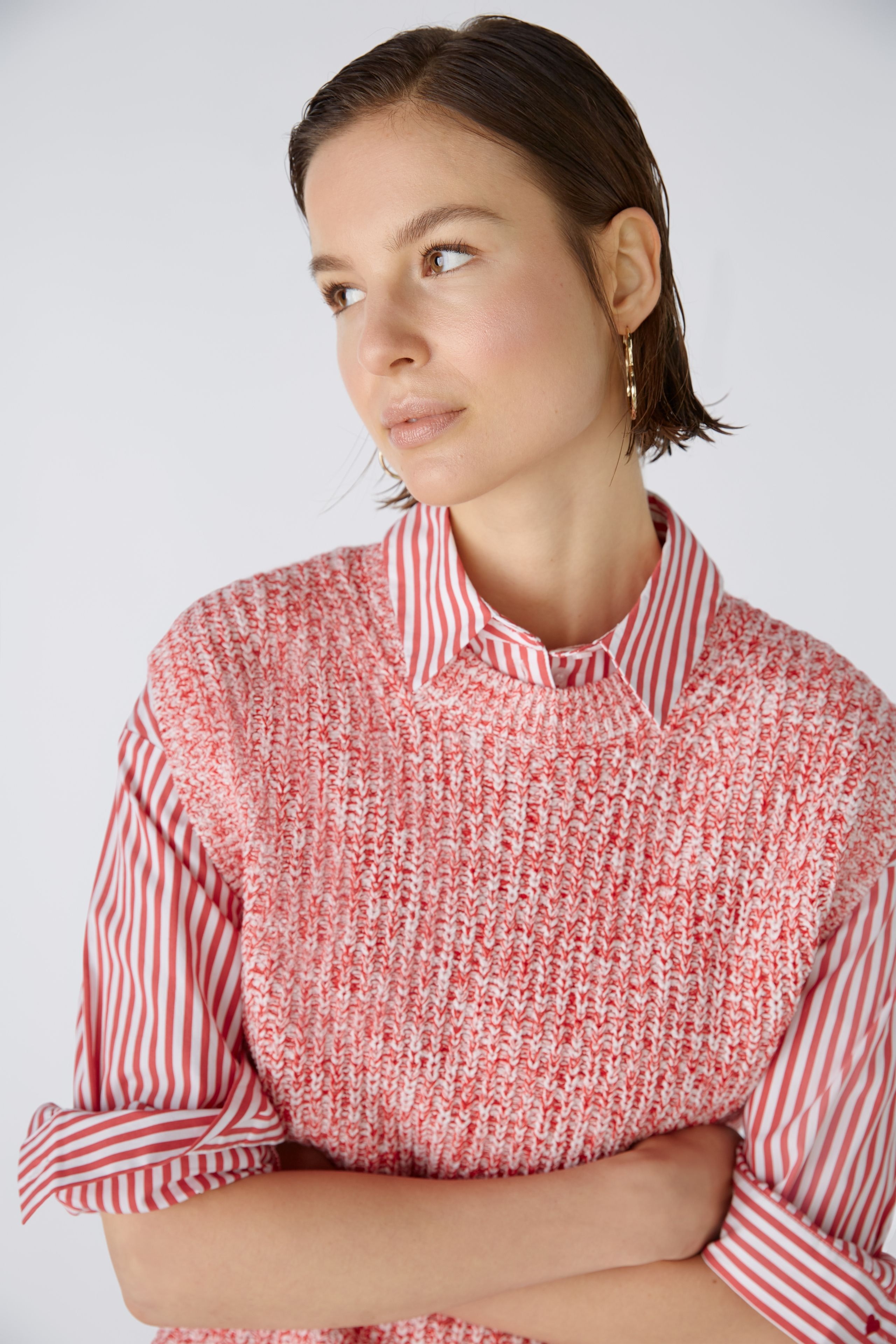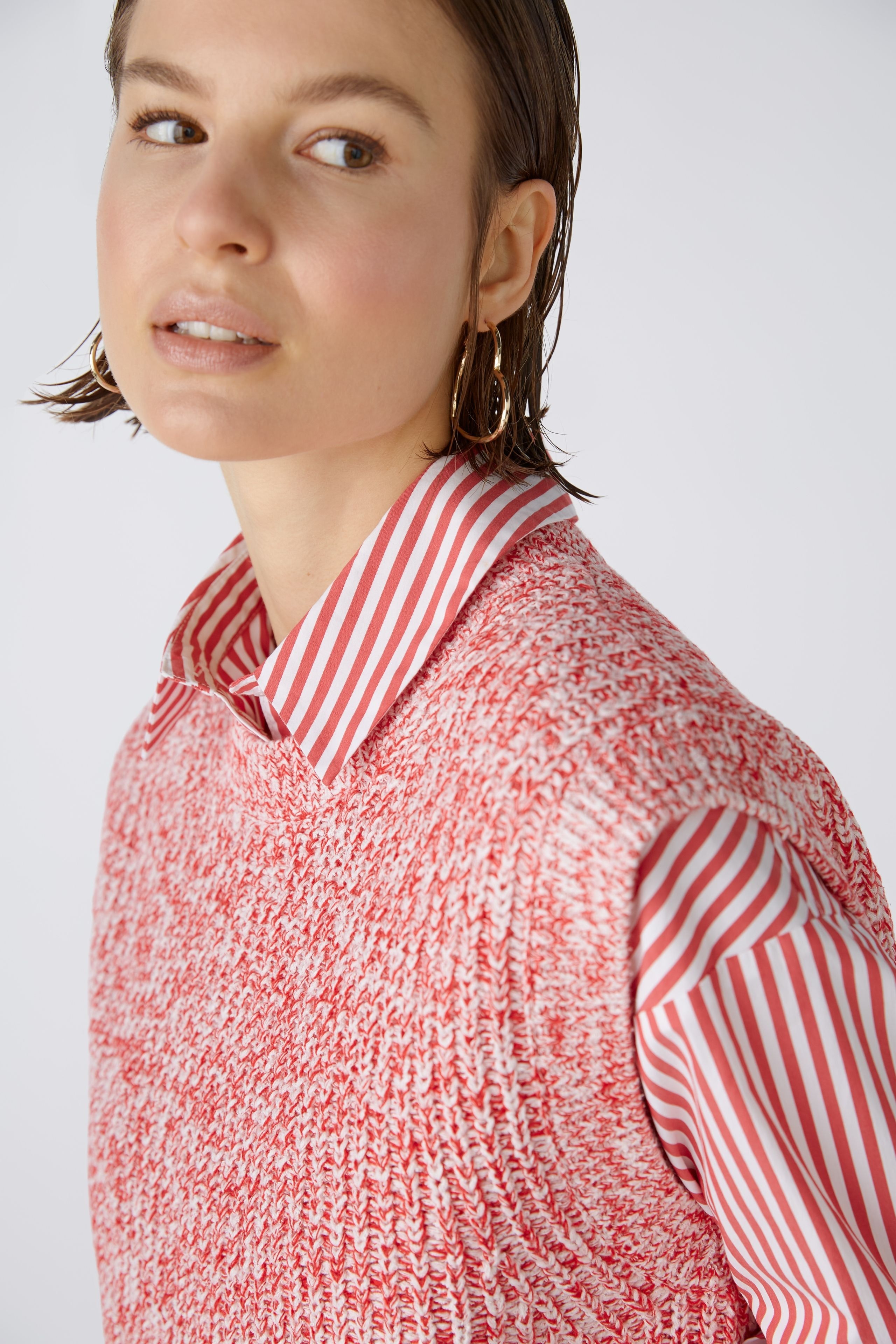 Мягкая резинка из смесового хлопка, связанная спицами из смеси пряжи Oui Iconic. Прямой крой, немного укороченный. Круглый вырез горловины с ребристой отделкой. Прямой низ, без манжет, идеально подходит для многослойной одежды. Oui Iconic смесь пряжи: разные виды пряжи, каждая разного цвета и качества, объединены по дизайну для каждого цветового варианта, в результате чего получается мягкая смесь хлопка с большой глубиной и особым эффектом. Длина для размера 42: 52 см.